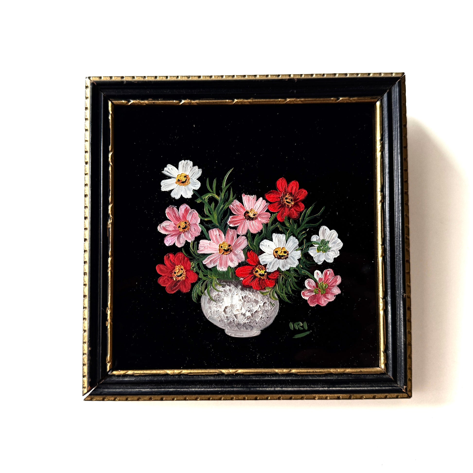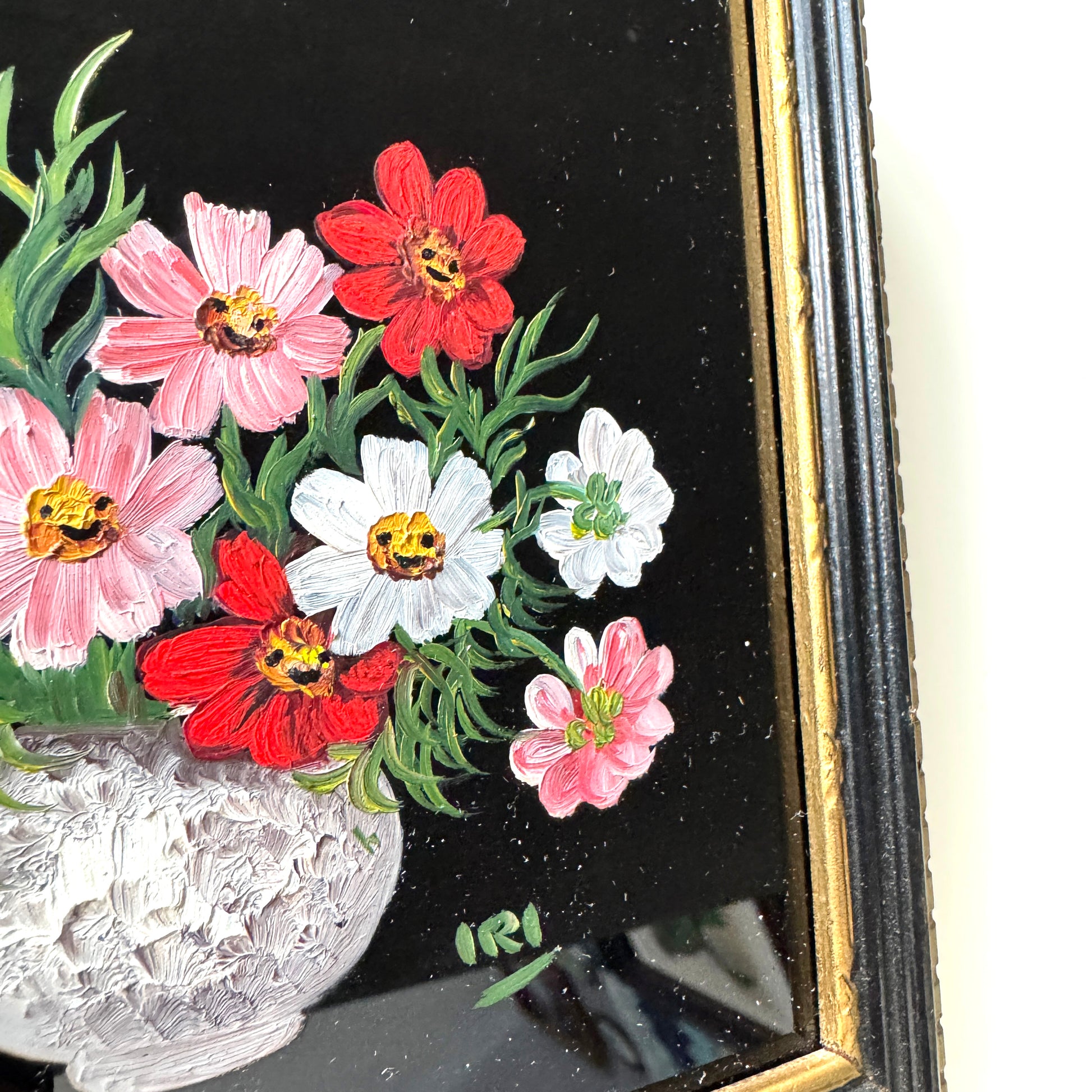 This vintage painting on glass was collected locally in Ontario. The frame was coming loose so it was reglued. The texture in the petals is pretty and catches the light nicely.