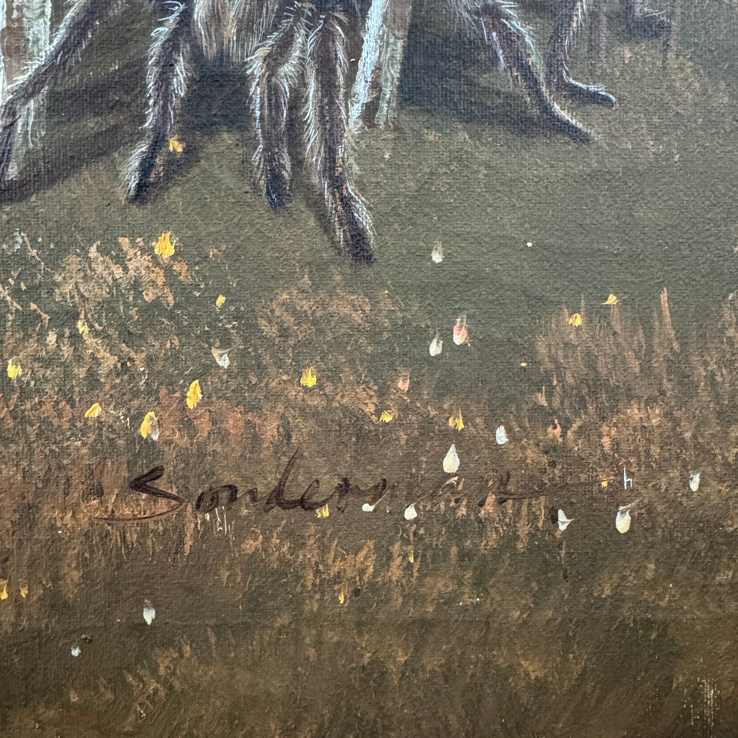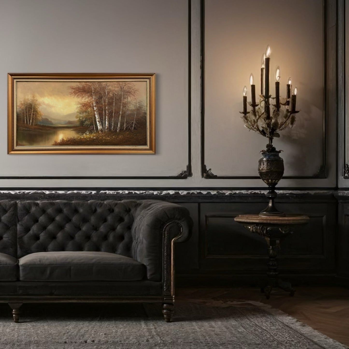 This vintage painting coincidentally matched another I had with similar colours and birch trees. They were by different artists, but they are a good example of a style becoming popular, and then EVERYONE was painting their landscapes with the same formula. In the first painting I have added in the school on the hill… and it looks really good beside this one on the wall, like the school grounds are expanding around you.