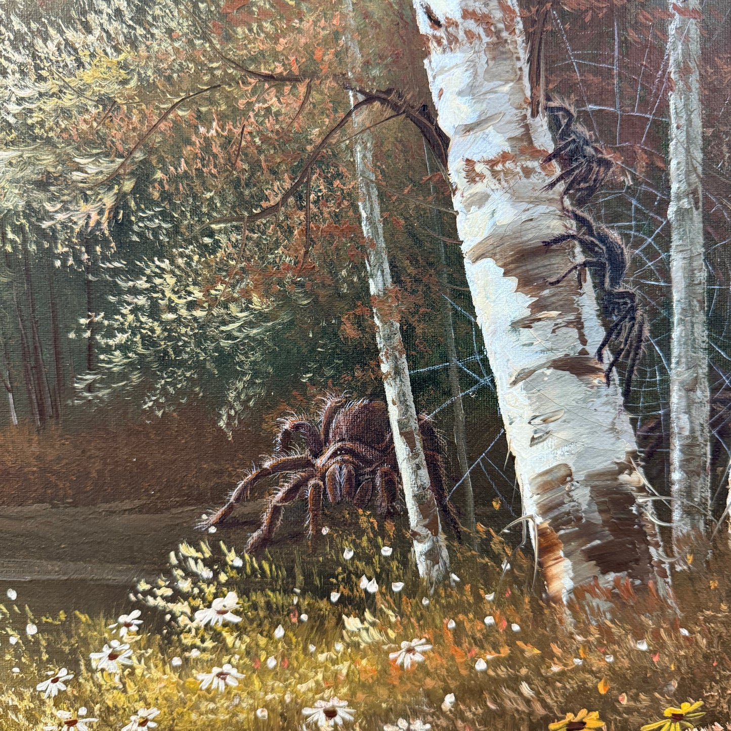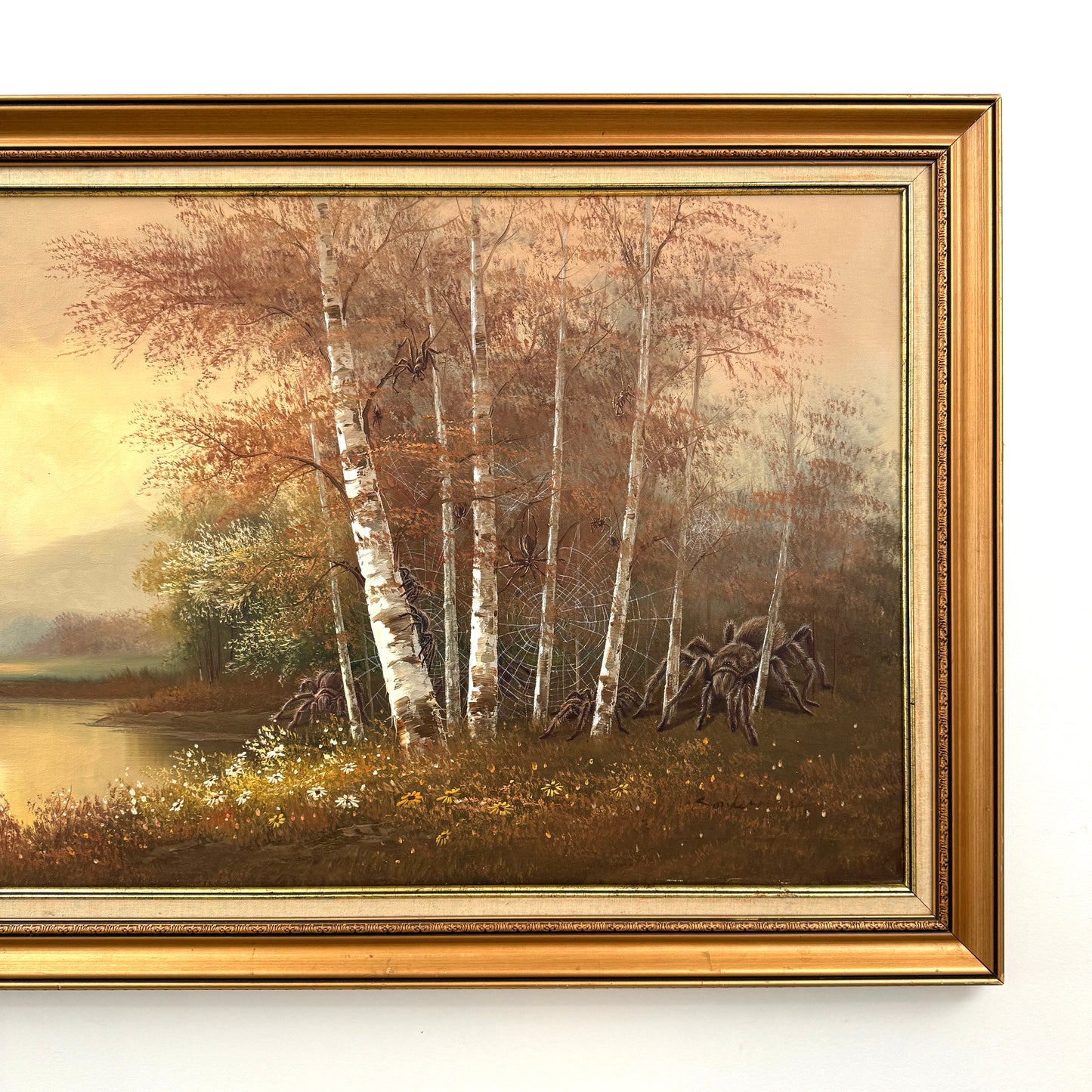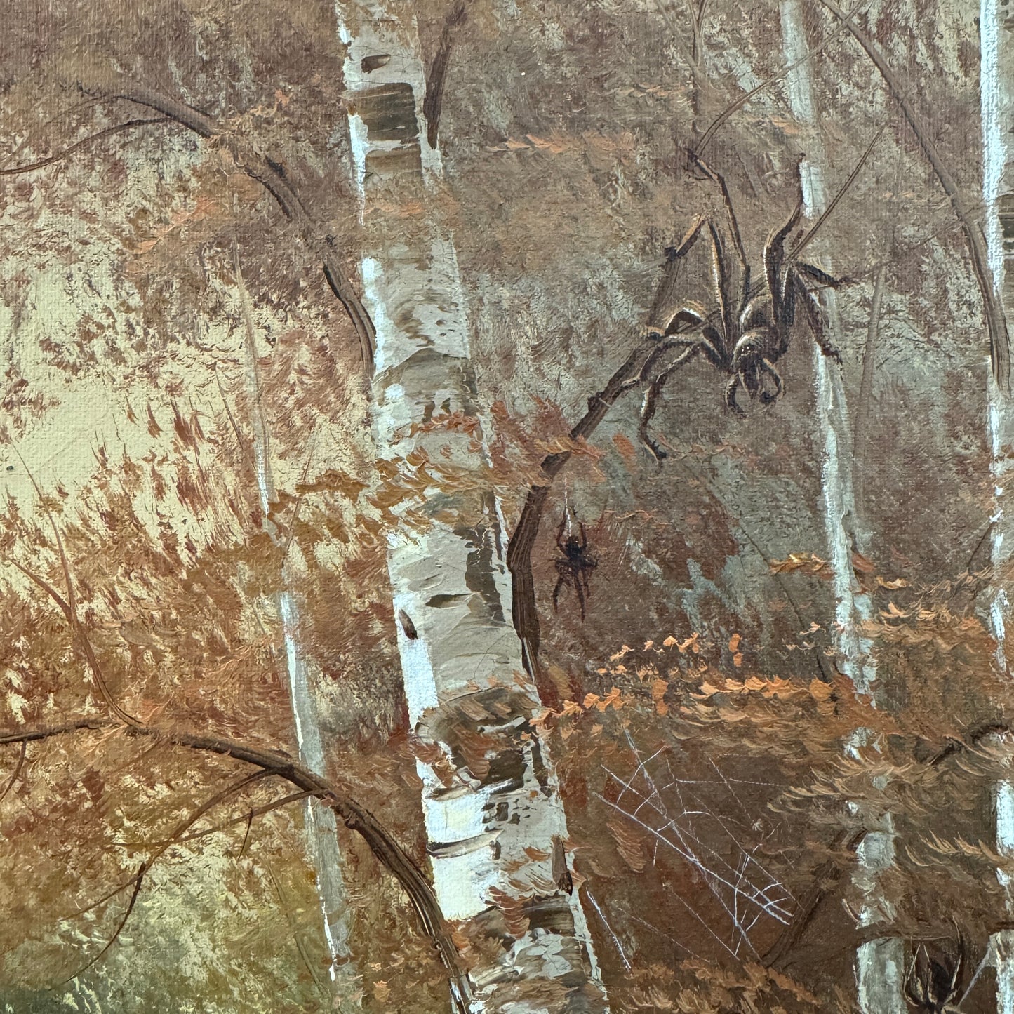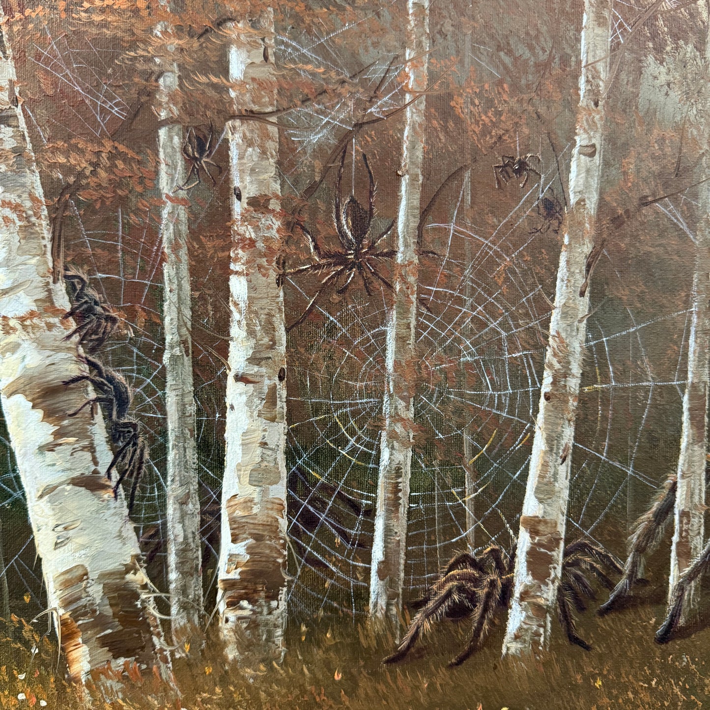 The inspiration for this came from the damage to the original vintage painting. Someone at some point had leaned on the painting in several places, creating radial crack patterns in the paint that reminded me of giant spider webs. With paint I accentuated those crack patterns to make them more obviously spider webs, and then enjoyed creeping myself out painting many spiders laying in wait for their next meal.