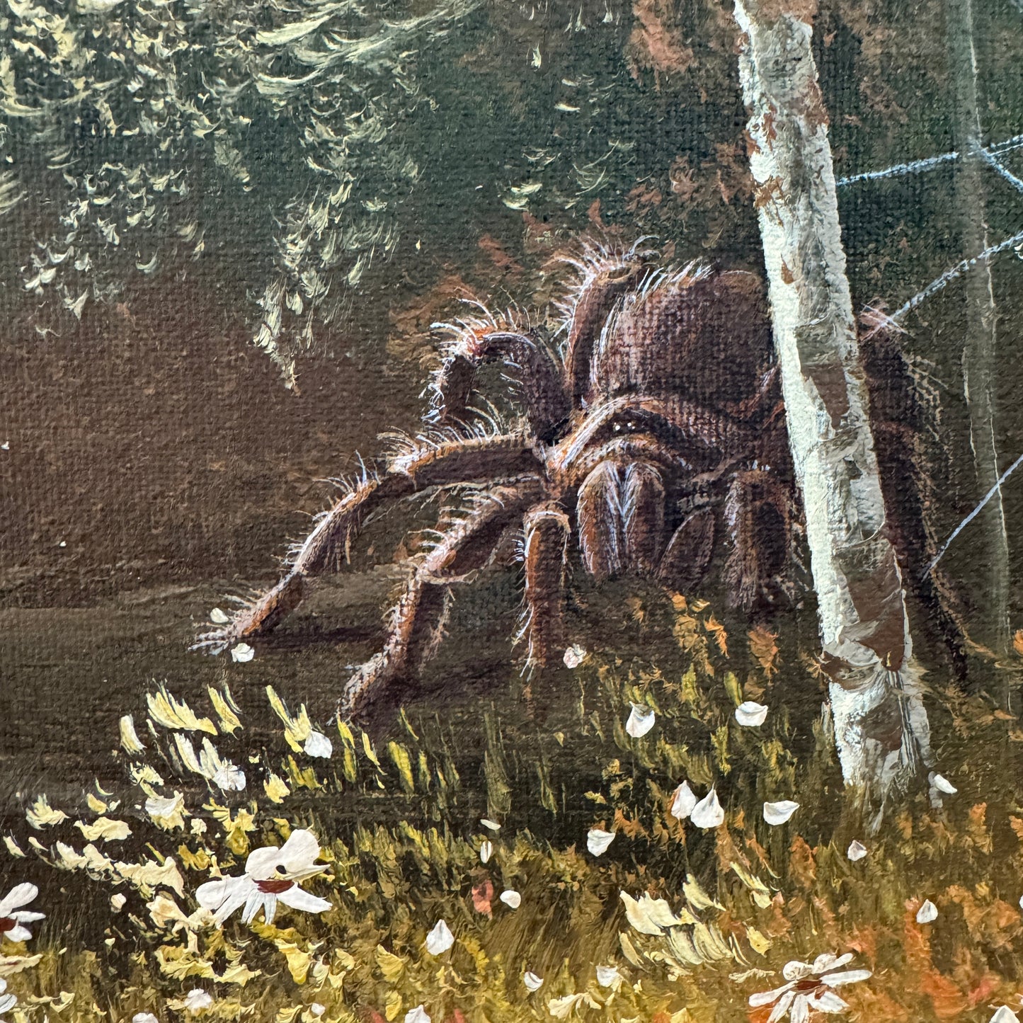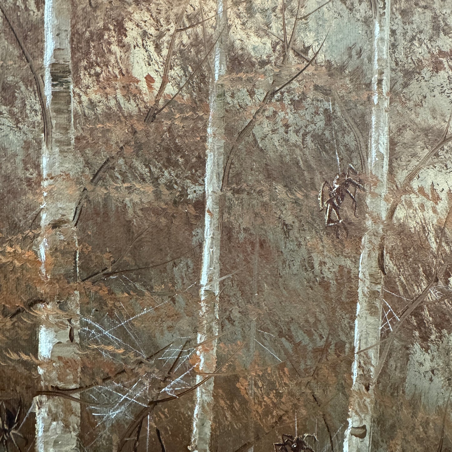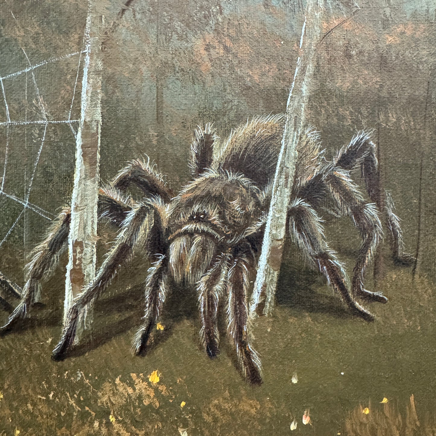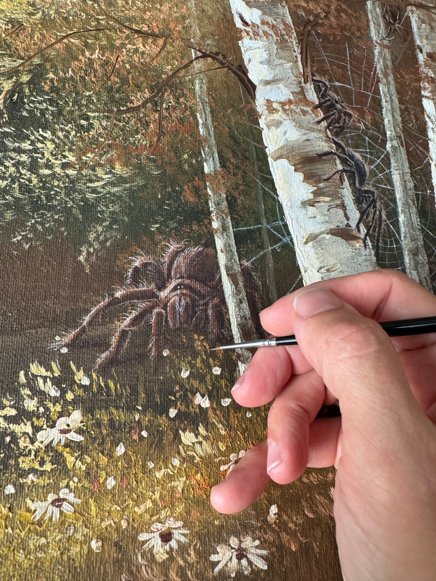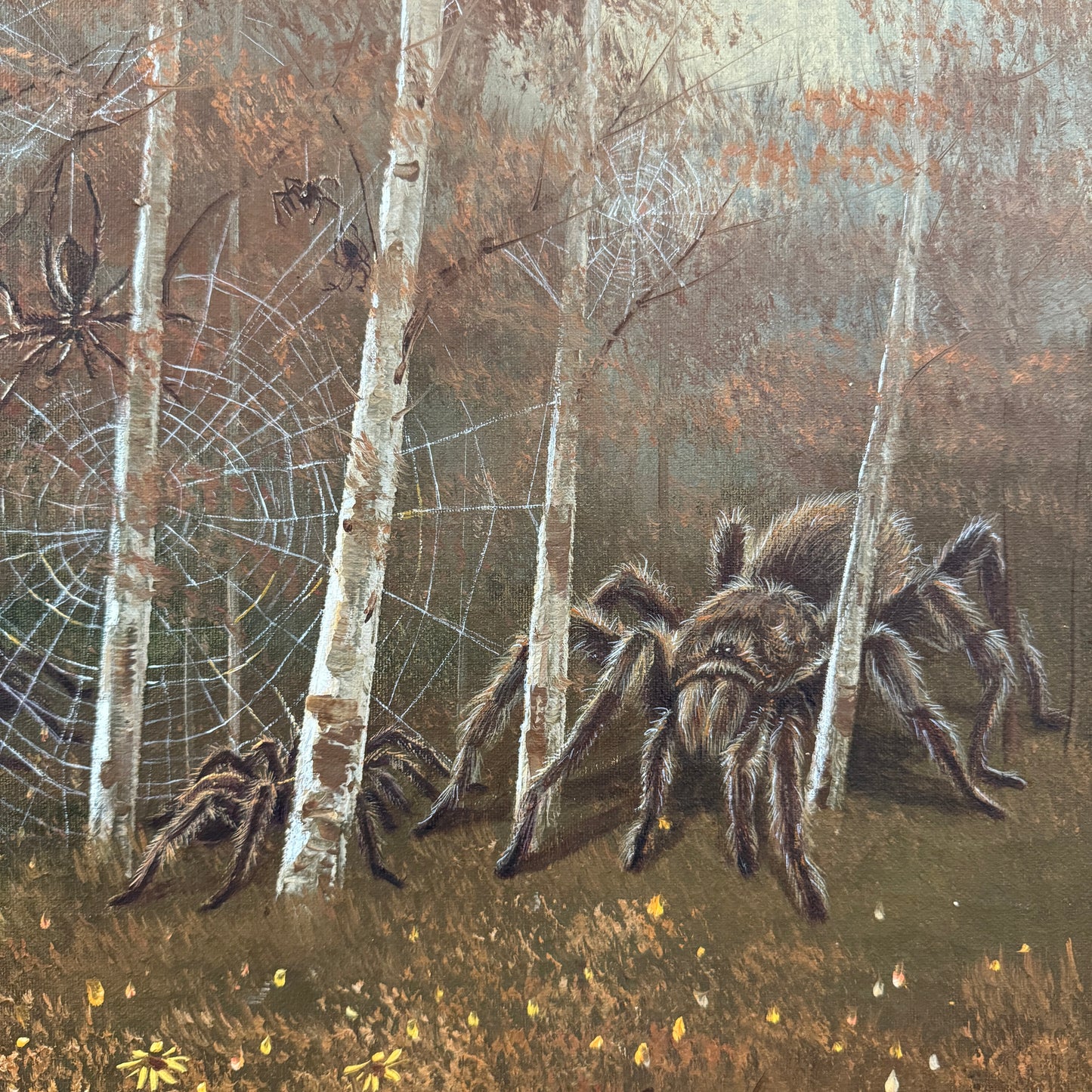 The inspiration for this came from the damage to the original vintage painting. Someone at some point had leaned on the painting in several places, creating radial crack patterns in the paint that reminded me of giant spider webs. With paint I accentuated those crack patterns to make them more obviously spider webs, and then enjoyed creeping myself out painting many spiders laying in wait for their next meal.
