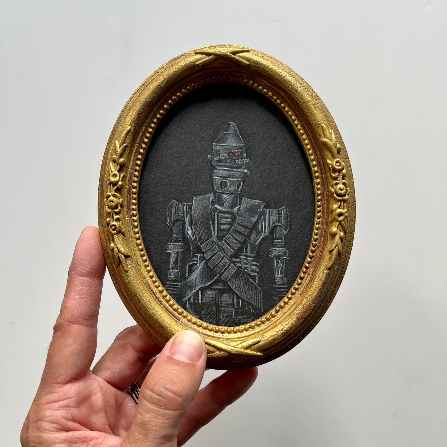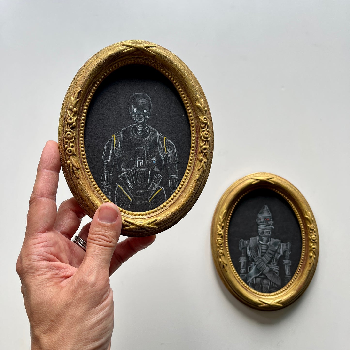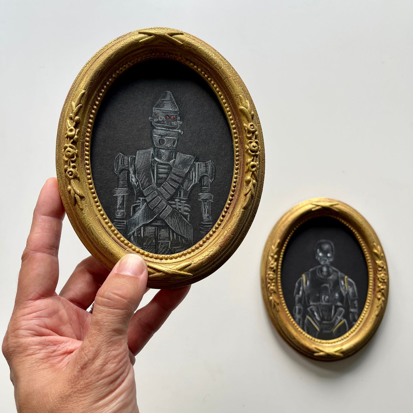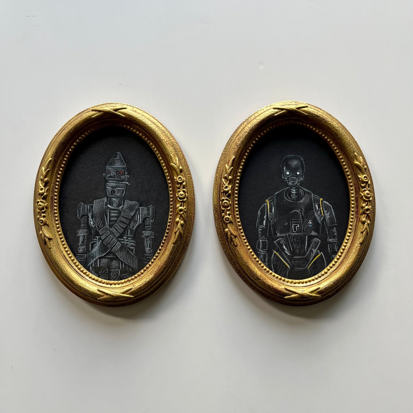 Portrait of a Droid : IG-11 and K-2SO, pencil drawing on antique paper, in vintage frame