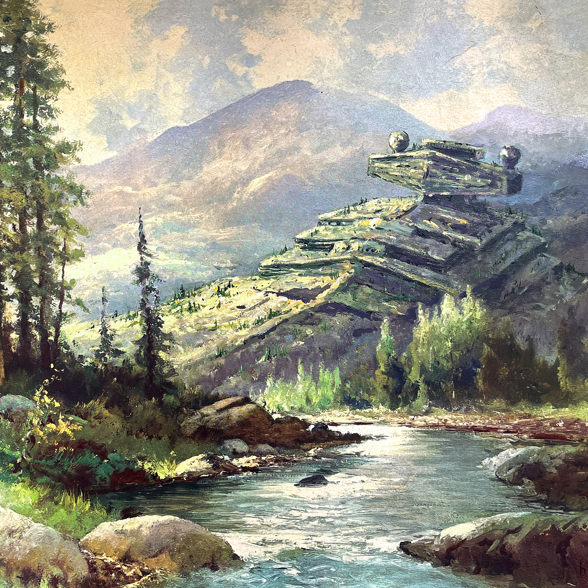A long time ago, in a galaxy far, far away, a star destroyer crashed on a planet. Over time the forest overtook it, and it became part of the mountain scape. Perhaps that planet was ours, and years later an artist painted the mountain that fell from the sky.