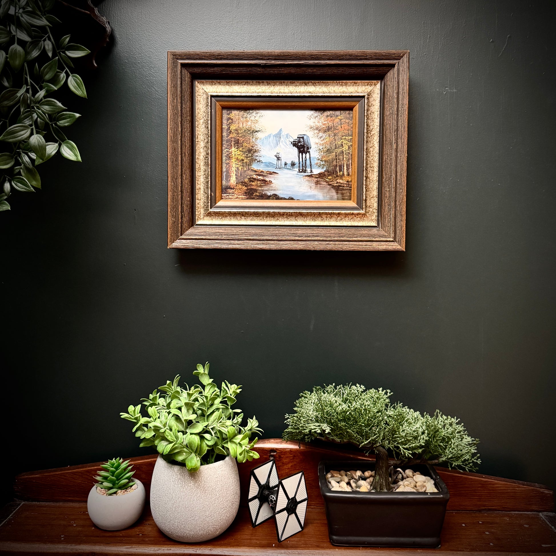 This vintage painting was in rough shape as it was very dirty and had been attached incorrectly to the frame, which was also very worn from rough storage. So the art was given a good clean. The frame was repainted and repaired, giving it a modern look and new hardware for displaying on the wall. Now that it has been repainted noble grey, the wood frame with its decorative gouges have a sort of mechanical feel to them, which ties in with the walkers themselves.