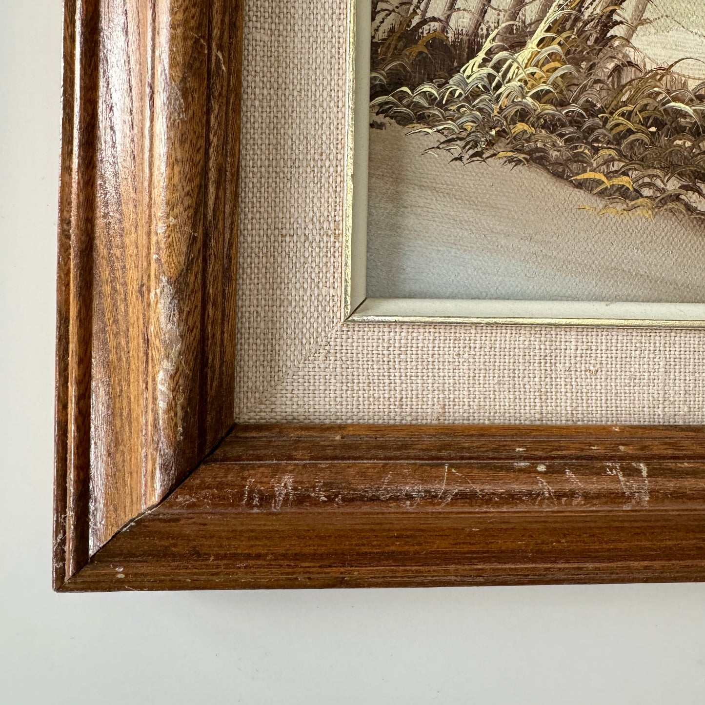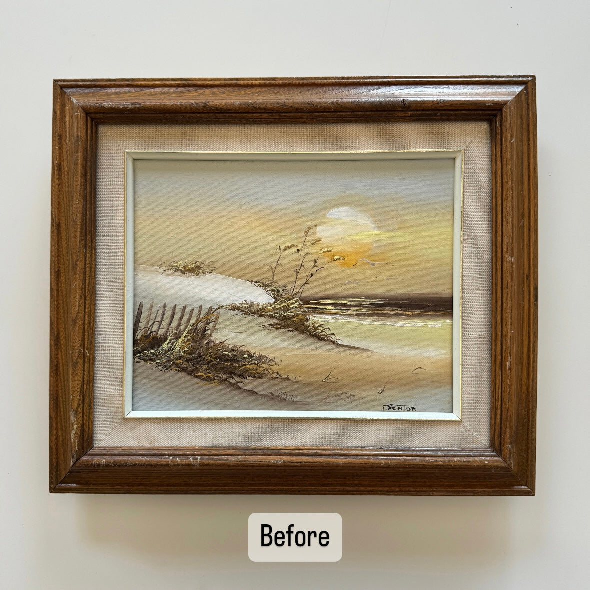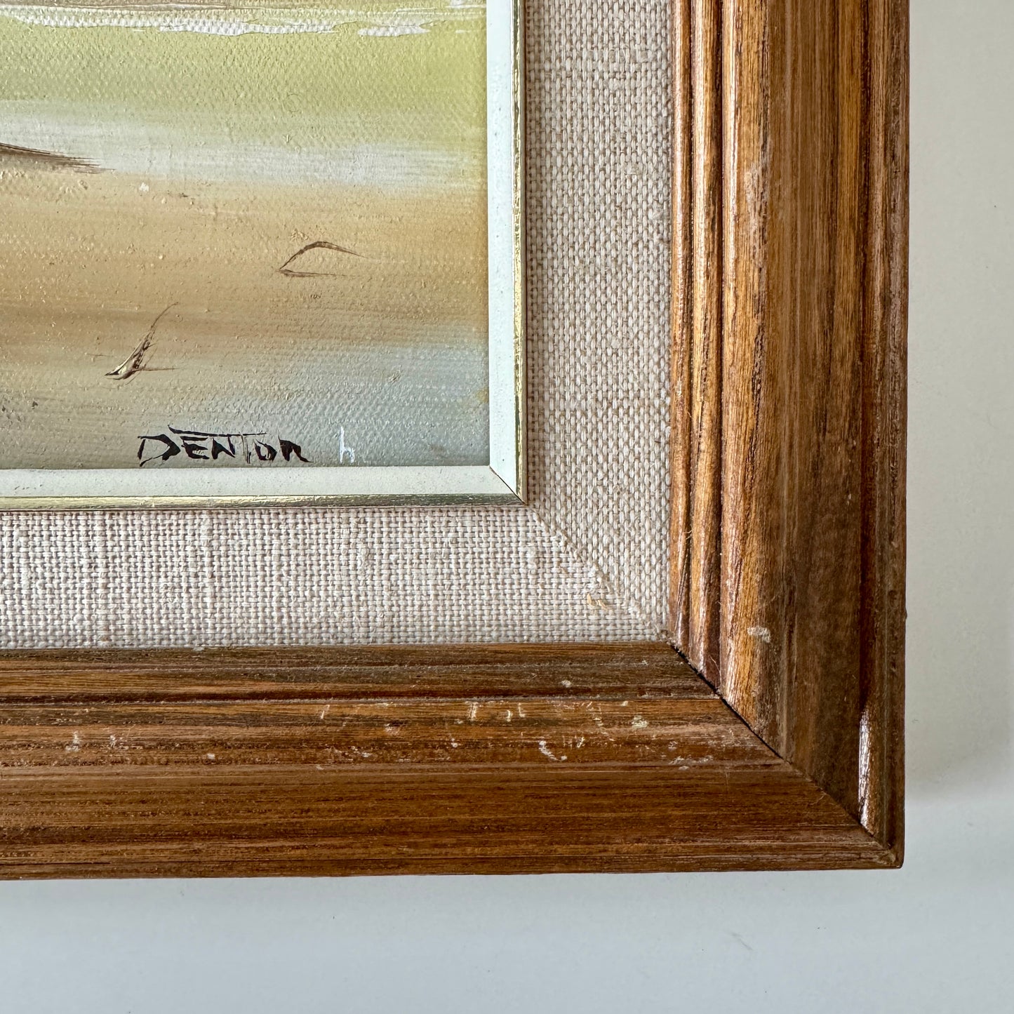 The original vintage painting signed Dentor was collected locally. It's an example of a common formula for this sort of beach oil painting (sand + weeds + sun + waves) and therefore has lost its value because there are so many the same. The frame is vintage but in sturdy condition, with some scuffing and damage to the wood which adds to the charm (see photos.) Wired and to display on the wall.