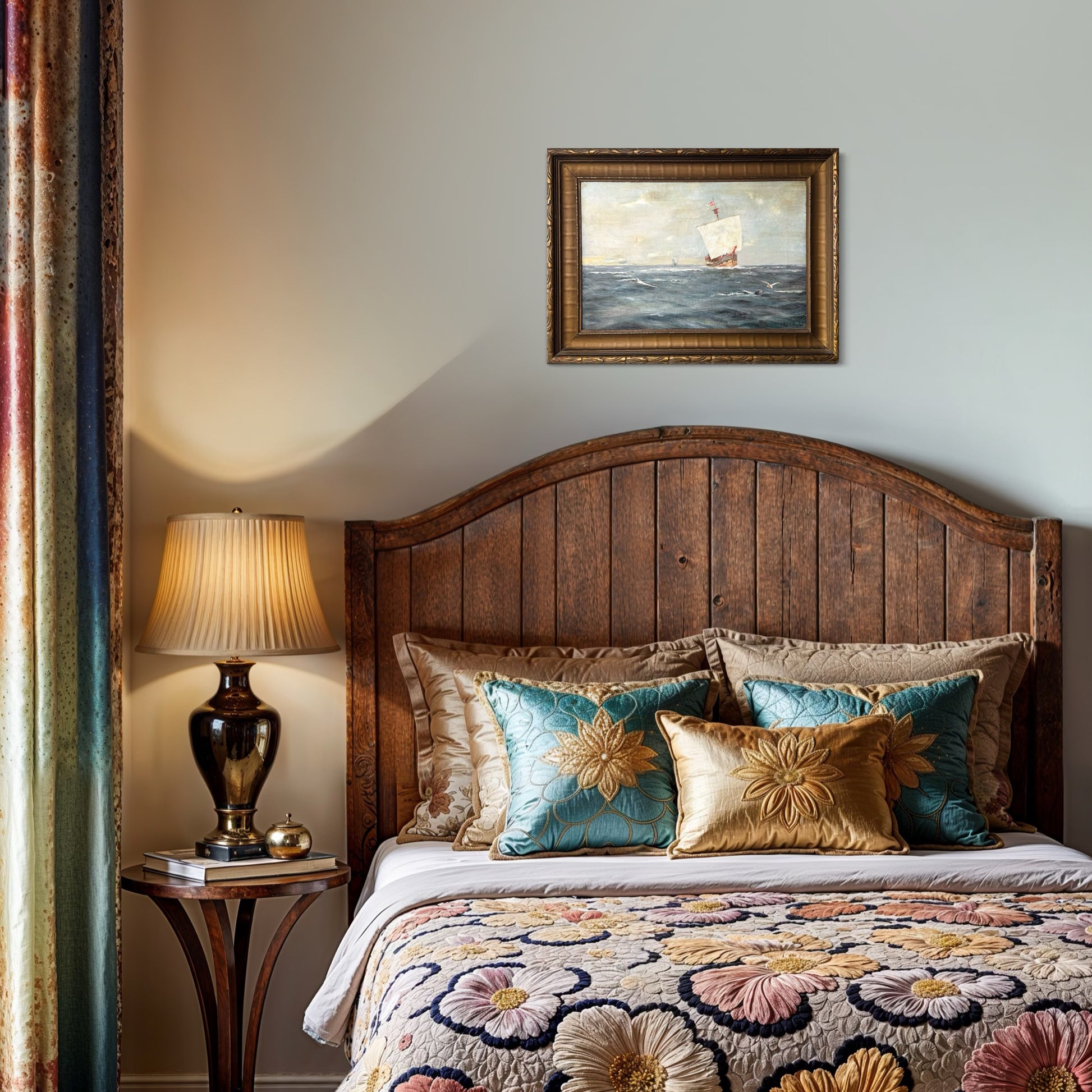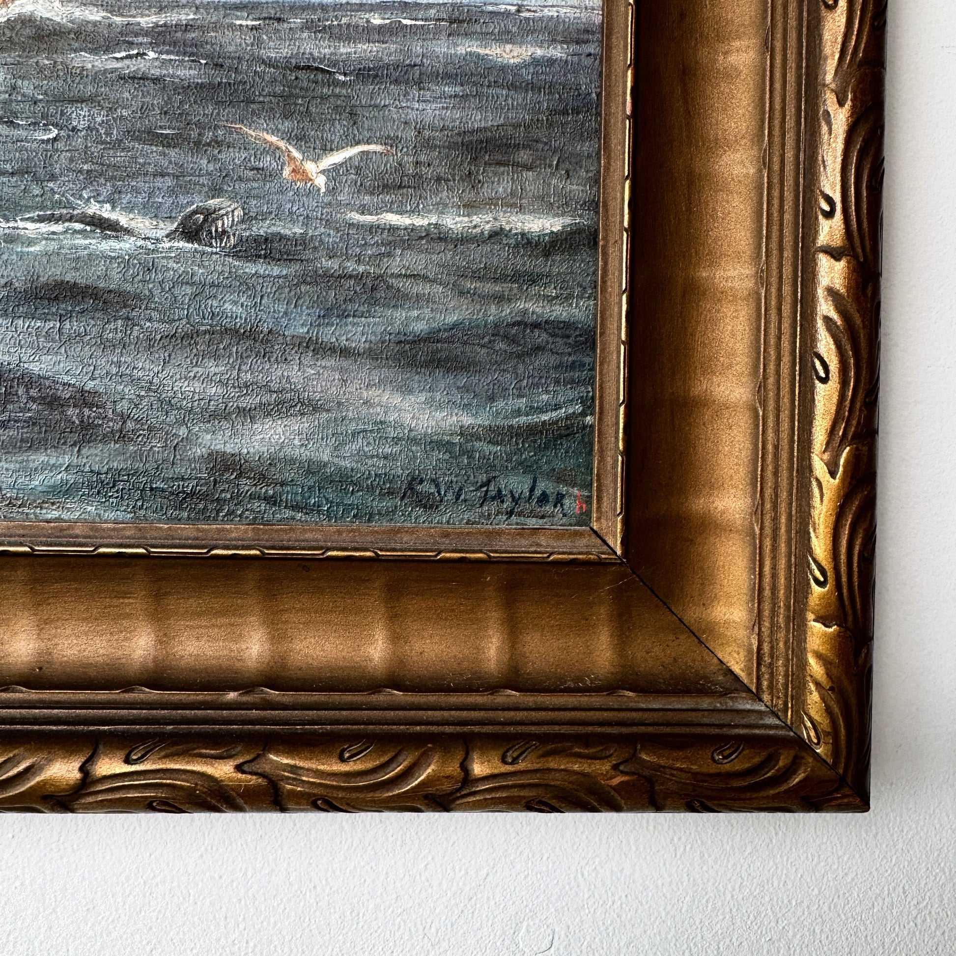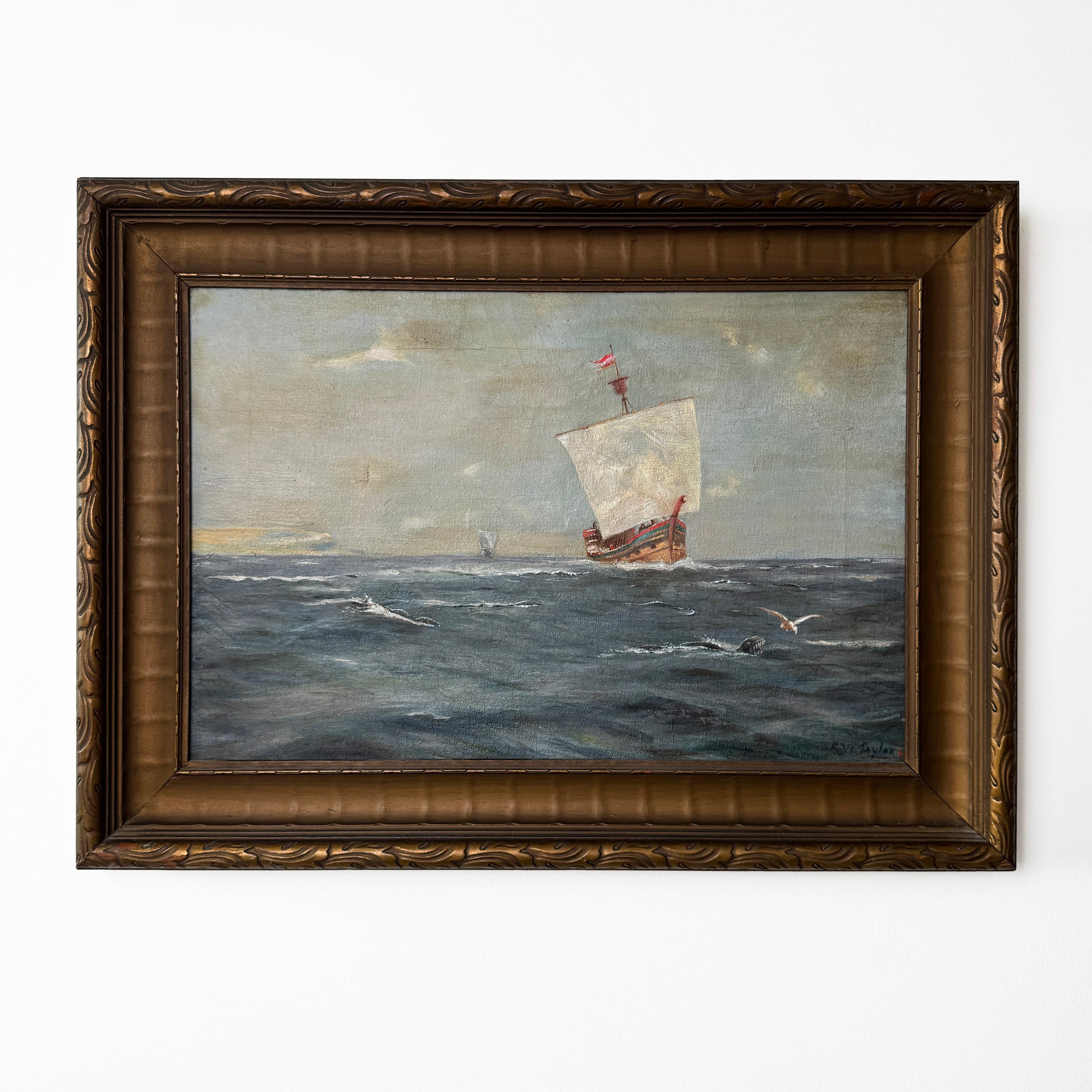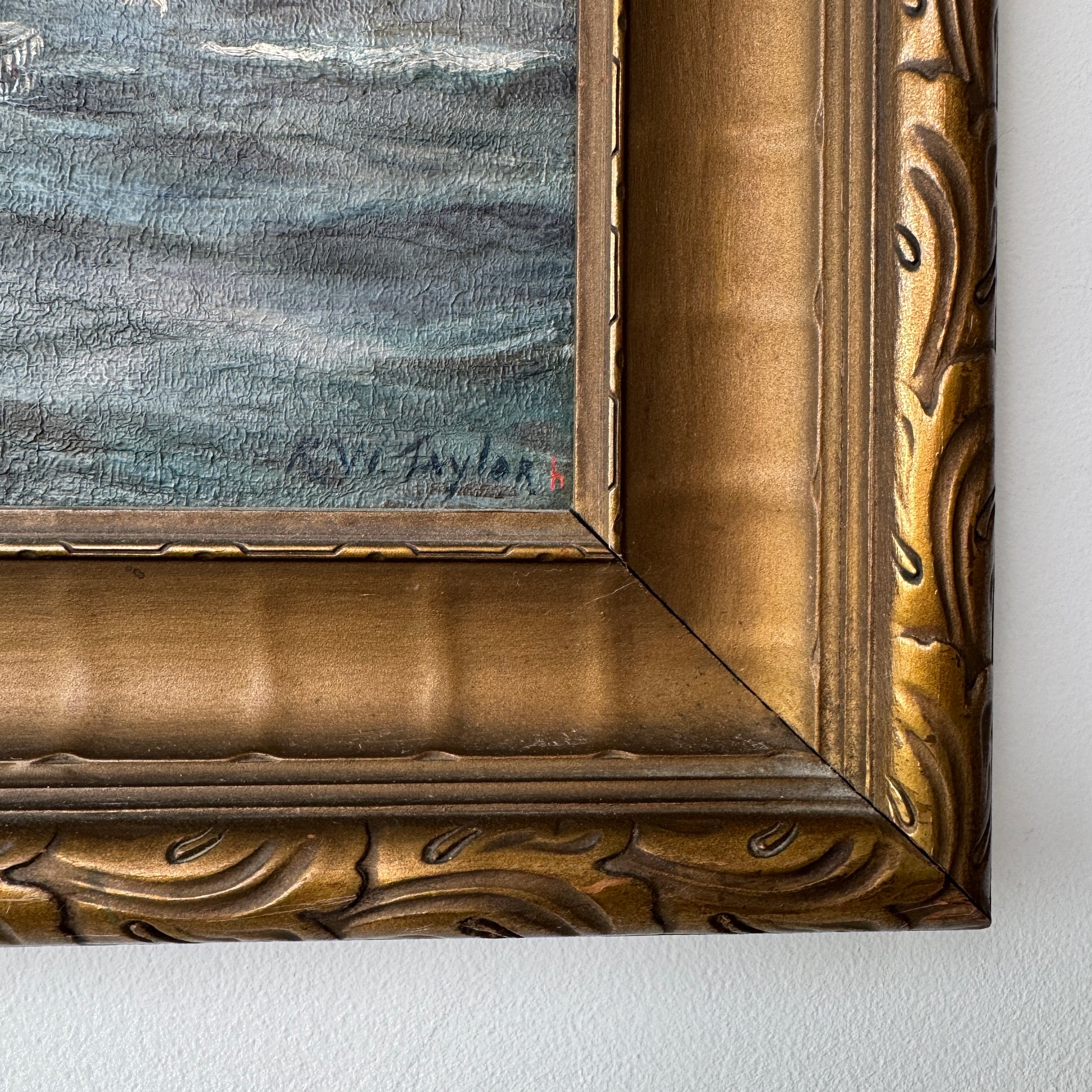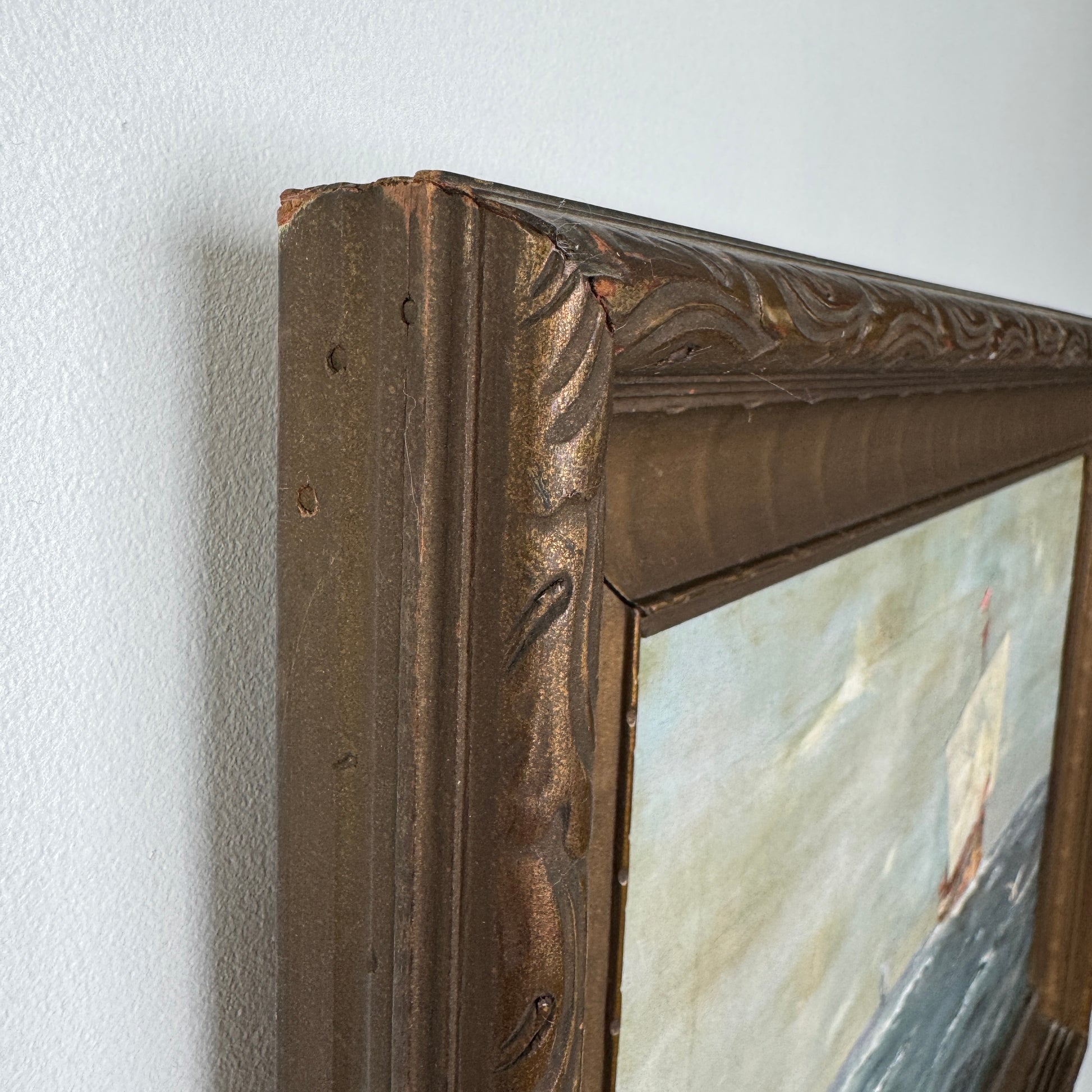 I collected this antique painting from its second owner here in Toronto. It had been imported years ago from Scotland. It was in very dirty condition, so I gave it a gentle clean to lift off the yellowing varnish, and was happy with the brighter sky and sails... but I couldn't get all the tarnish out of it (but I think this adds to the old fairytale look.) It had previously been repaired from a puncture which has been neatly fixed. The frame is very sturdy.
