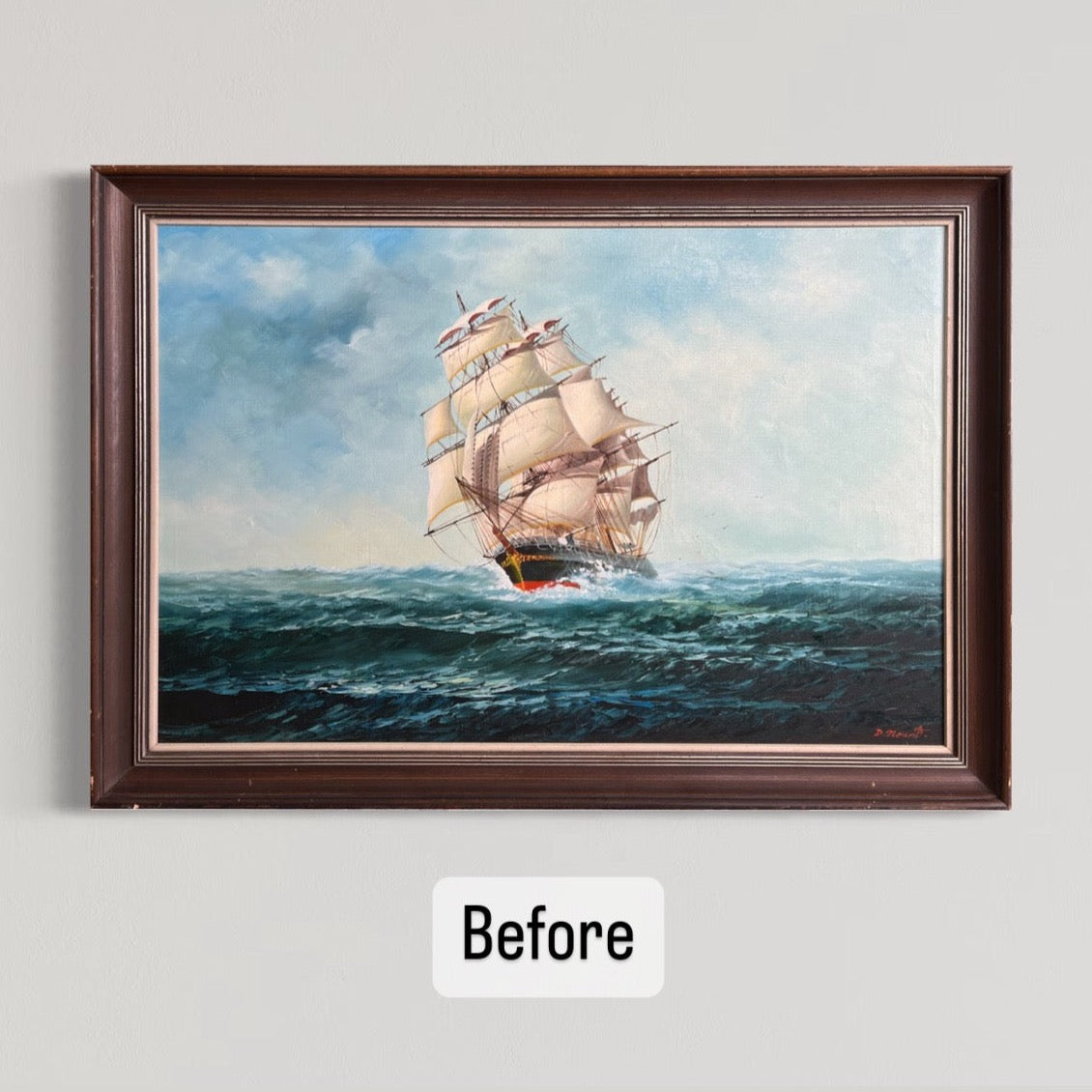 This vintage ship painting by D. Mount was originally purchased from The Art House in Toronto. I collected this painting from its original owner in the Simcoe area. The painting is in good condition, with minor fine cracking across the surface. The frame has been finely splattered with dark paint, but I think it adds character. The artist did a fantastic job of replicating this ship painting… though they forgot one mast, I had to add that in between the sails! There are a lot of amazing artists out there who enjoy replicating the masters, and this is a fantastic example of their mastery of the medium and attention to detail.