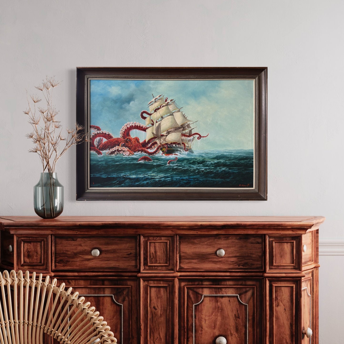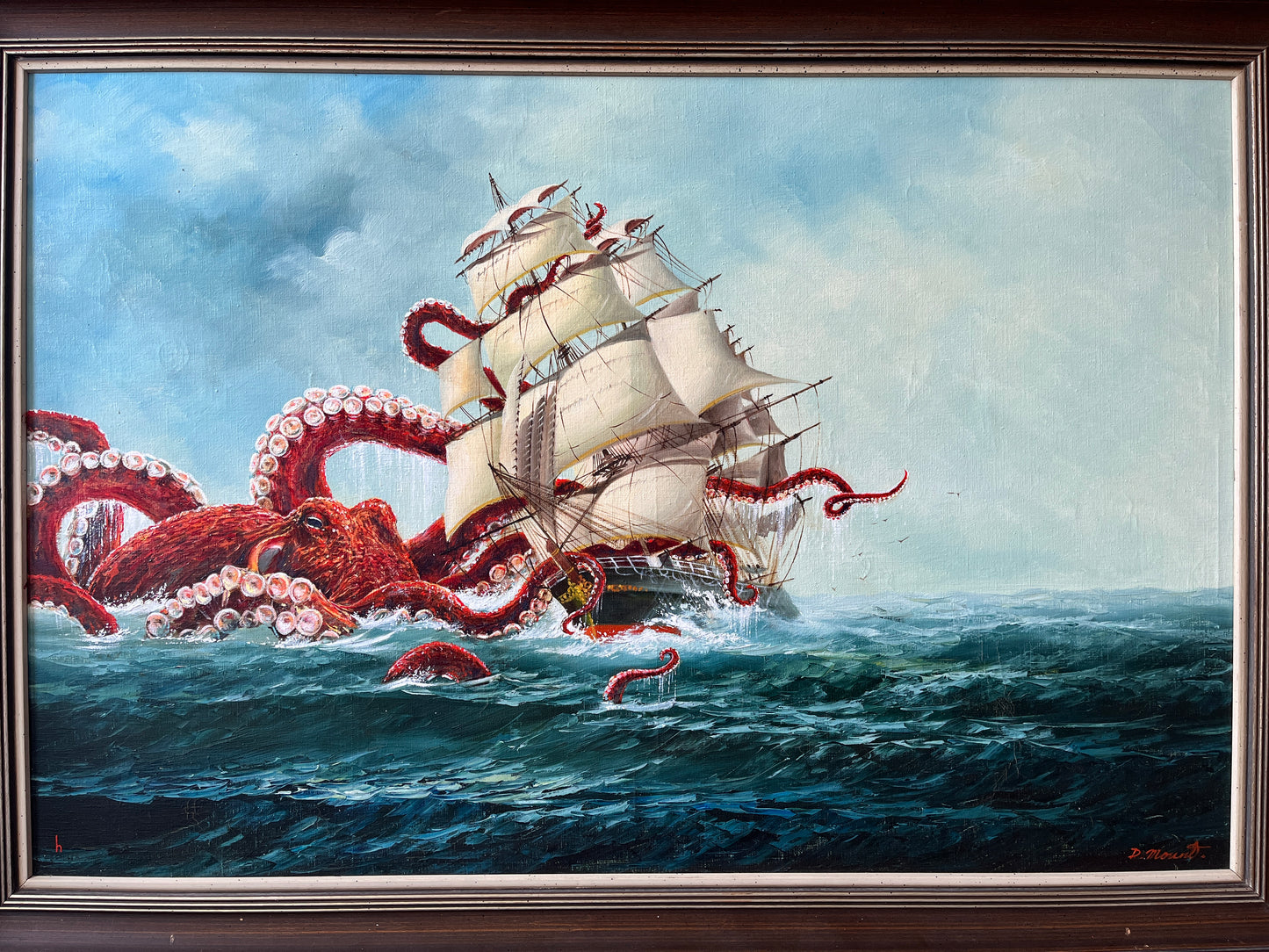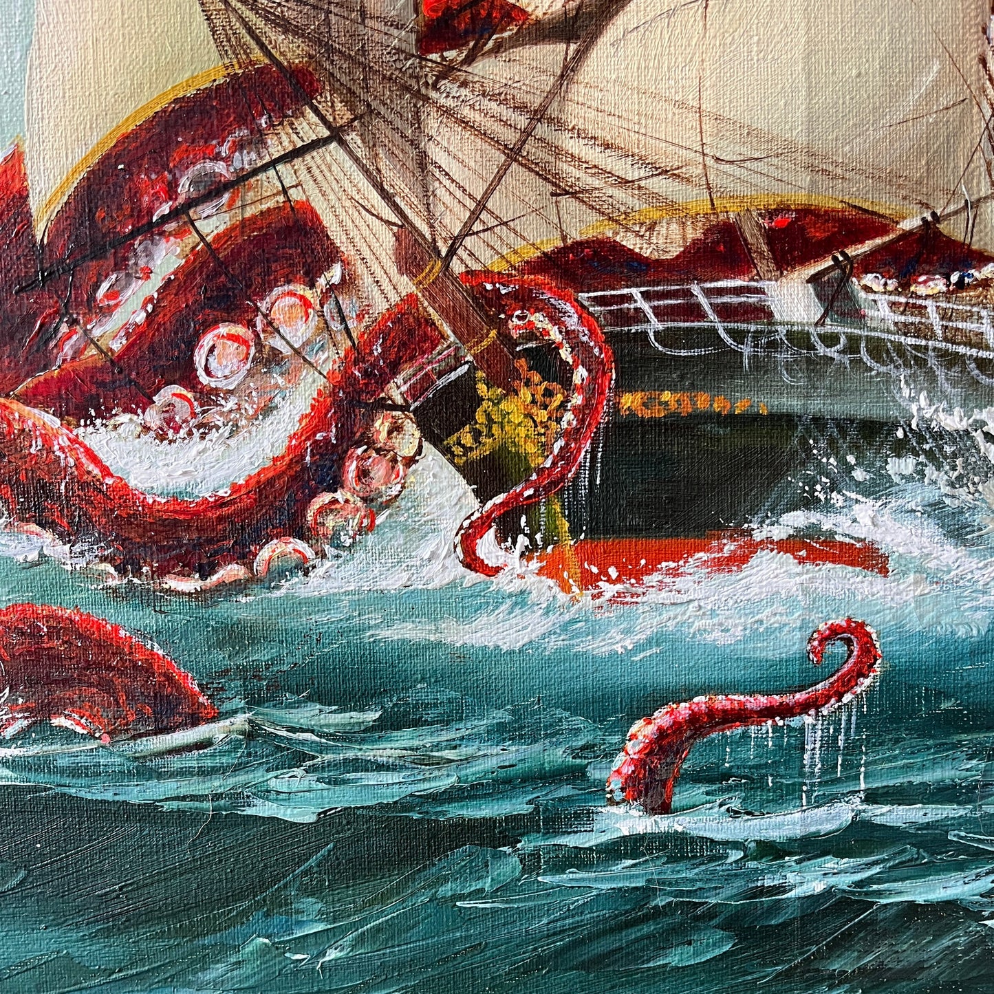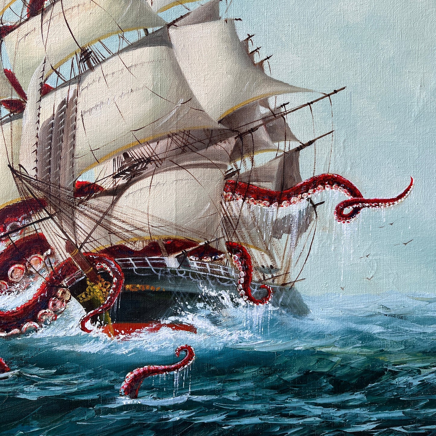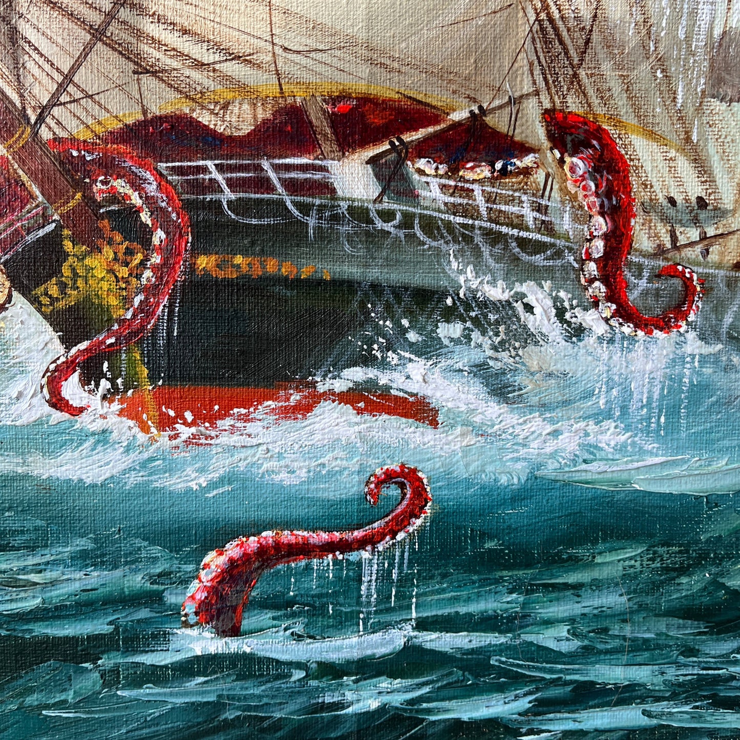 My “Octopus Vs Ship” series explores the idea that if octopus were enormous, they would have so much fun playing with passing ships! After all, octopus are curious, intelligent creatures. They have control over every suction cup on every tentacle, each with the ability to touch, taste and smell. I’m not sure the sailors on board the ship would appreciate that bit of trivia while their ship is being tossed around… but I find it fascinating!