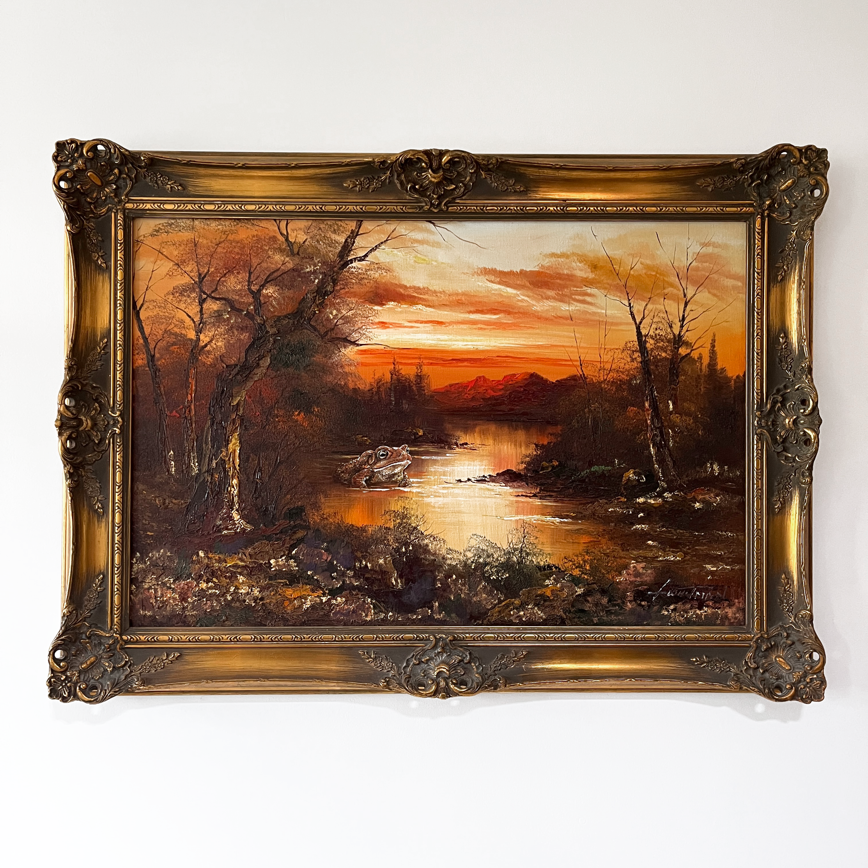 Vintage Painting by G. Witman, Michigan artist prolific in the 70’s with landscapes for sale in department stores. This textured, very brown style of landscape was very popular in the 70’s… but not so popular now! I gave this painting a bit of fun by adding an oversized toad having a soak enjoying the amber sunset.