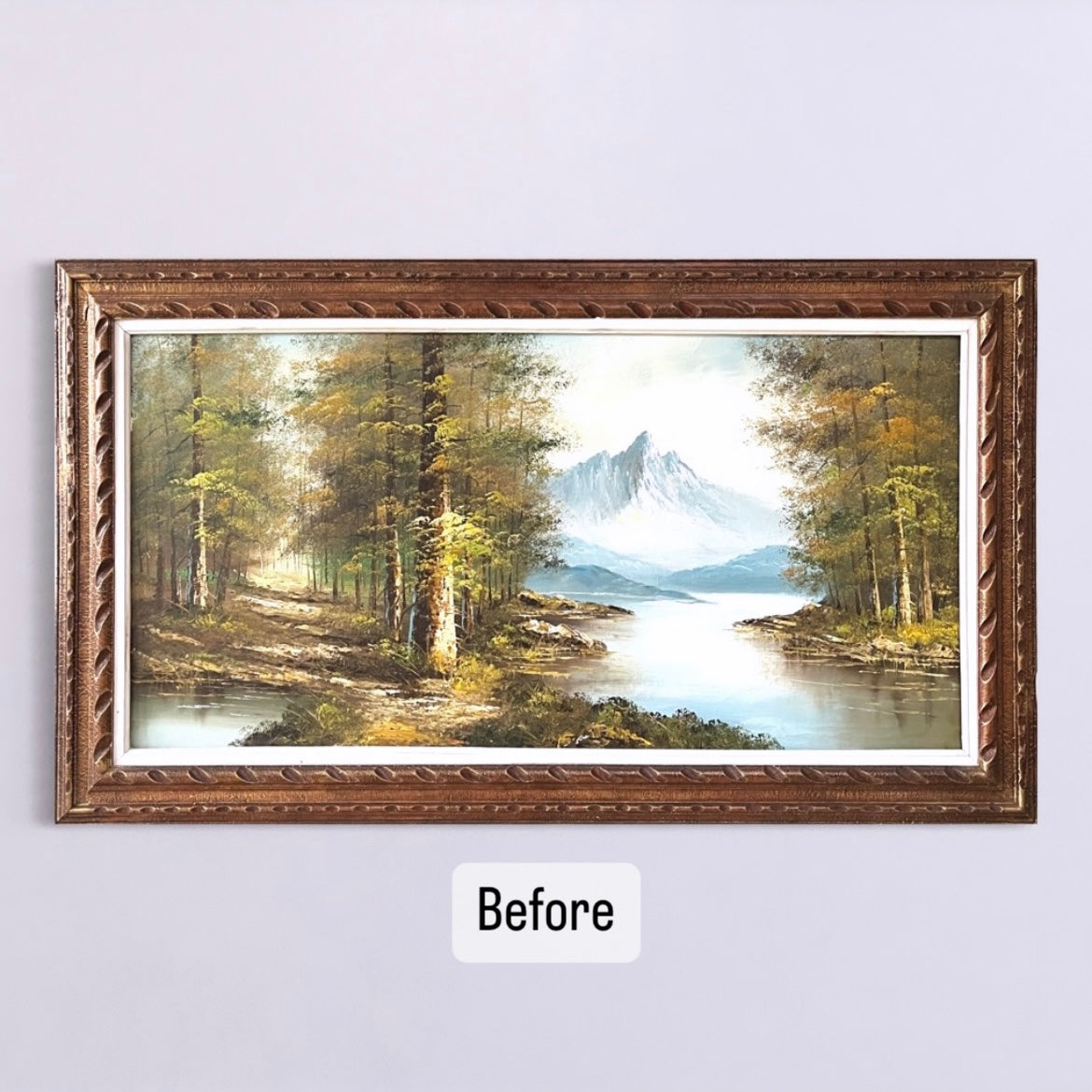 This vintage style painting is one of many mass produced original paintings to replicate the style of 70’s painting masters like Bob Ross. This composition formula of "textured mountain + river + trees" has been done so often, you may have even seen a painting almost exactly like this one before.
