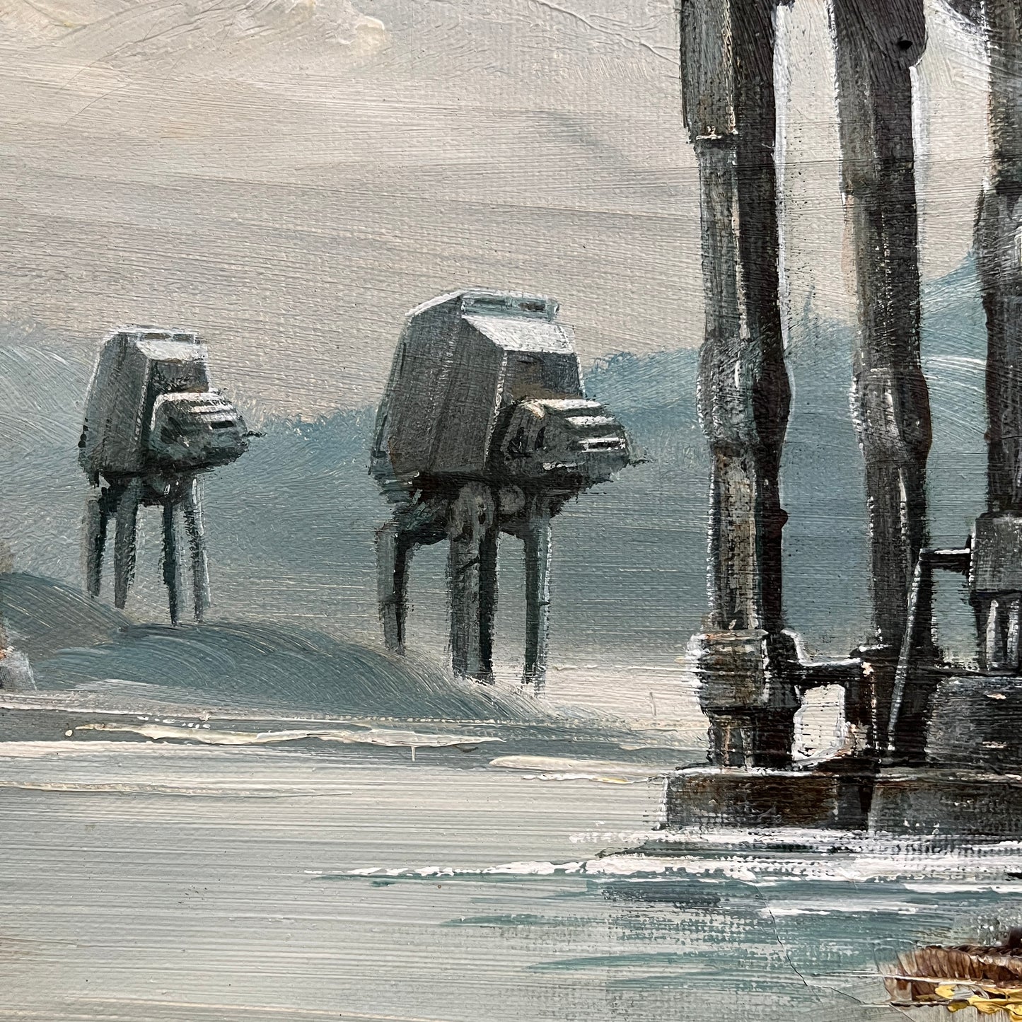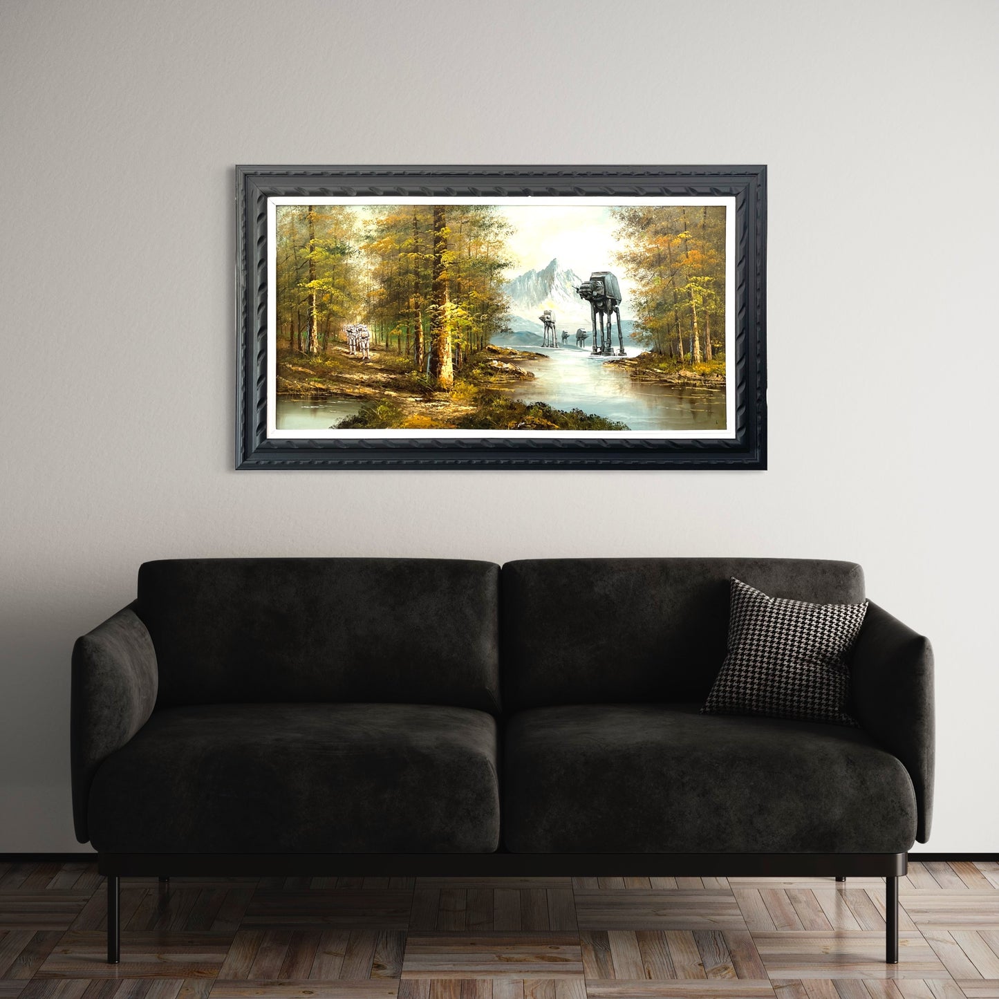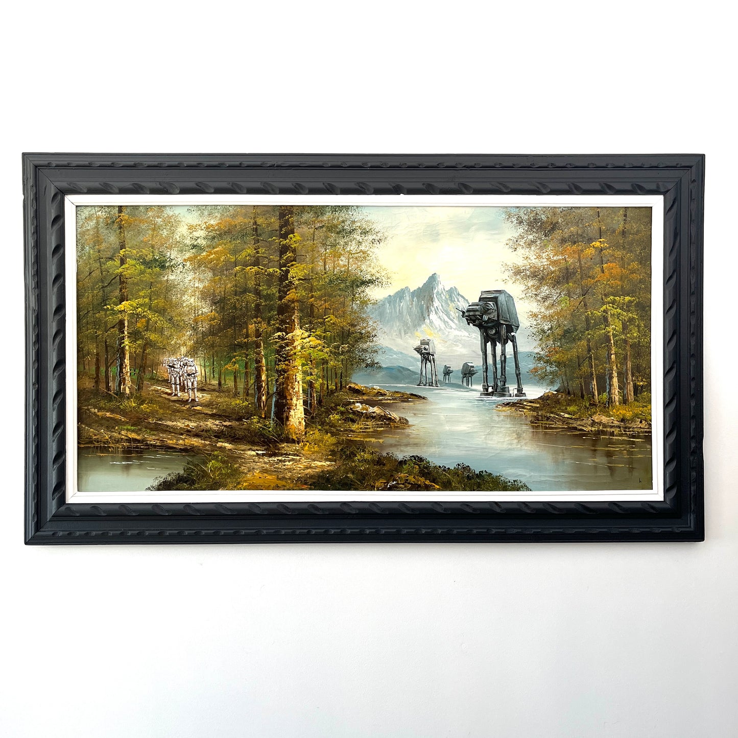 This vintage painting was in rough shape as it was very dirty and had been attached incorrectly to the frame, which was also very worn from rough storage. So the art was given a good clean. The frame was repainted and repaired, giving it a modern look and new hardware for displaying on the wall. Now that it has been repainted noble grey, the wood frame with its decorative gouges have a sort of mechanical feel to them, which ties in with the walkers themselves.