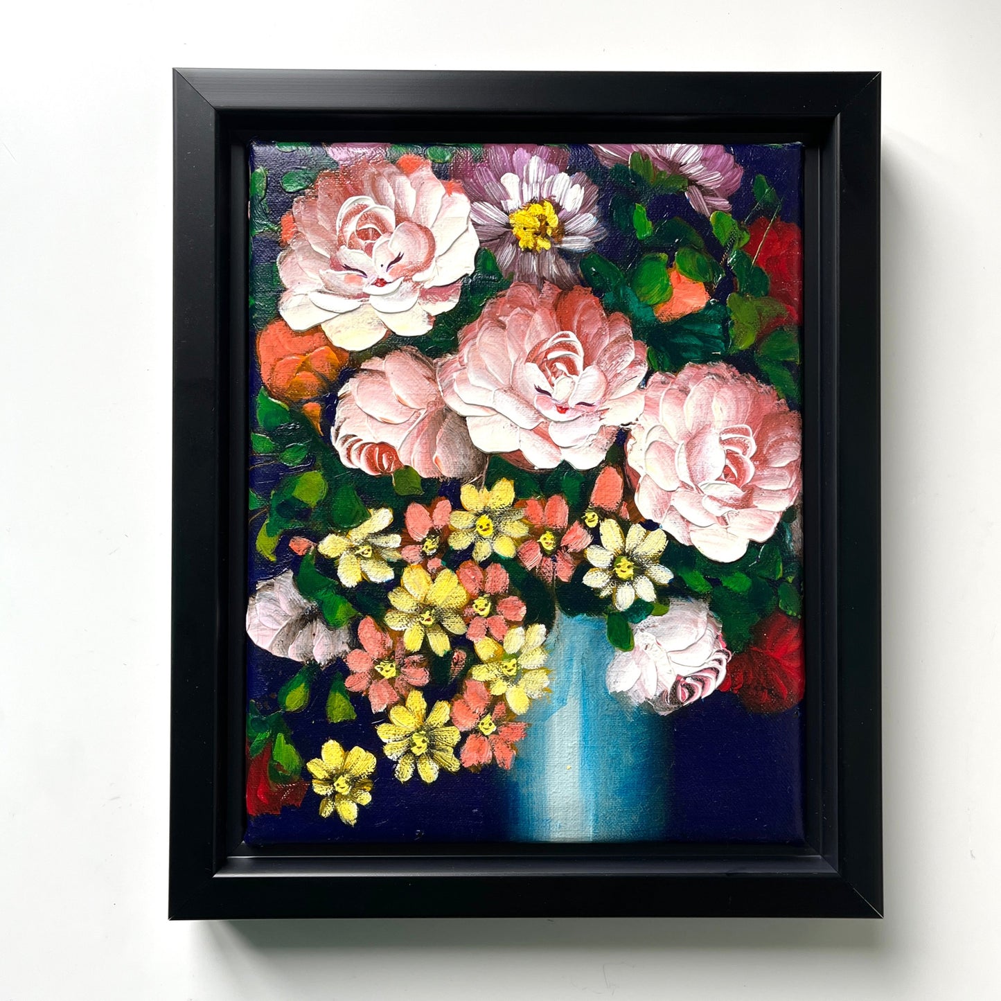 The style of these mid-century florals was very popular to the point that it began to be mass produced. Once an idea is mass produced, it loses its uniqueness and value… which is why paintings like these, which took time and effort to paint by hand, are being discarded. I really enjoy adding something fun to these vintage florals to make them unique again, and give them another chance to be appreciated.