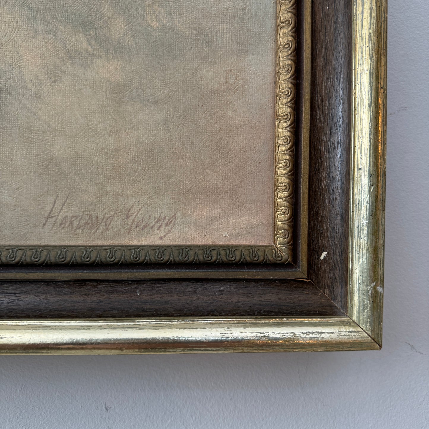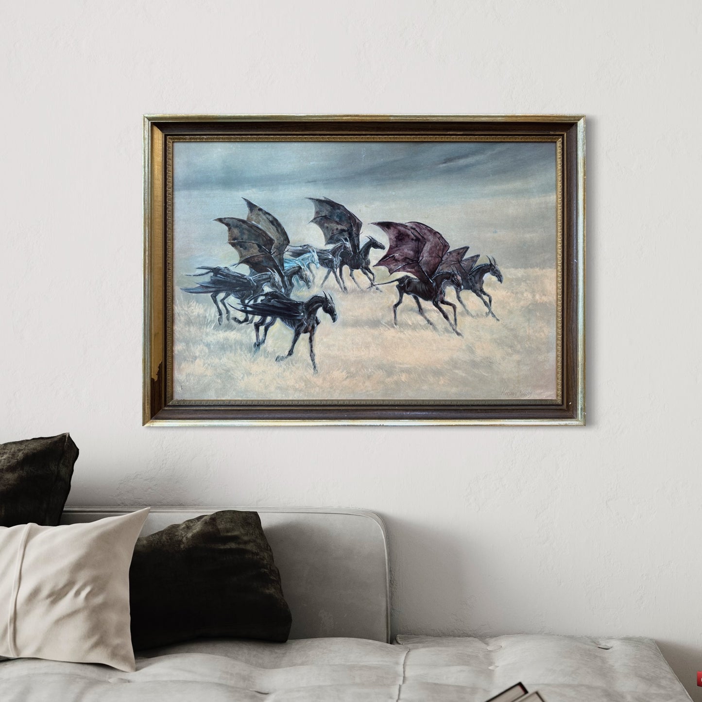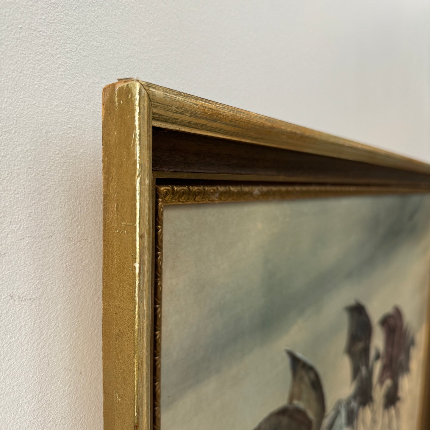 Frame : The original vintage frame is sturdy. Made of wood with some detailing on the inside trim. Some of the faux wood paneling has peeled off which I have left to add to the character and the feeling that the thestral painting was done a long time ago. (You can always peel off the wood panelling if you prefer the gold!) It has been rewired and is ready to display on the wall. It is not heavy.