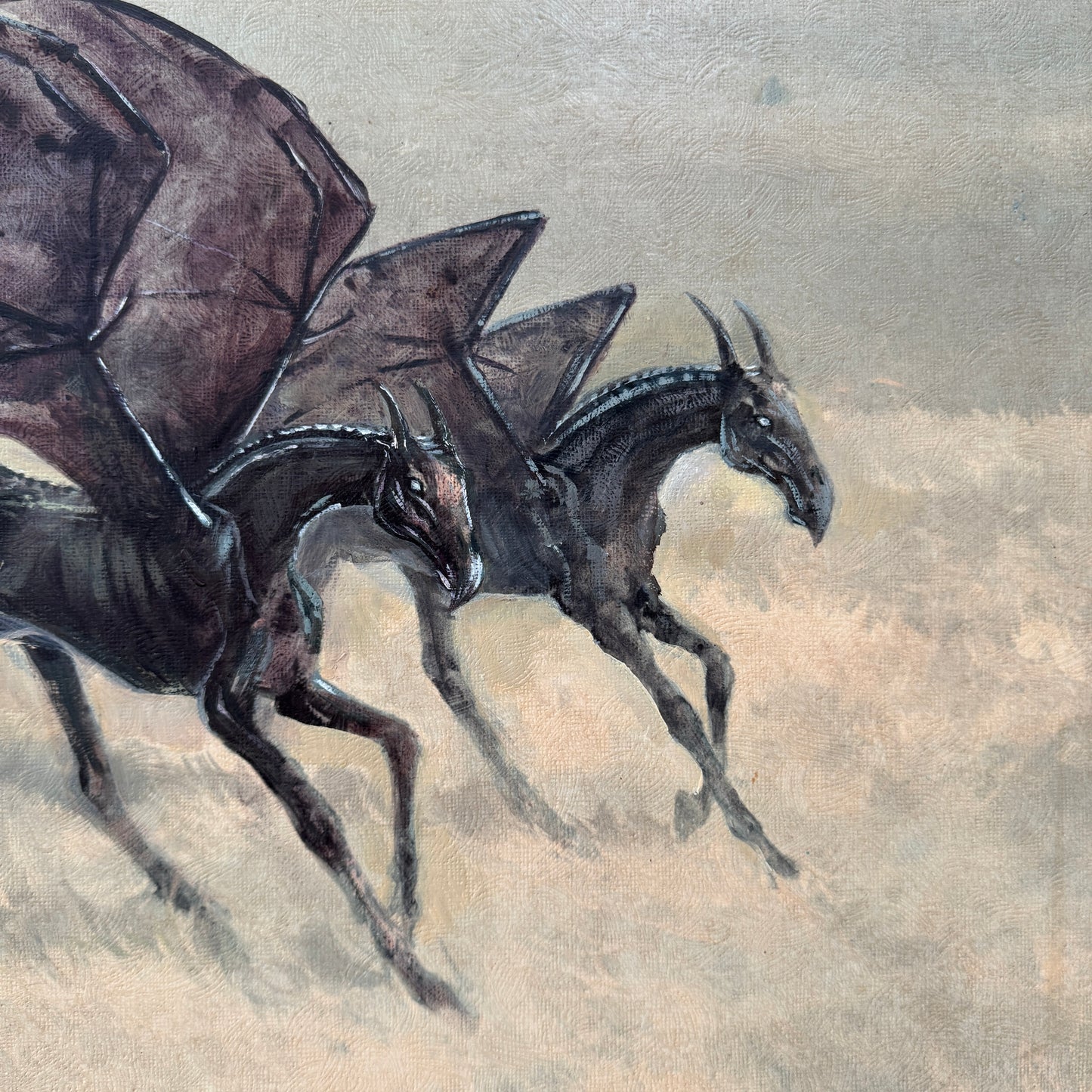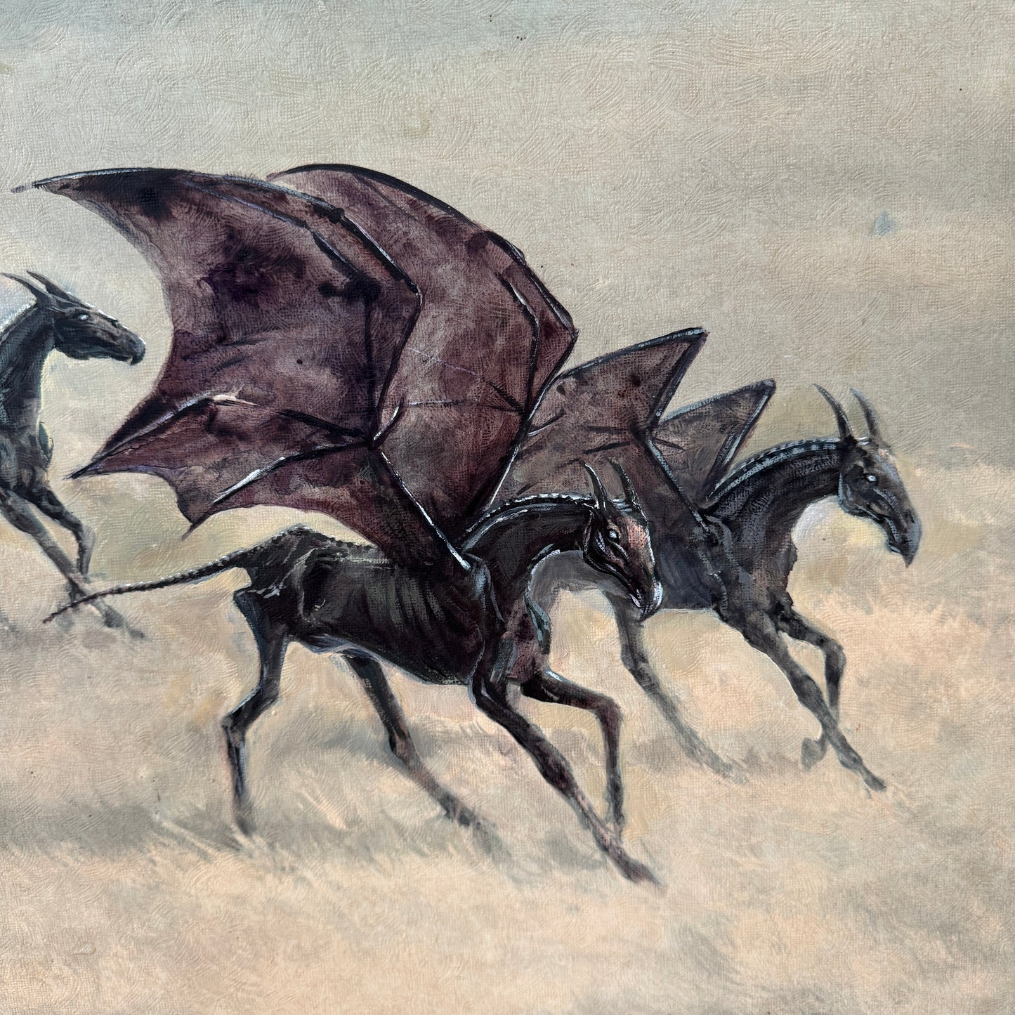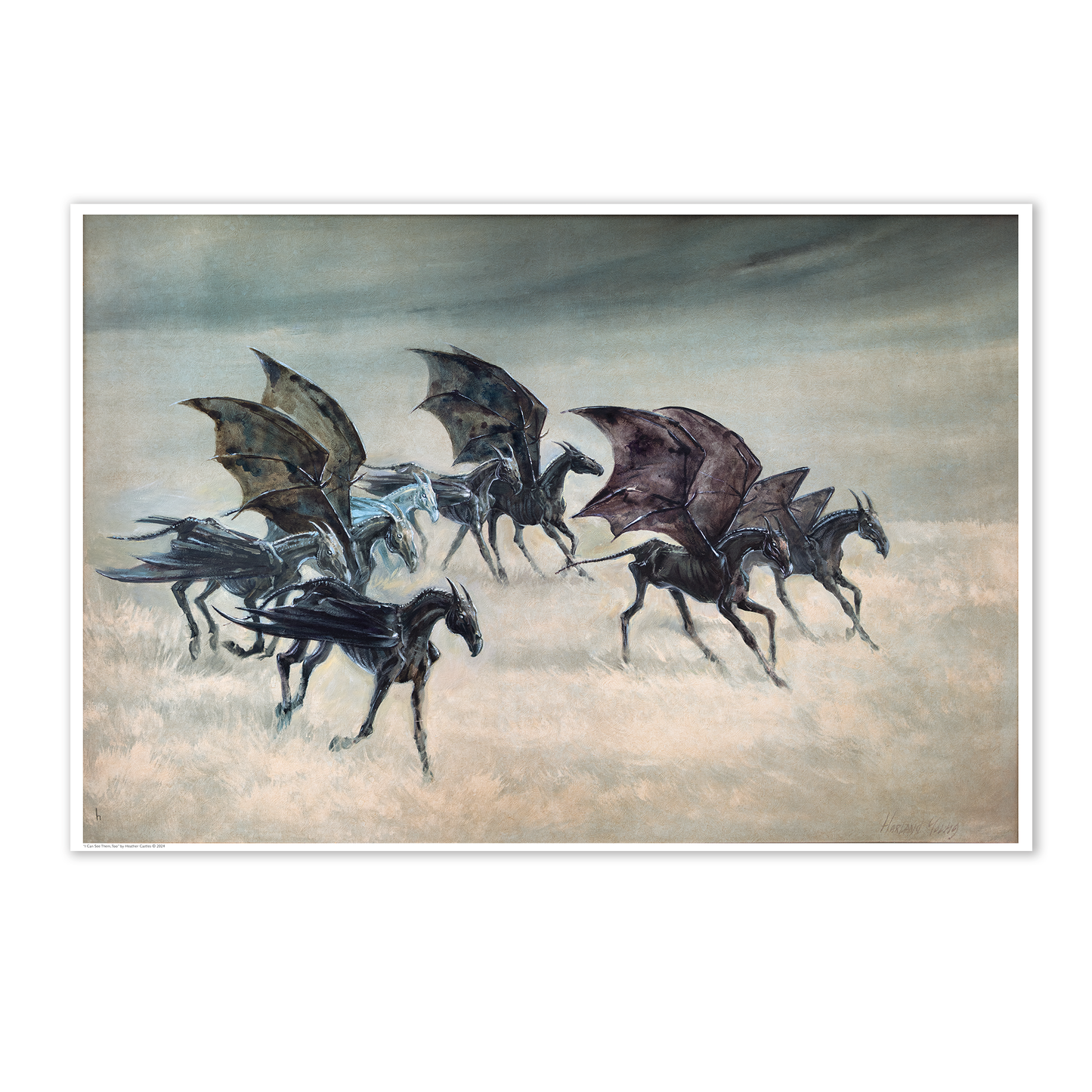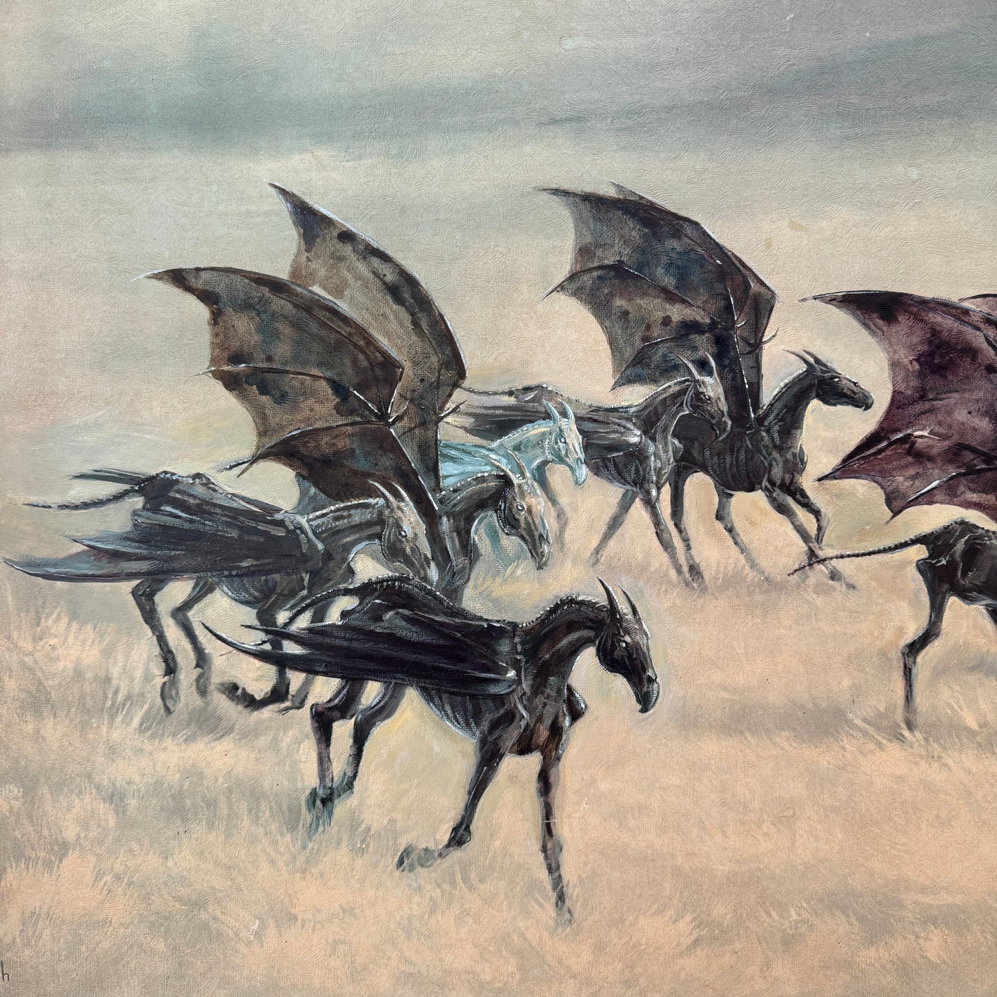 One of my favourite scenes in “The Order of the Phoenix” was how JK Rowling introduced the thestrals. The moment when Luna Lovegood said to Harry that she could see the thestrals, too, would have been so reassuring to someone who could not believe what creepy monstrosities they were seeing. The way Luna was so gentle and accepting towards them helped change the way Harry saw these misunderstood creatures. So with this altered painting, I wanted to share her view of thestrals, and imagine them in a world where they are perceived as gentle beasts, who love a good run through the grass and to feel the wind through their wings.