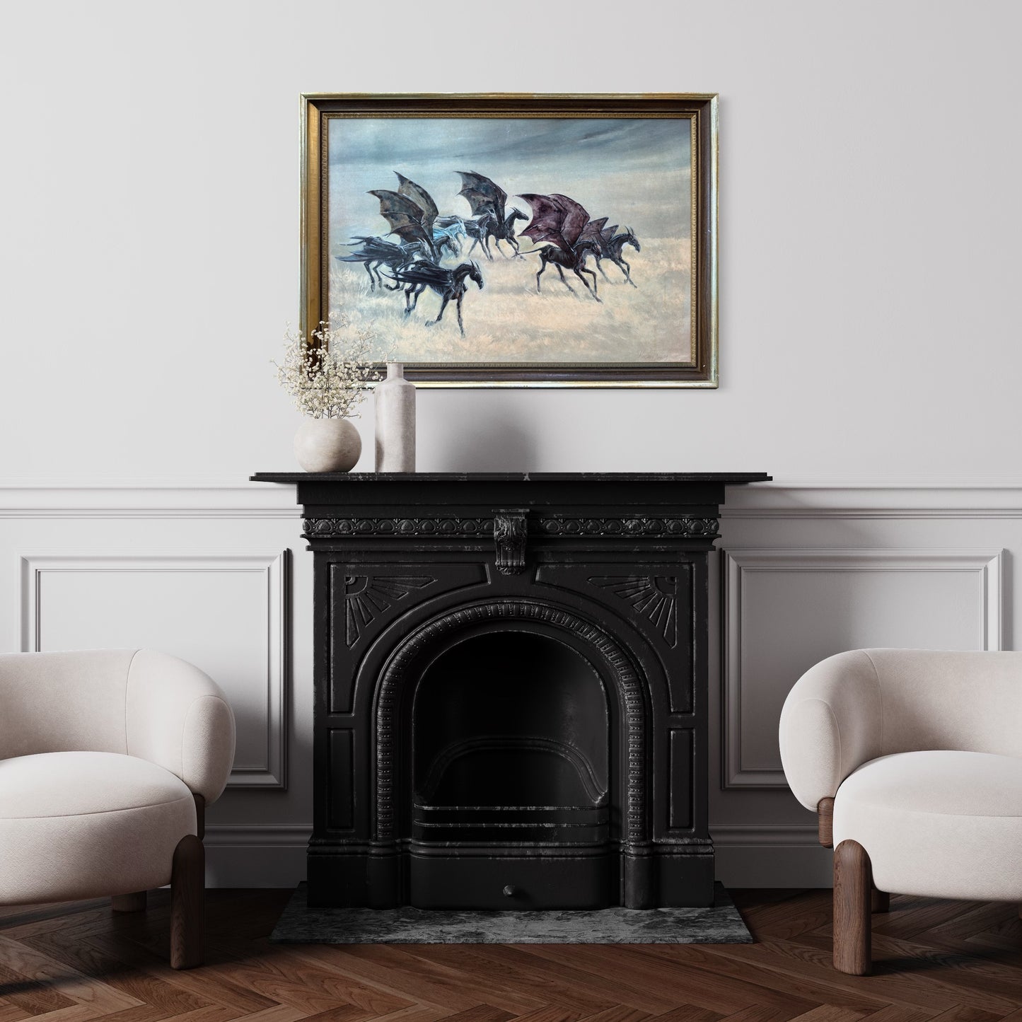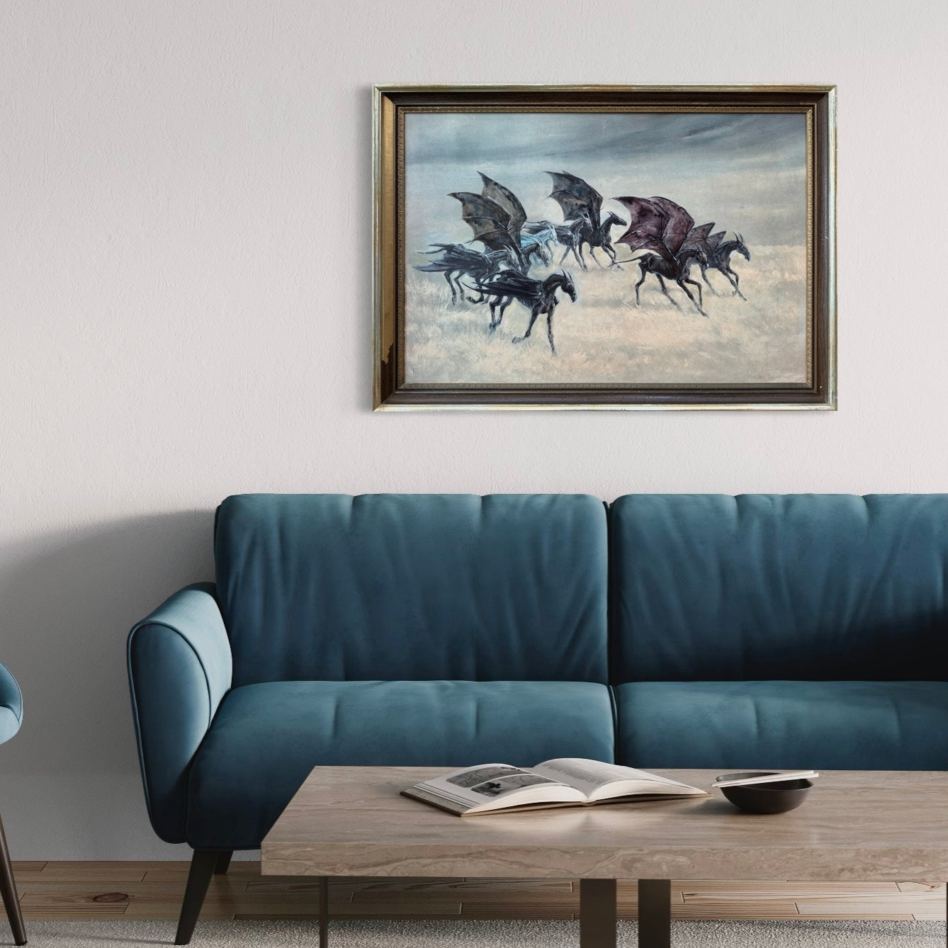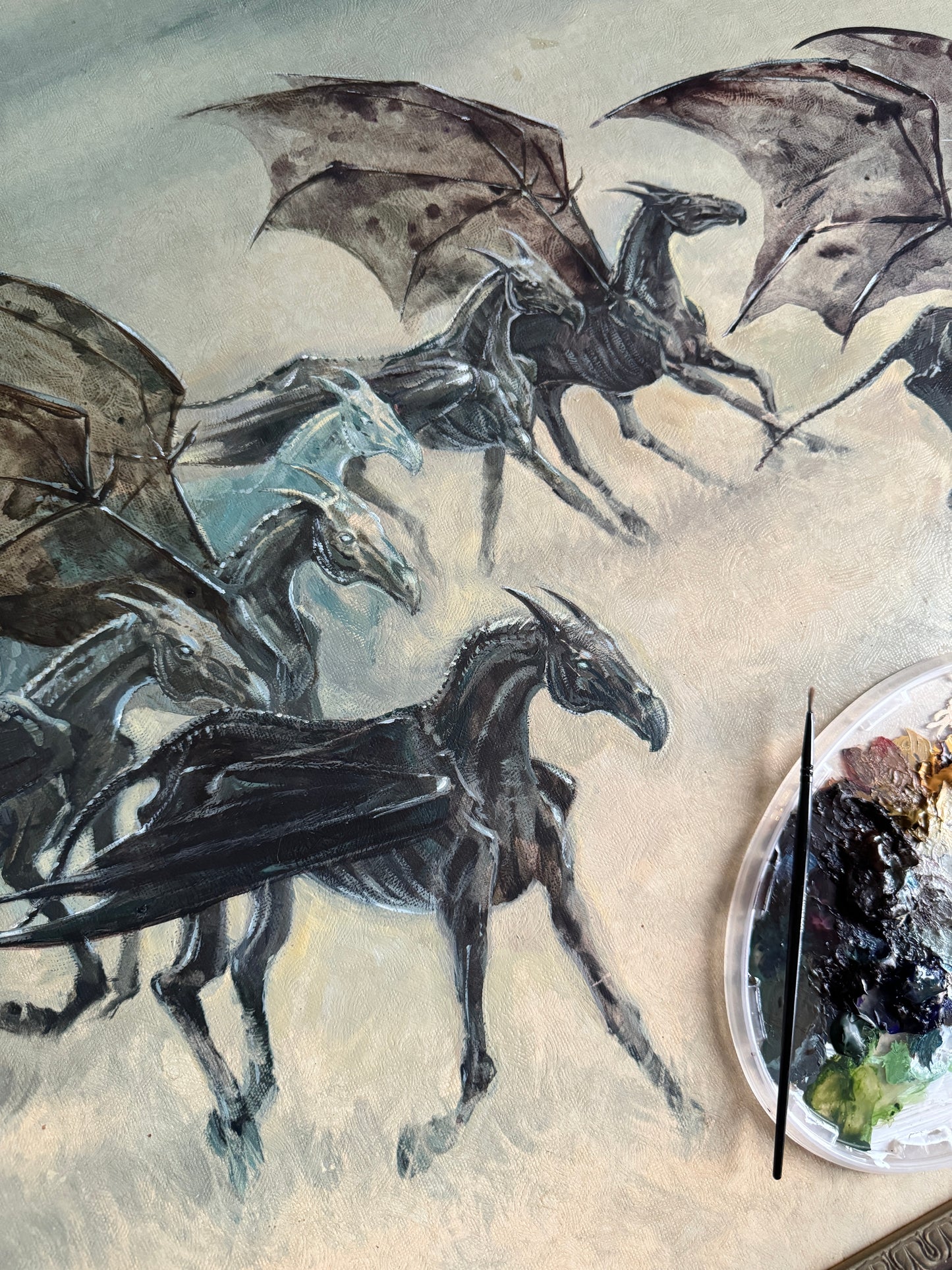 One of my favourite scenes in “The Order of the Phoenix” was how JK Rowling introduced the thestrals. The moment when Luna Lovegood said to Harry that she could see the thestrals, too, would have been so reassuring to someone who could not believe what creepy monstrosities they were seeing. The way Luna was so gentle and accepting towards them helped change the way Harry saw these misunderstood creatures. So with this altered painting, I wanted to share her view of thestrals, and imagine them in a world where they are perceived as gentle beasts, who love a good run through the grass and to feel the wind through their wings.
