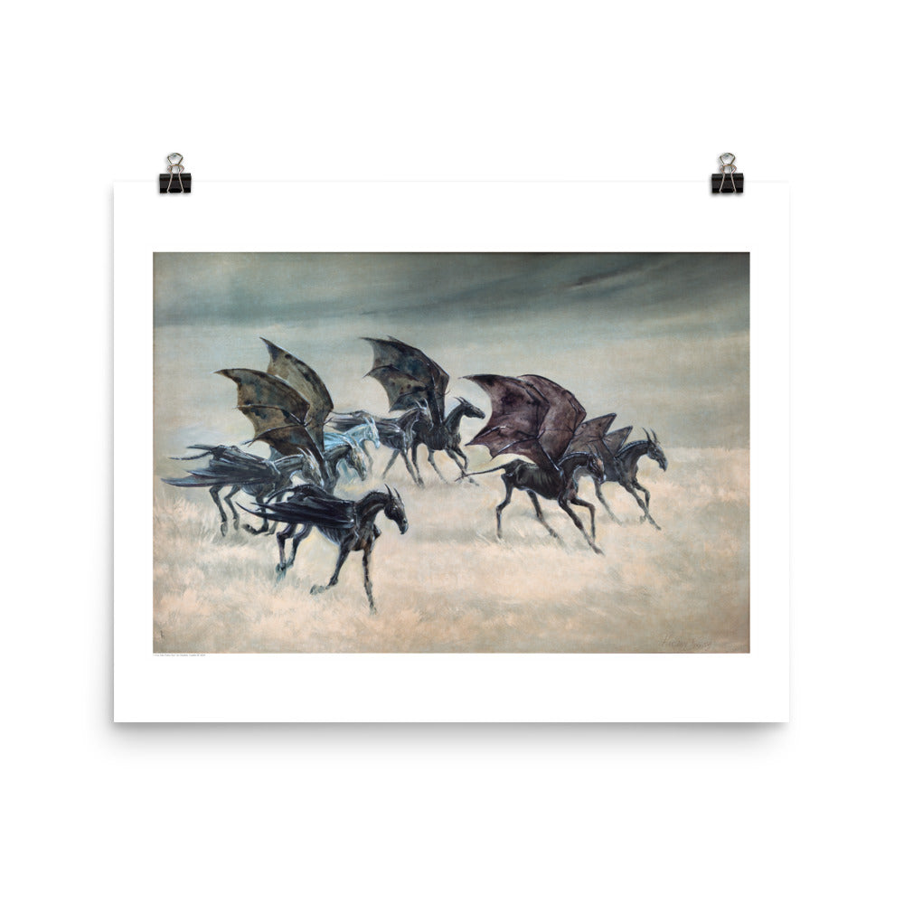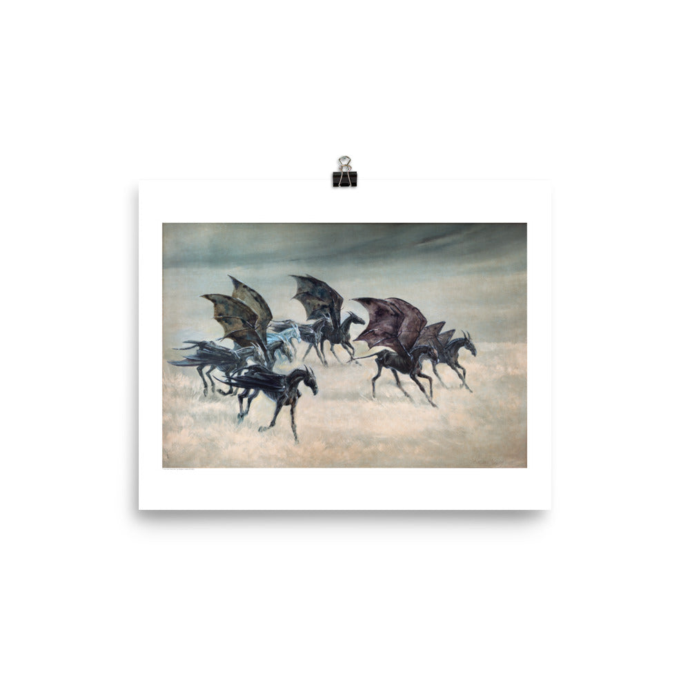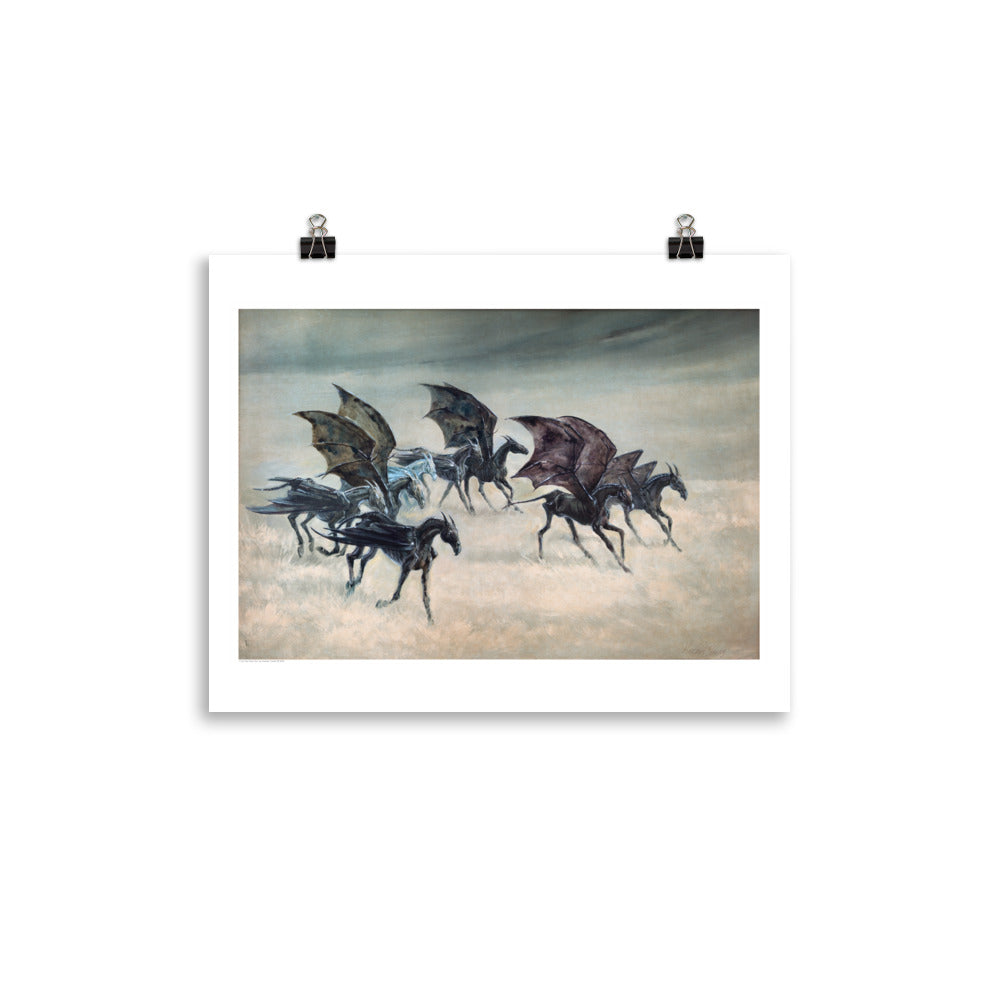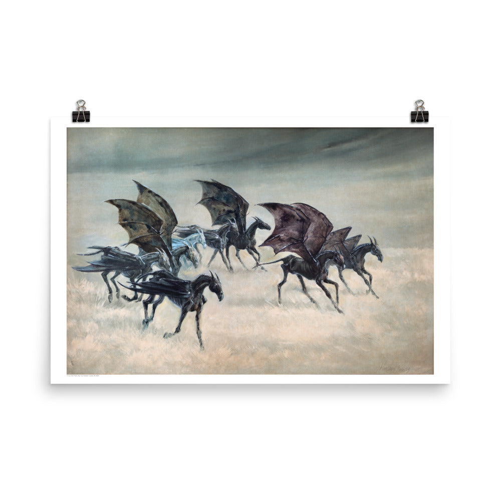 One of my favourite scenes in “The Order of the Phoenix” was how JK Rowling introduced the thestrals. The moment when Luna Lovegood said to Harry that she could see the thestrals, too, would have been so reassuring to someone who could not believe what creepy monstrosities they were seeing. The way Luna was so gentle and accepting towards them helped change the way Harry saw these misunderstood creatures. So with this altered painting, I wanted to share her view of thestrals, and imagine them in a world where they are perceived as gentle beasts, who love a good run through the grass and to feel the wind through their wings.