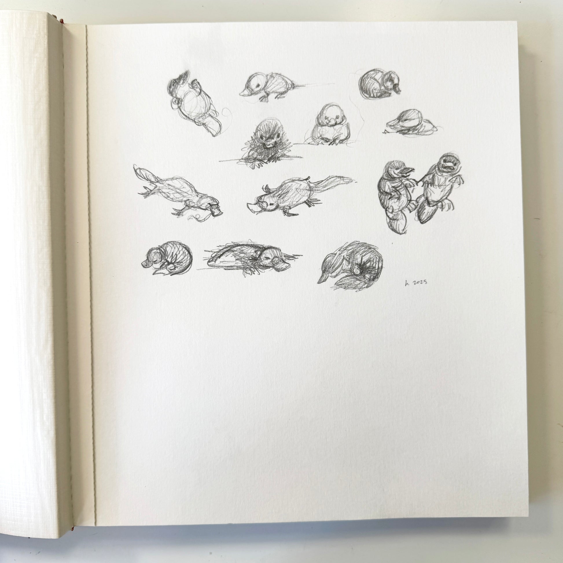 One of several studies I drew of the suspected bandits who stole my friend, Brittney's necklace! (Nifflers look a lot like a cross between a platypus and an echidna, so these studies are of baby platypuses! And yes, that is the correct plural of platypus :)