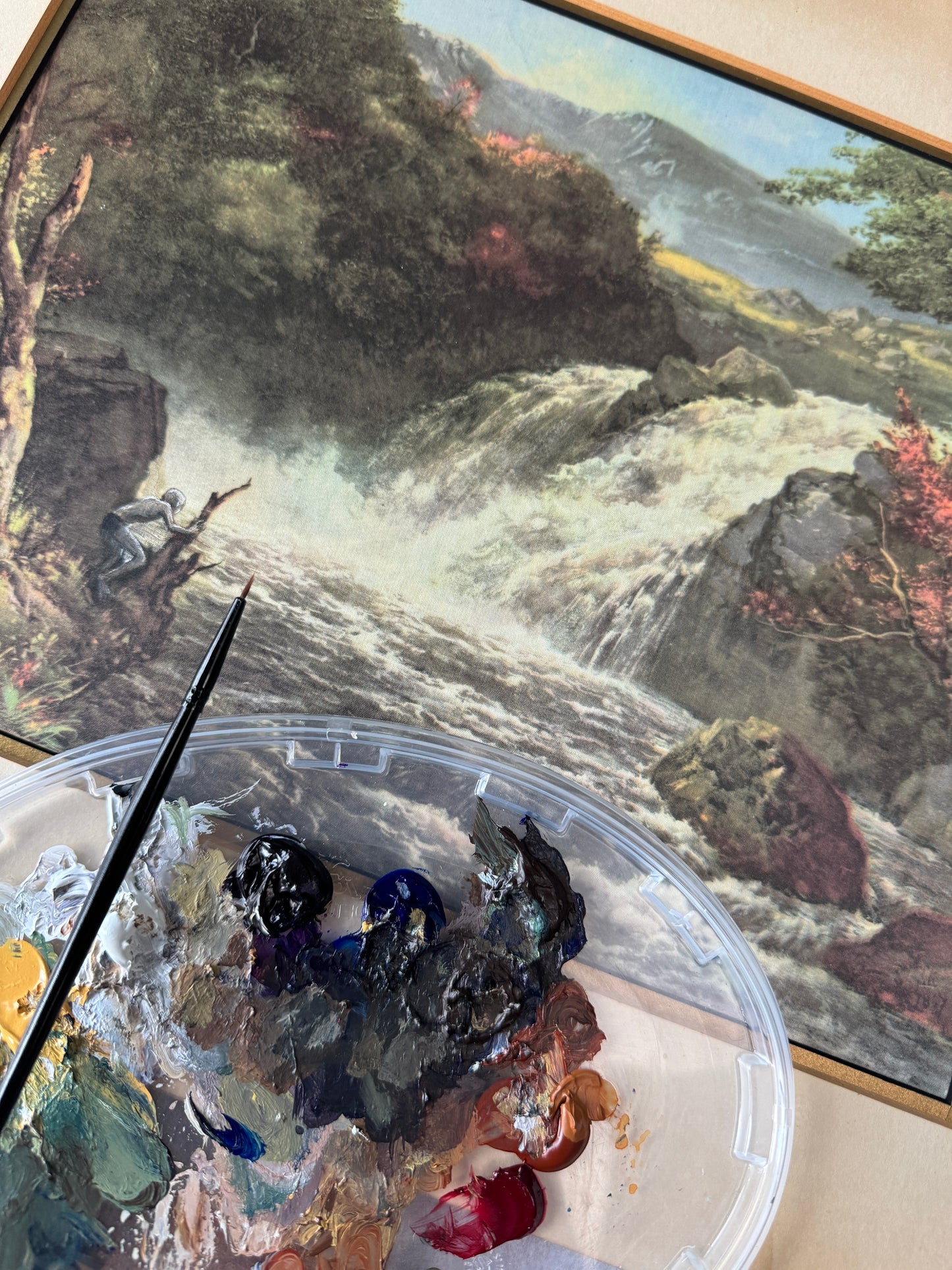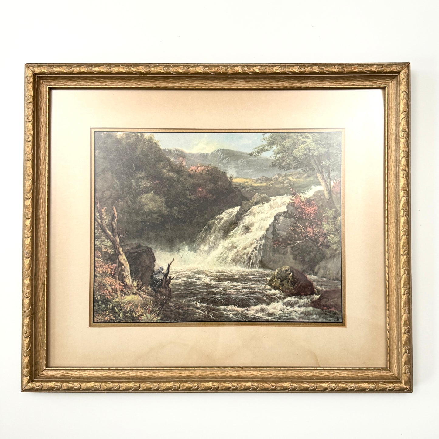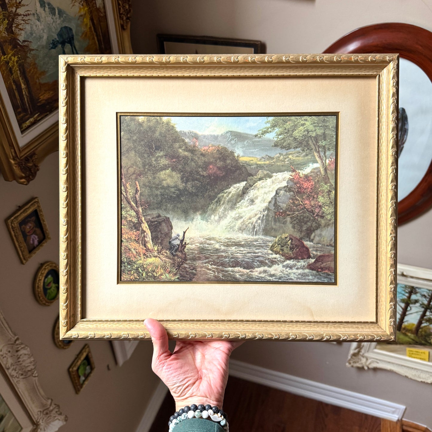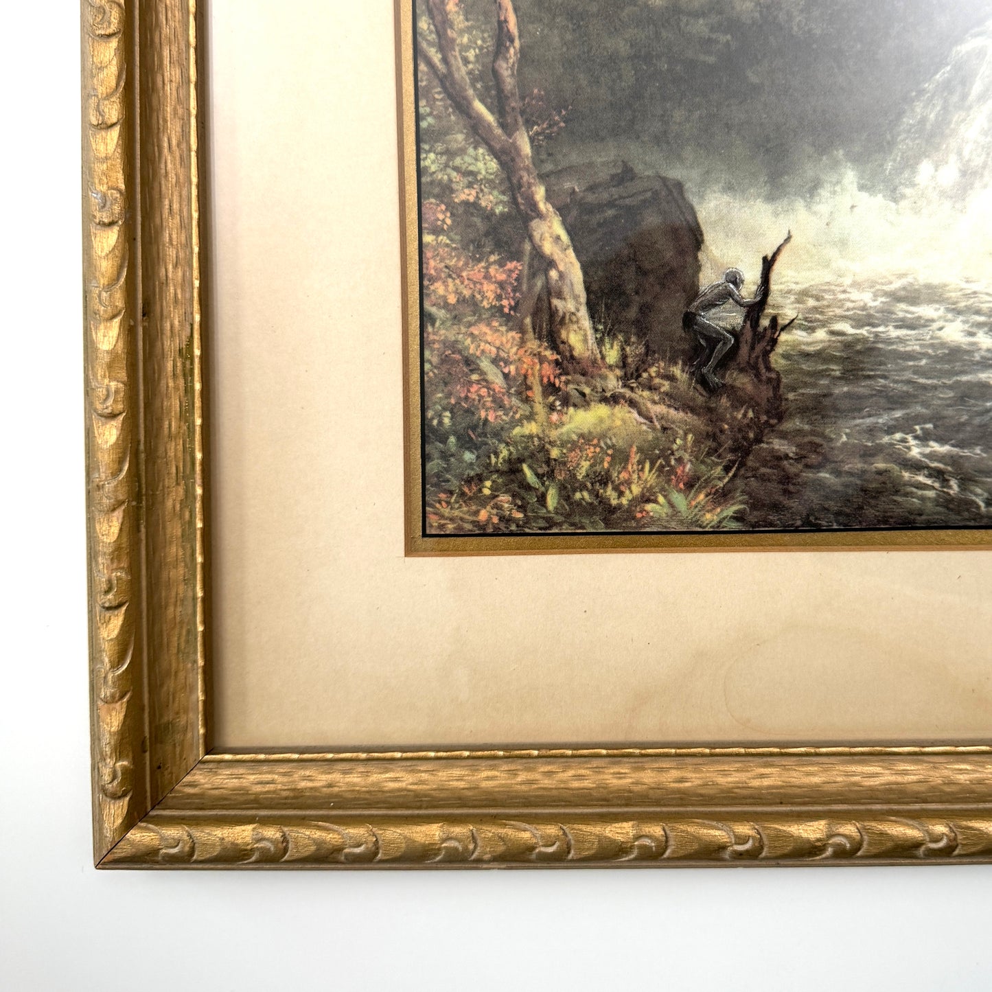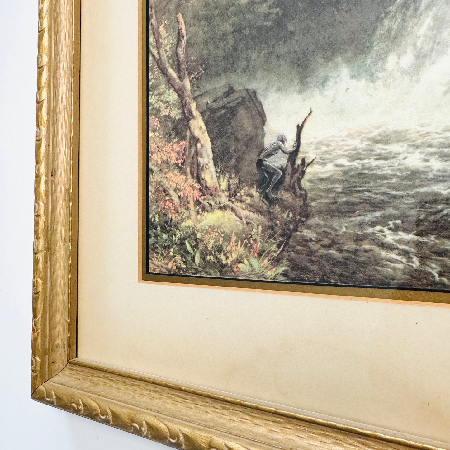 The original antique print (possibly by C.Gill 1864) was collected locally in Ontario. Paper print. The original matte has some watermarks on it, which I've left as I think it continues the idea that Gollum was always in this painting from long ago. The antique, wood frame is in very good condition. Ready to display.