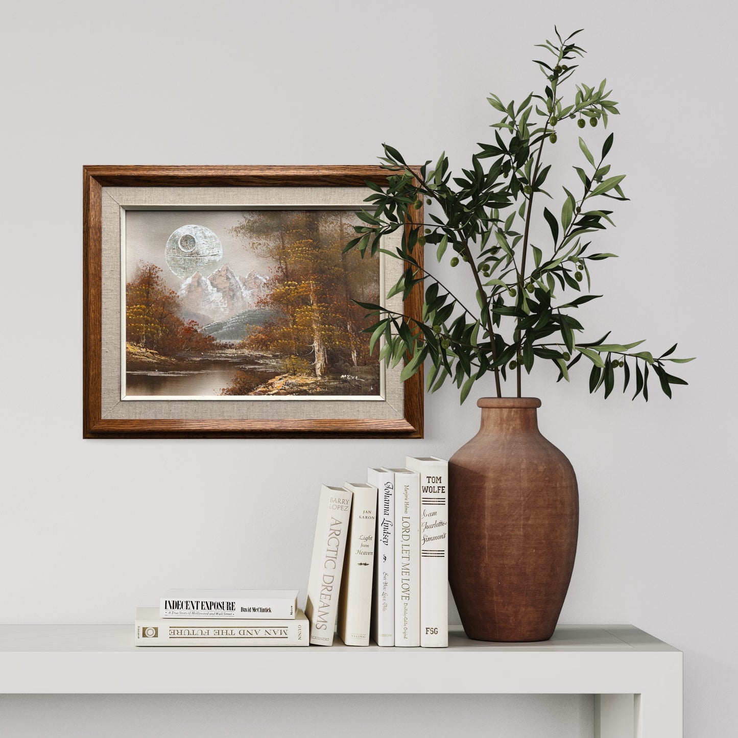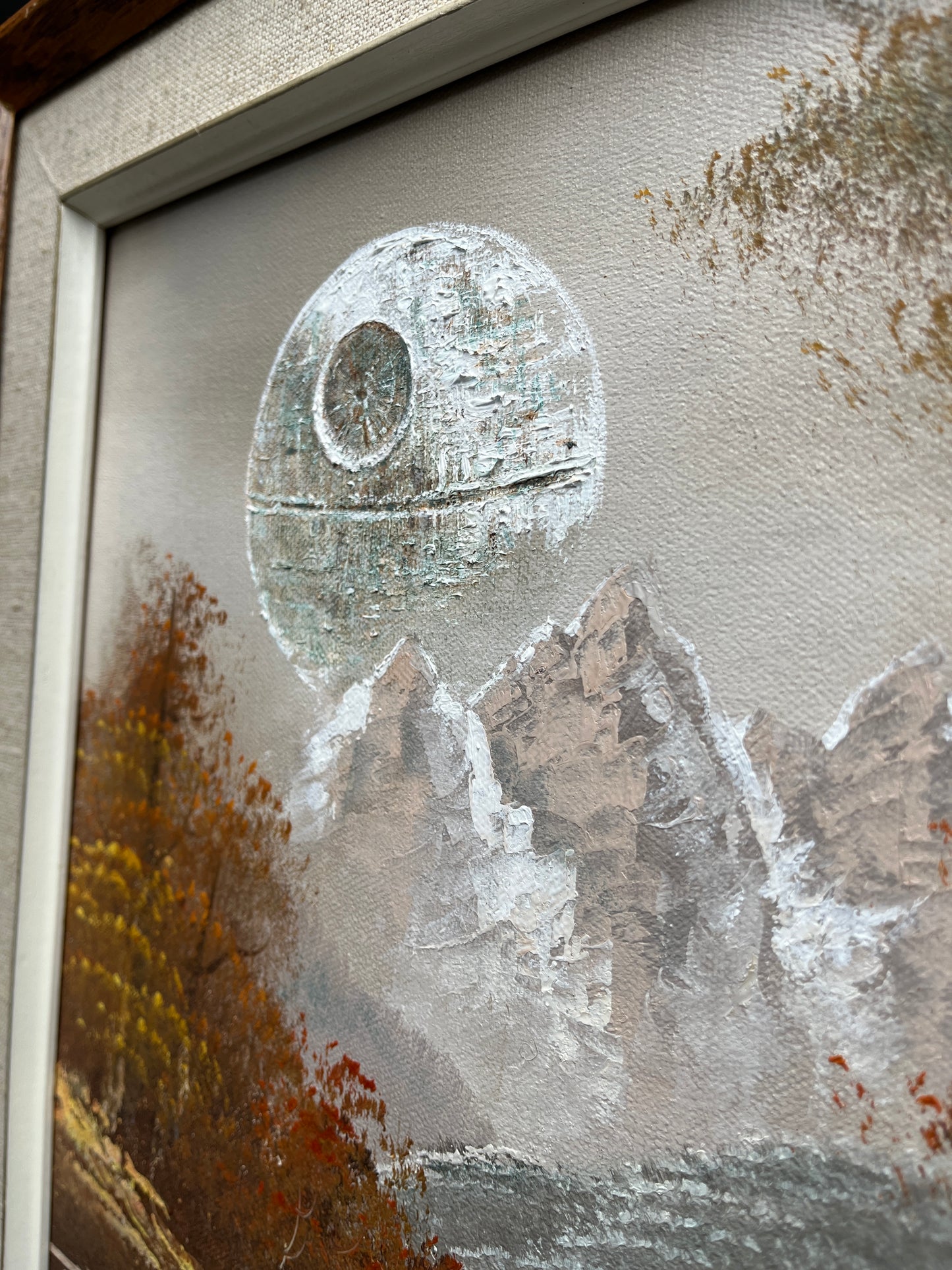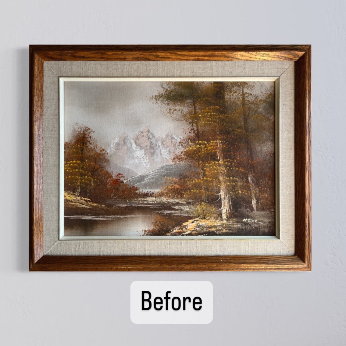 This piece was rescued from a local thrift store. The art and frame are in good condition. My aim in upcycling pieces like this is to encourage an appreciation of older genres of artwork by respectfully refreshing the colours and adding playful elements.