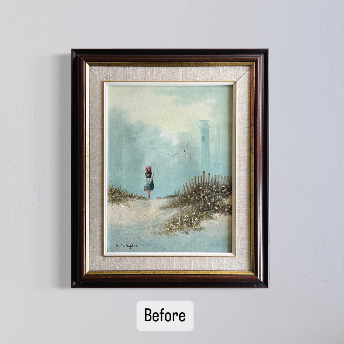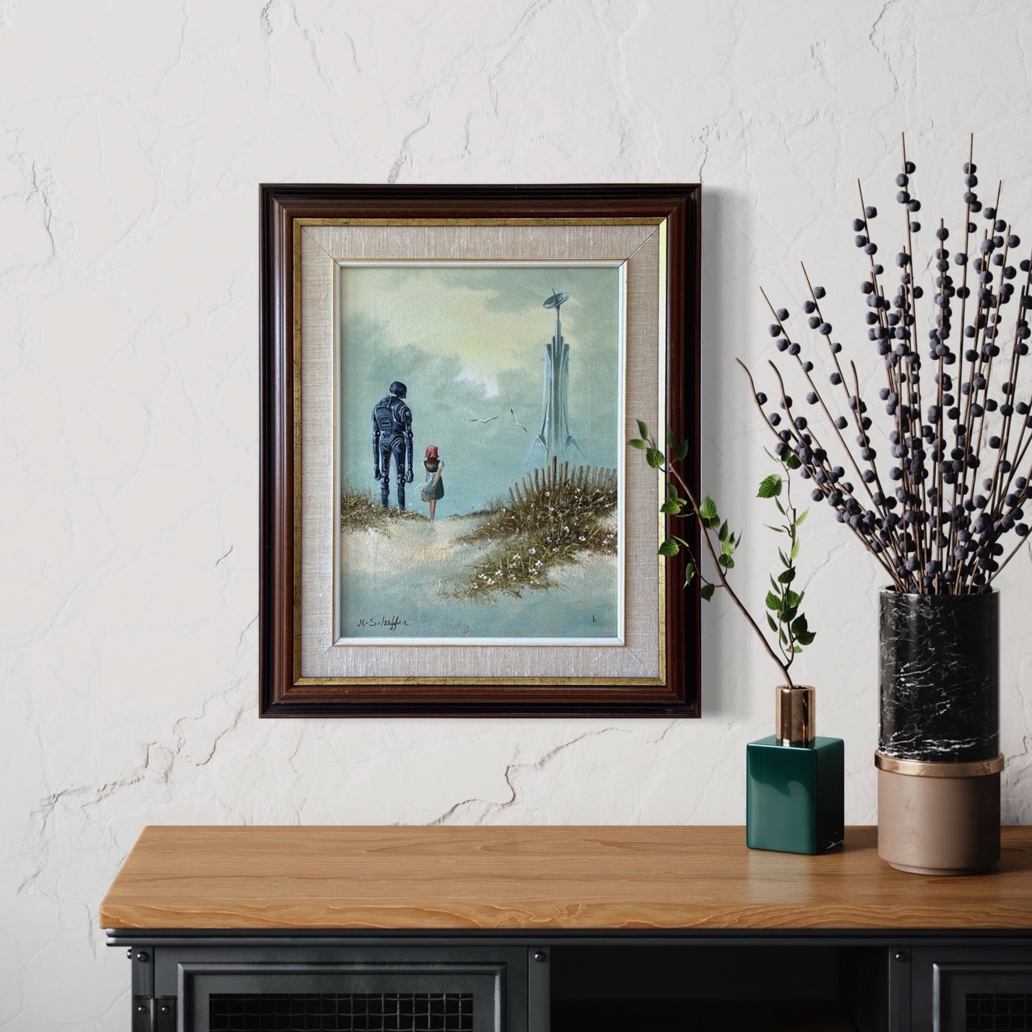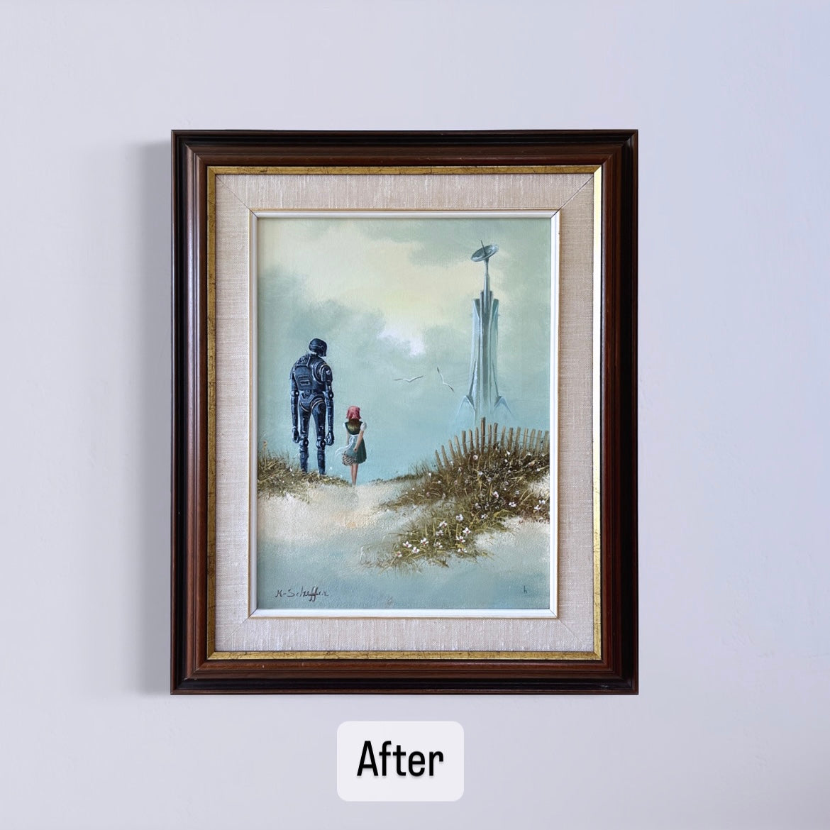 The original vintage painting by K. Scheffer was collected locally. It was in very condition, its only fault being it has fallen “out of vogue” and was unwanted. This is the sort of work I really love to give a new life to, bridging the space between modern pop culture and traditional art styles.
