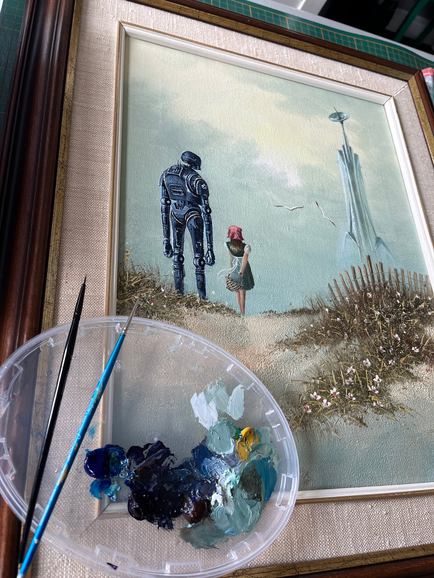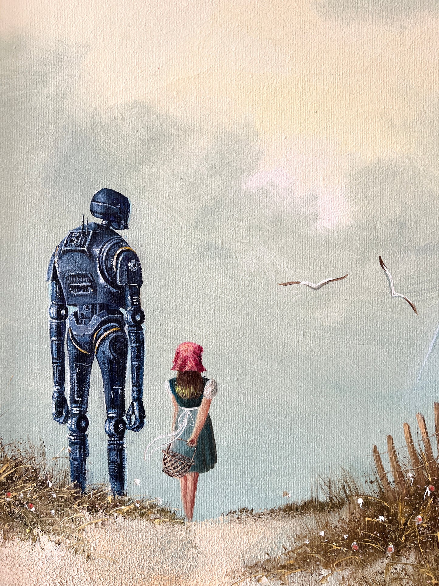 When I came across this vintage oil painting, I knew this little girl needed a guardian. A reprogrammed assassin droid seemed like the perfect choice as protector, a balance of sweet and sinister.