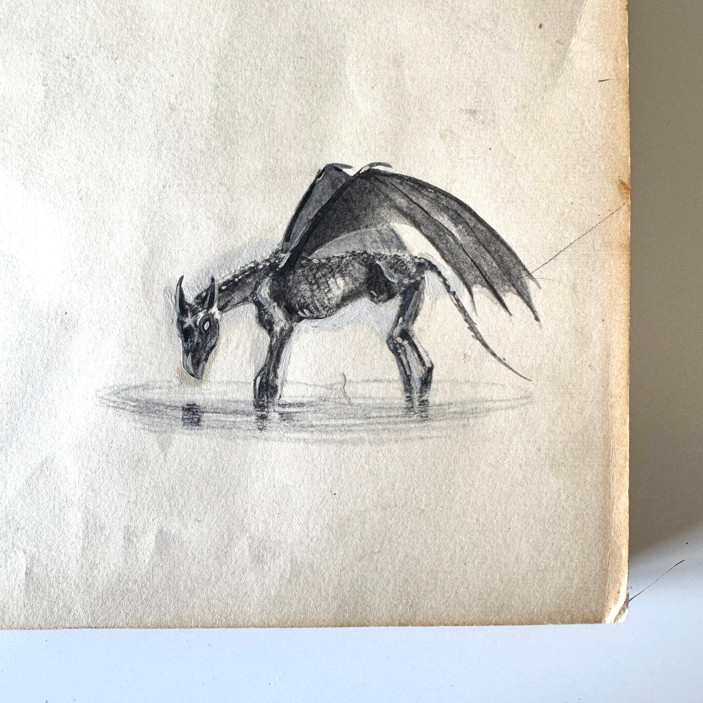 This paint on paper study was to prepare for my new altered art featuring thestrals. I had a vintage picture book which was in "well loved" shape, and the chapter heads were all of ponies running along the beach. I enjoyed experimenting with painting the different positions of the wings, the transparency, the skeletal figures. There were a few unique illustrations in the story that also suited being transformed, so I had fun with those as well.