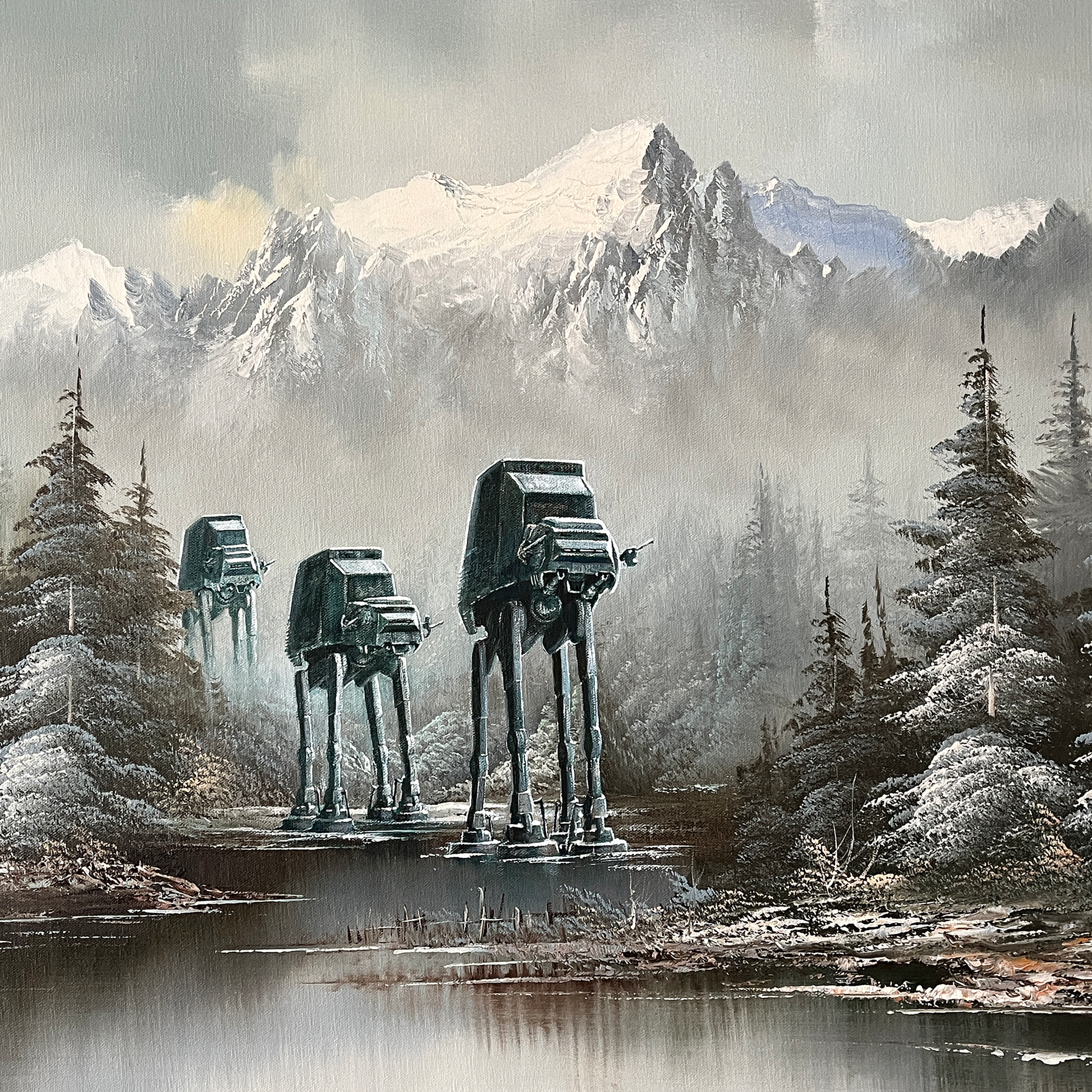This painting just emits quiet and cold. I can almost hear the ominous creak of the frost on the metal joints of the walkers as they search the landscape for rebel scum. I imagined this migration of walkers was an accepted part of life on that planet, and that the artist would hold their breath as they painted them walking across the winter wonderland.