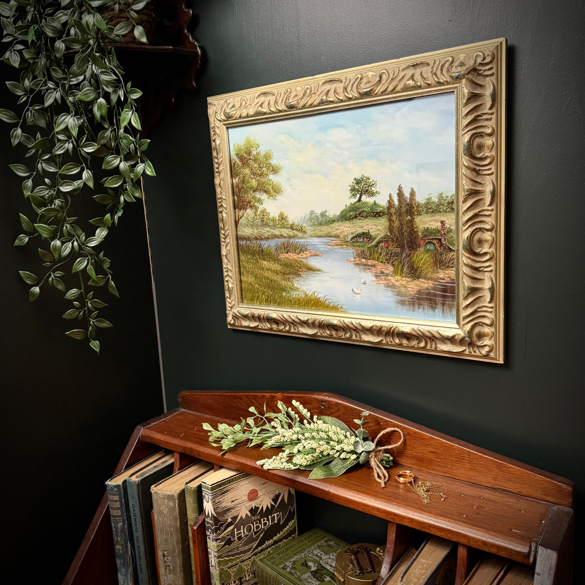 This alteration was very tiny, and I was careful to use small brushstroke in the same style as the artist who painted the original vintage painting to blend in the addition of the homes in Bilbo and Frodo’s neighborhood.