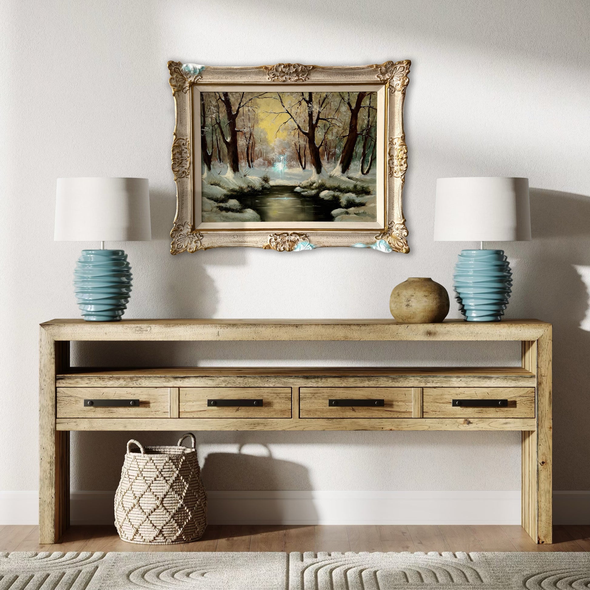 The vintage painting on board was collected locally in Ontario. The painting itself was in good condition, but the vintage frame was terribly beaten up! My Dad had a great time creating molds to create replacement plaster, then lovingly gluing and filling them in. I then had fun restoring most of the pieces to their natural state... but experimented with an idea I had for a few patches...