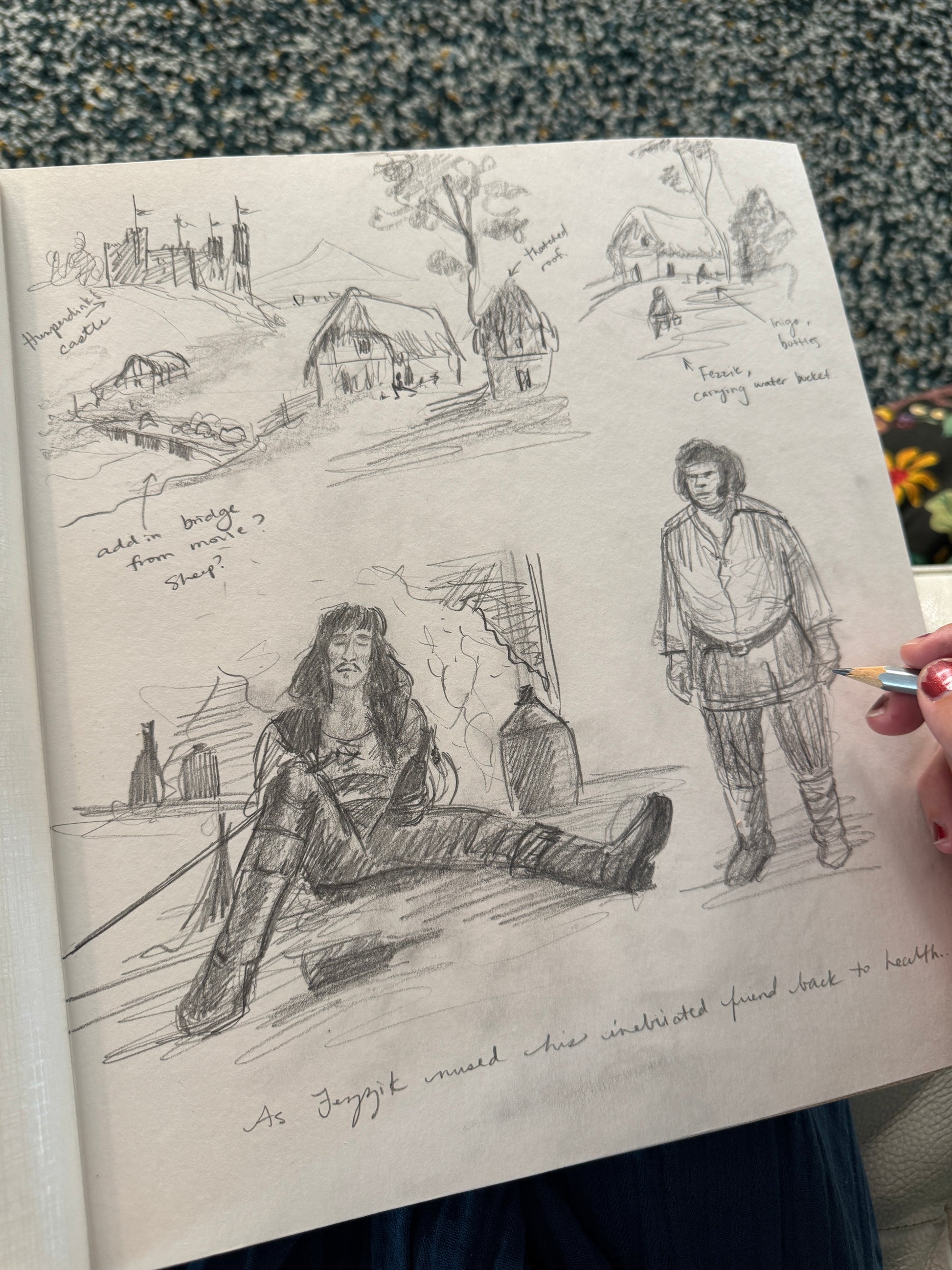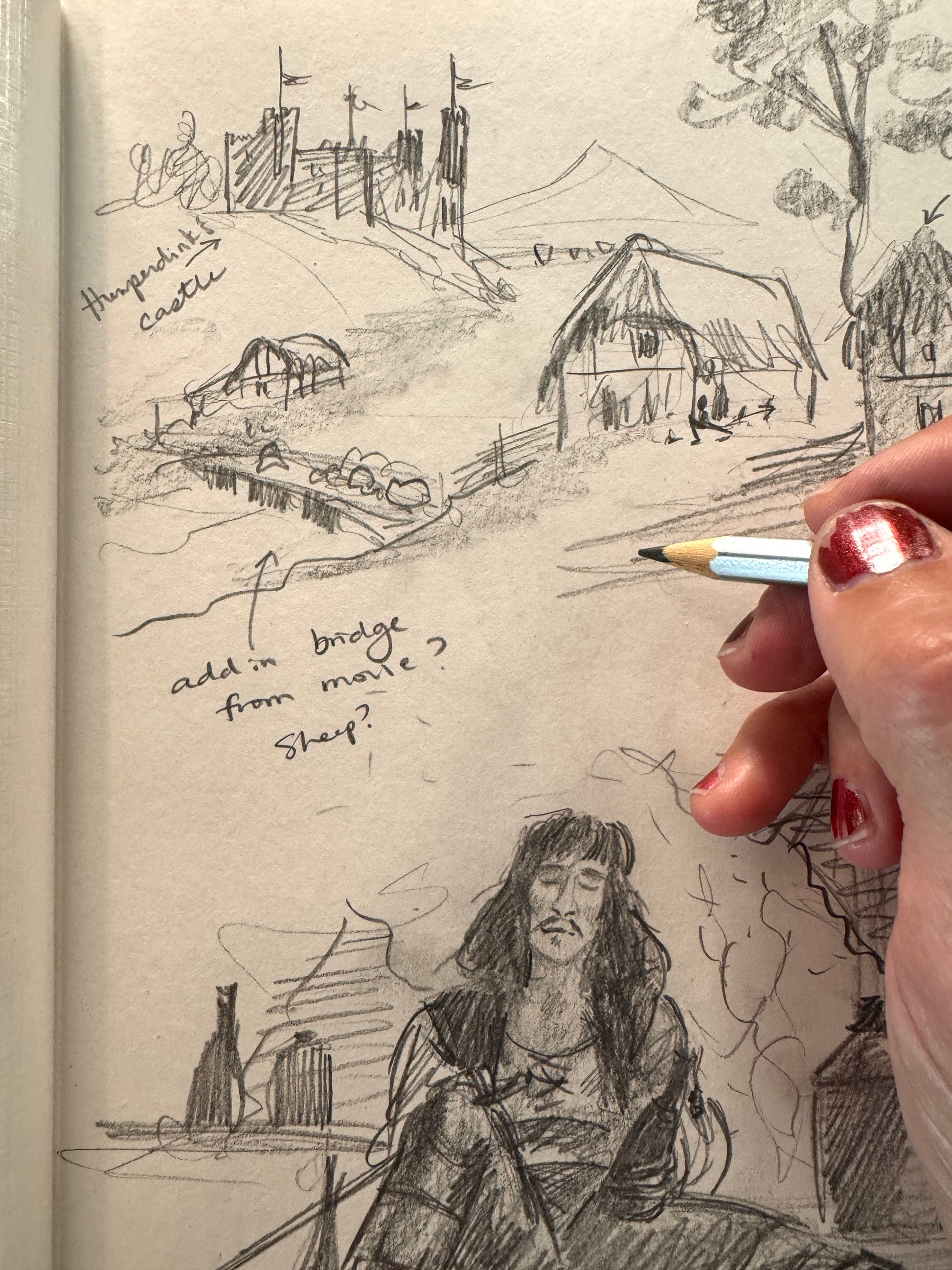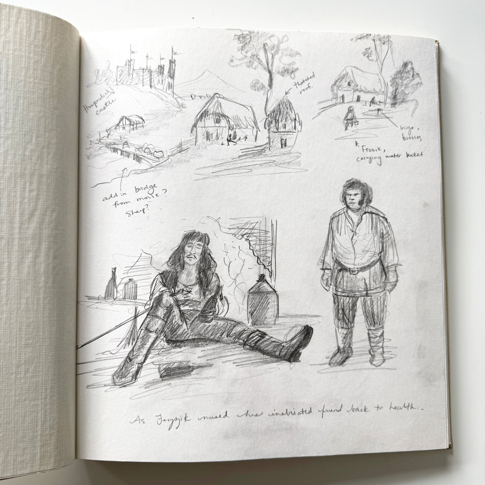 Before painting the alterations, I spent some time drawing and painting studies of my favourite elements from the film The Princess Bride. I found an old wedding scrapbook with lovely smooth paper, which was perfect for several studies in pencil and watercolour.