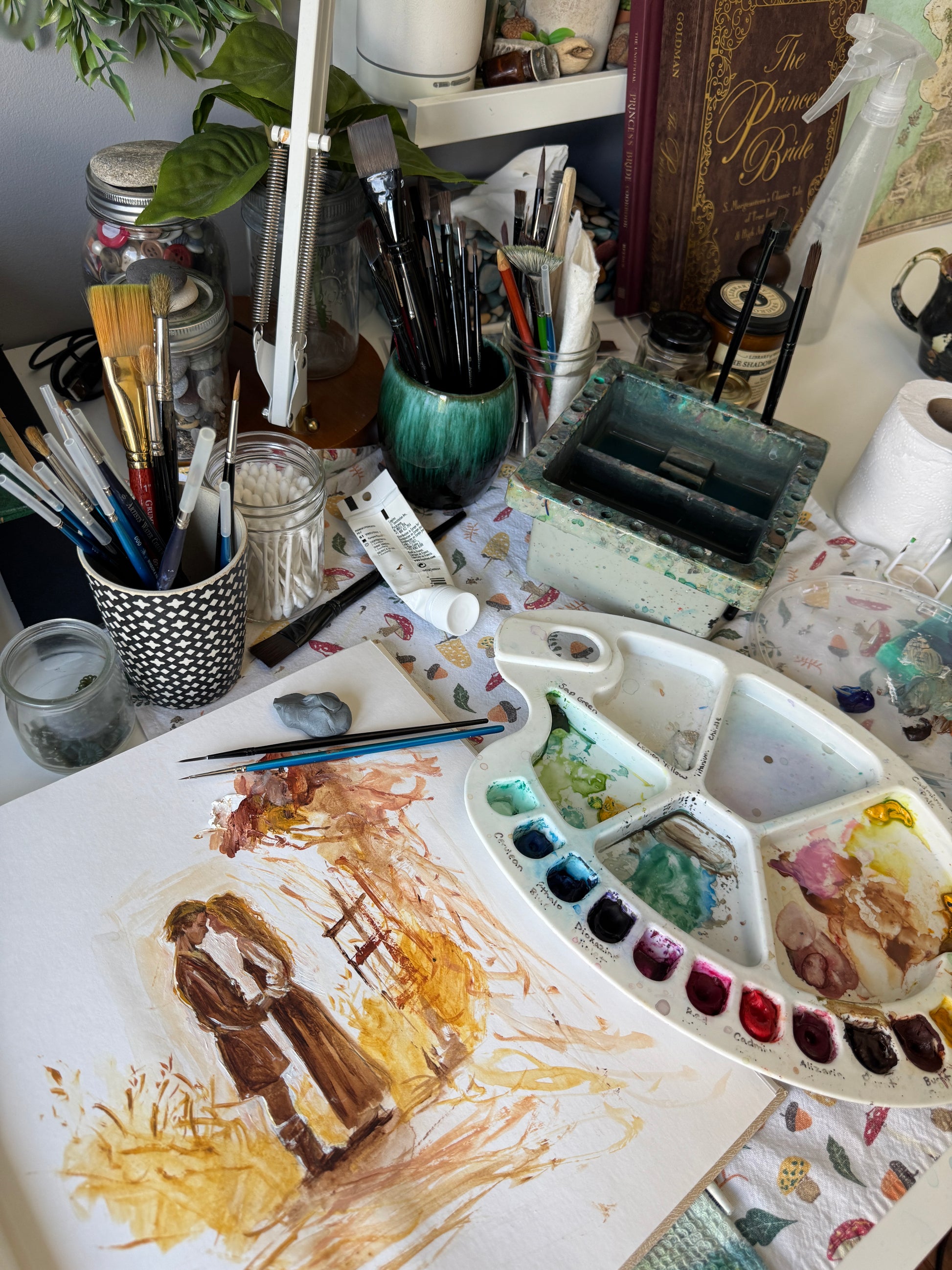 Before painting the alterations, I spent some time drawing and painting studies of my favourite elements from the film The Princess Bride. I found an old wedding scrapbook with lovely smooth paper, which was perfect for several studies in pencil and watercolour.