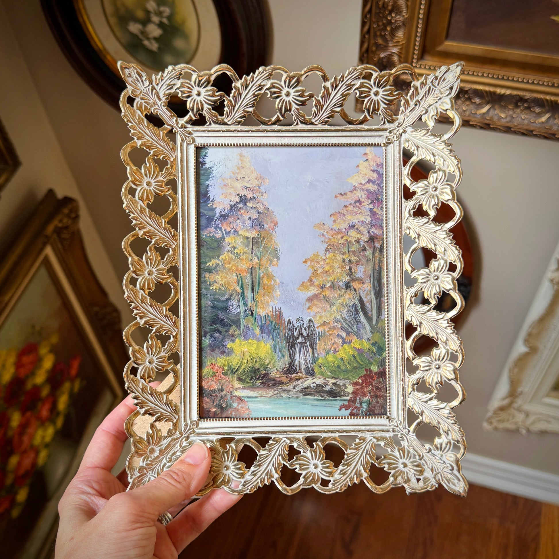 The original vintage painting was rescued from a thrift store. I gave it a good clean, but you can still see foxing and tiny white paint spatters all over it… which I think is part of the character of the old art, and adds to the feel that this painting (and angel) came from long ago! The wood frame is sturdy and wired to display on the wall.
