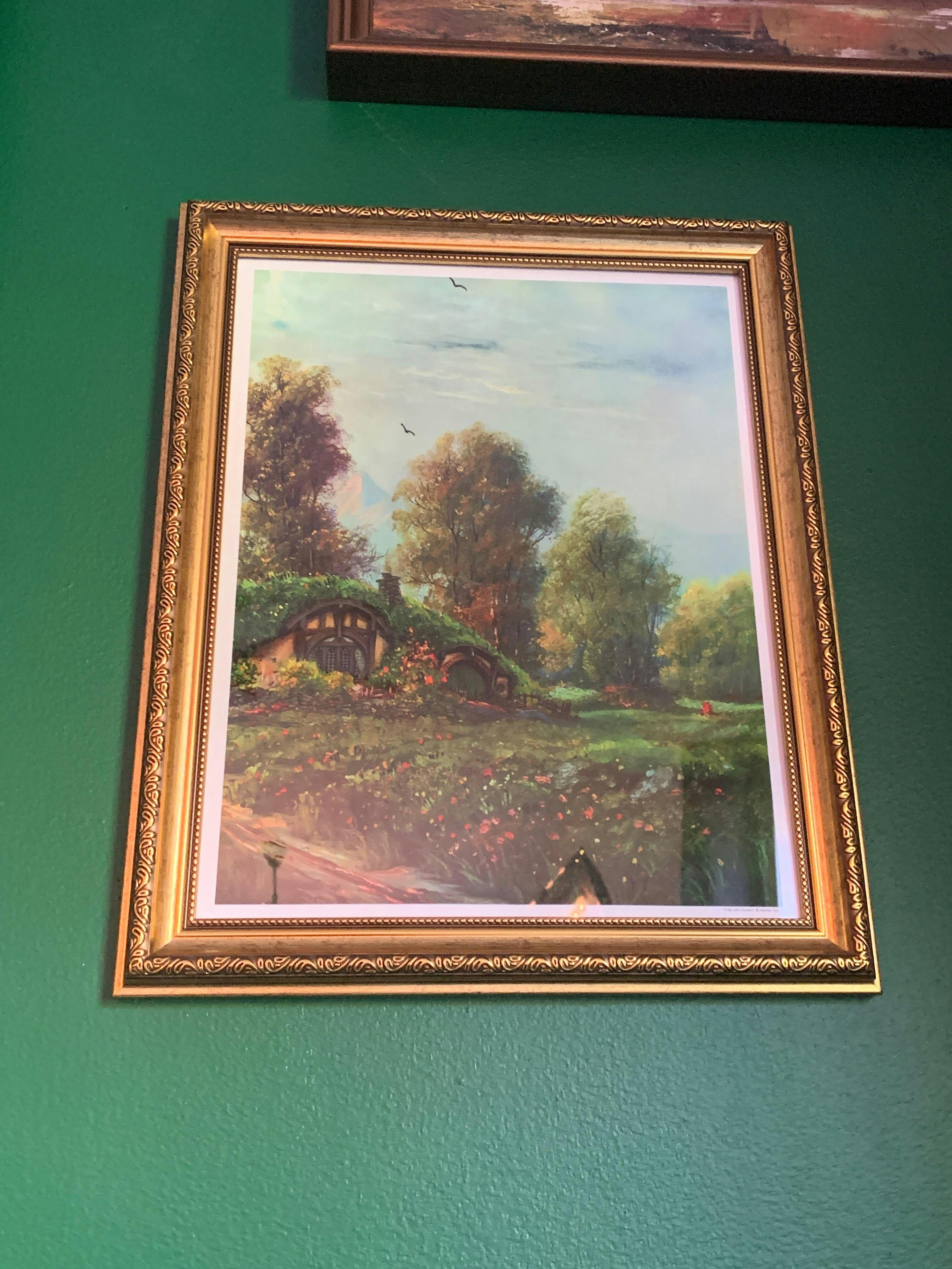 🖼️ The original vintage art was discarded locally… the print was sagging out of the frame and was dirty. I gave it a good clean, and affixed it to the masonite board with acid free glue. After completing the alteration, I double varnished the painting to seal it and protect the addition of the cozy home in the hill.