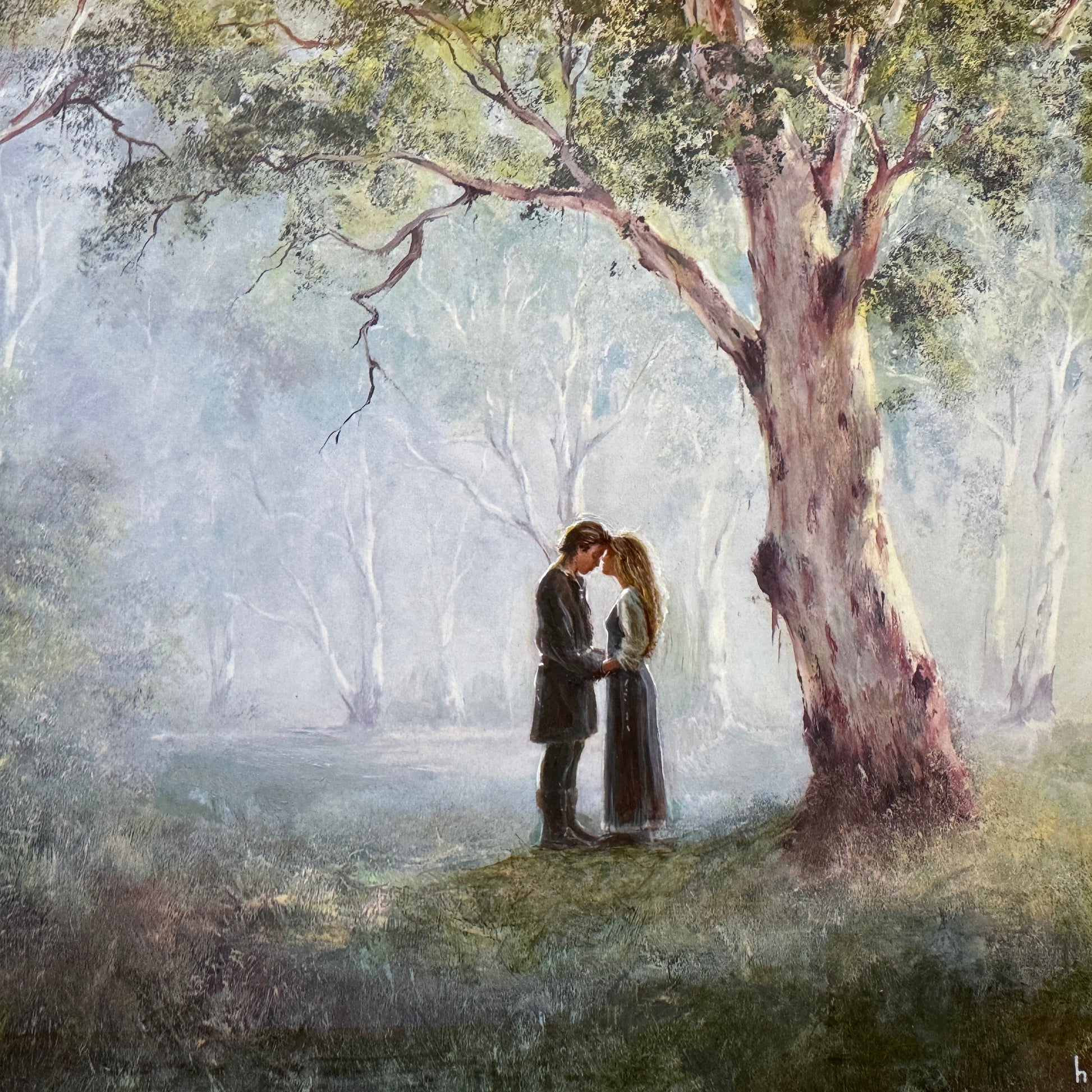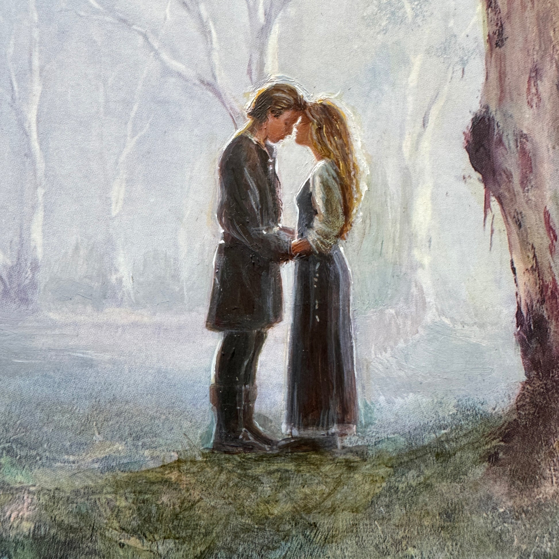 Before adding in the amorous pair, I painted the sheep out of the landscape. Then I got the giant magnifying glass out and put on my reading glasses and spent a decent amount of time carefully painting their very tiny faces! I liked this pose best, the tender moment before they kissed... because when I watched it as a kid, I always had the same disgusted thought "They're kissing AGAIN!"