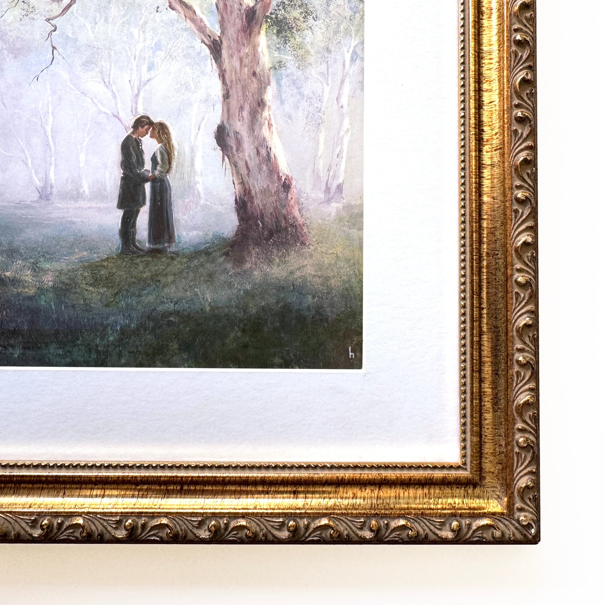 In the works for the frame : The collector of this piece had a special request to change the frame to a more fairytale like gold frame... I had the perfect one, which shows more of the art! I changed the old glass to non-glare glass and added a white matte to lighten the feel.