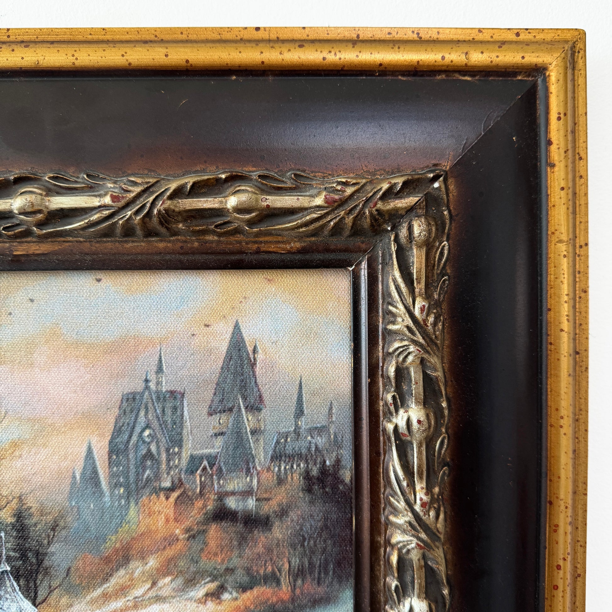 The original surface is a print on canvas by Dutch painter Barney Cornelis Koekkoek (1803-1862.) Koekkoek was nicknamed the “Prince of Landscape Painting” and recognized as the founding father of Dutch romantic landscape painting. It was a pleasure to paint on this print and study his work as I added the alterations.