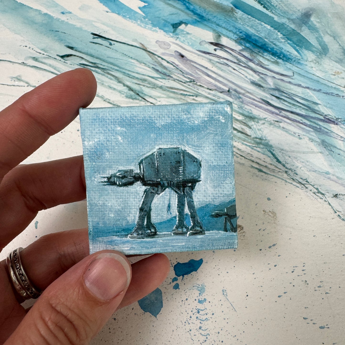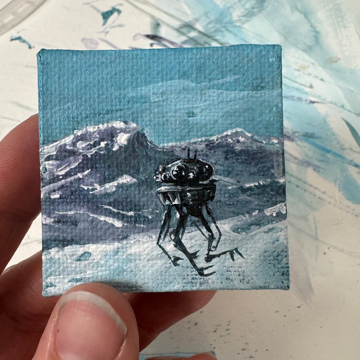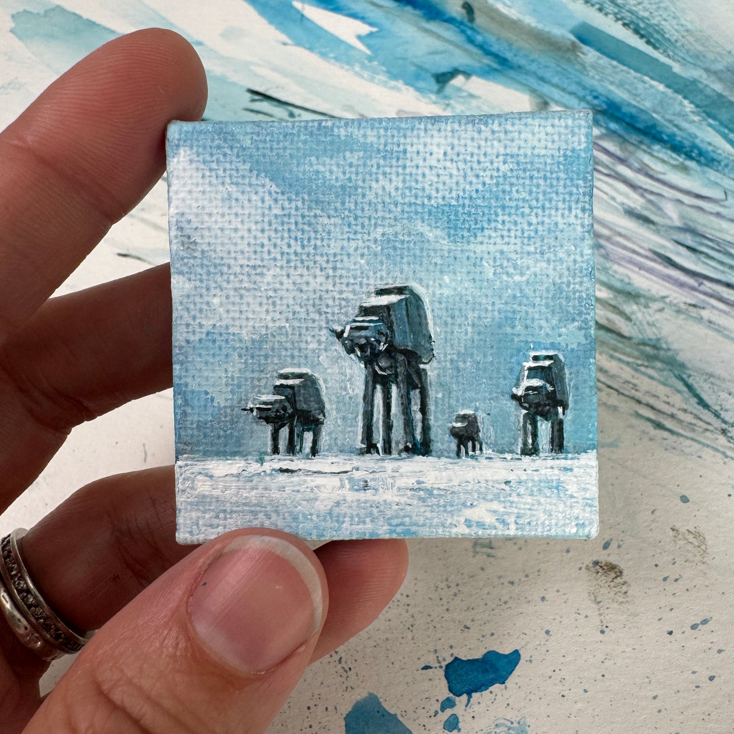 Commission of a miniature 2x2 inch painting inspired by the AT-AT Walkers (or droids!) on the planet Hoth.