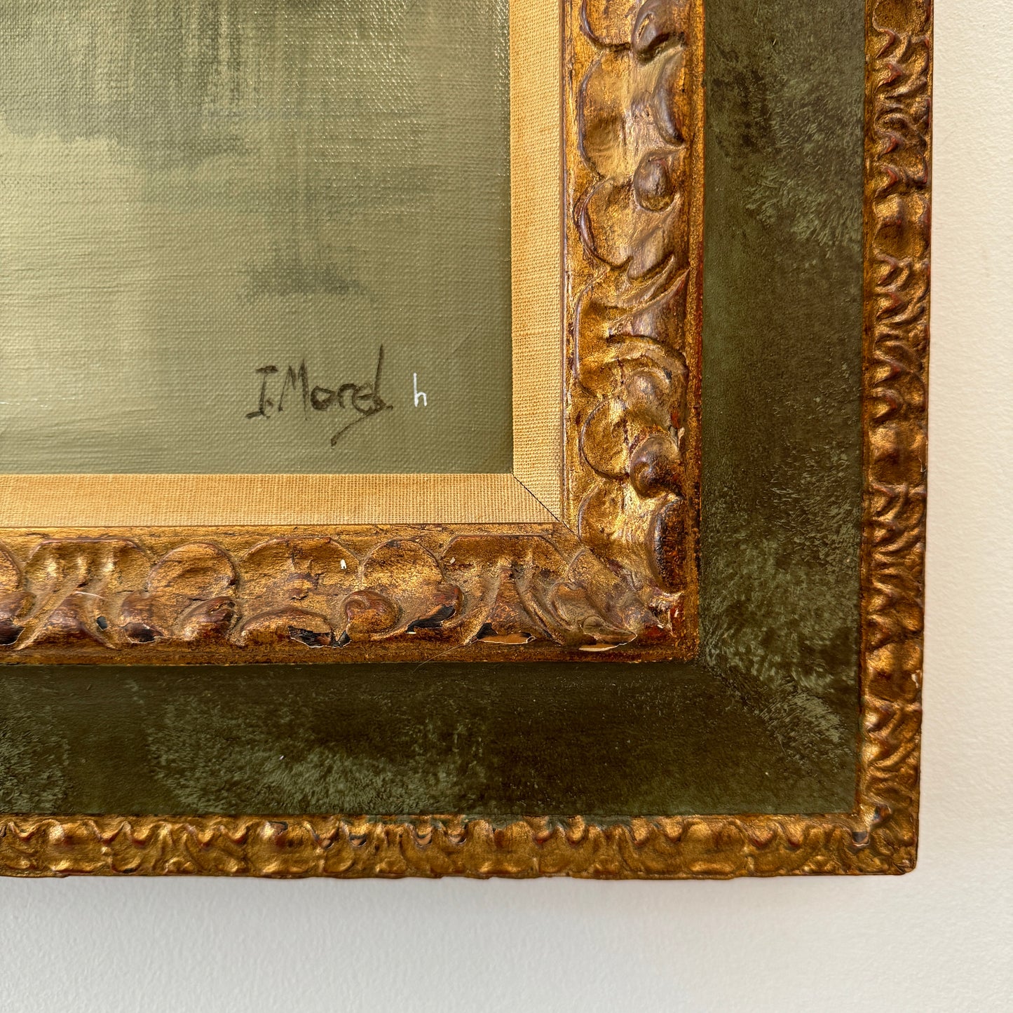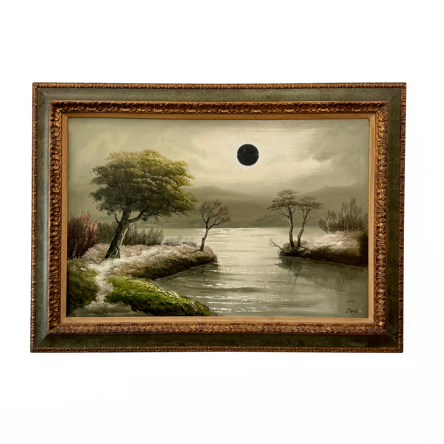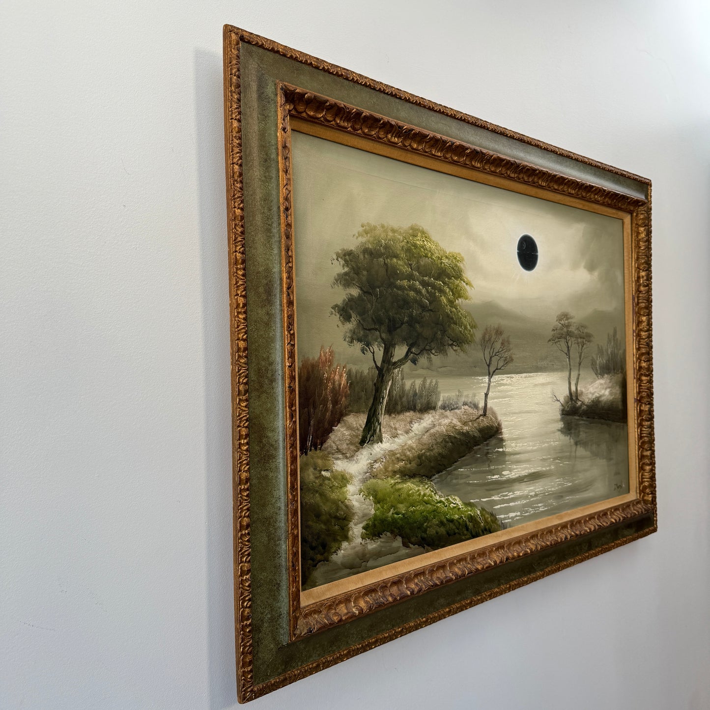 The original painting was collected locally in Ontario and is signed J. Morel. He was born in 1911 in Edinborough, Scotland and was well known for his moon-lit paintings. The painting had a lot of nicotine damage, so I had to give it a good clean before the eclipse could move across the moon. The frame is of good quality so very sturdy, but has some damage which adds to the charm... the trim is nicotine stained so I am keen to repaint that part of the frame but am going to leave that for a little bit and can discuss that with you as the collector as to whether you'd like that or not.