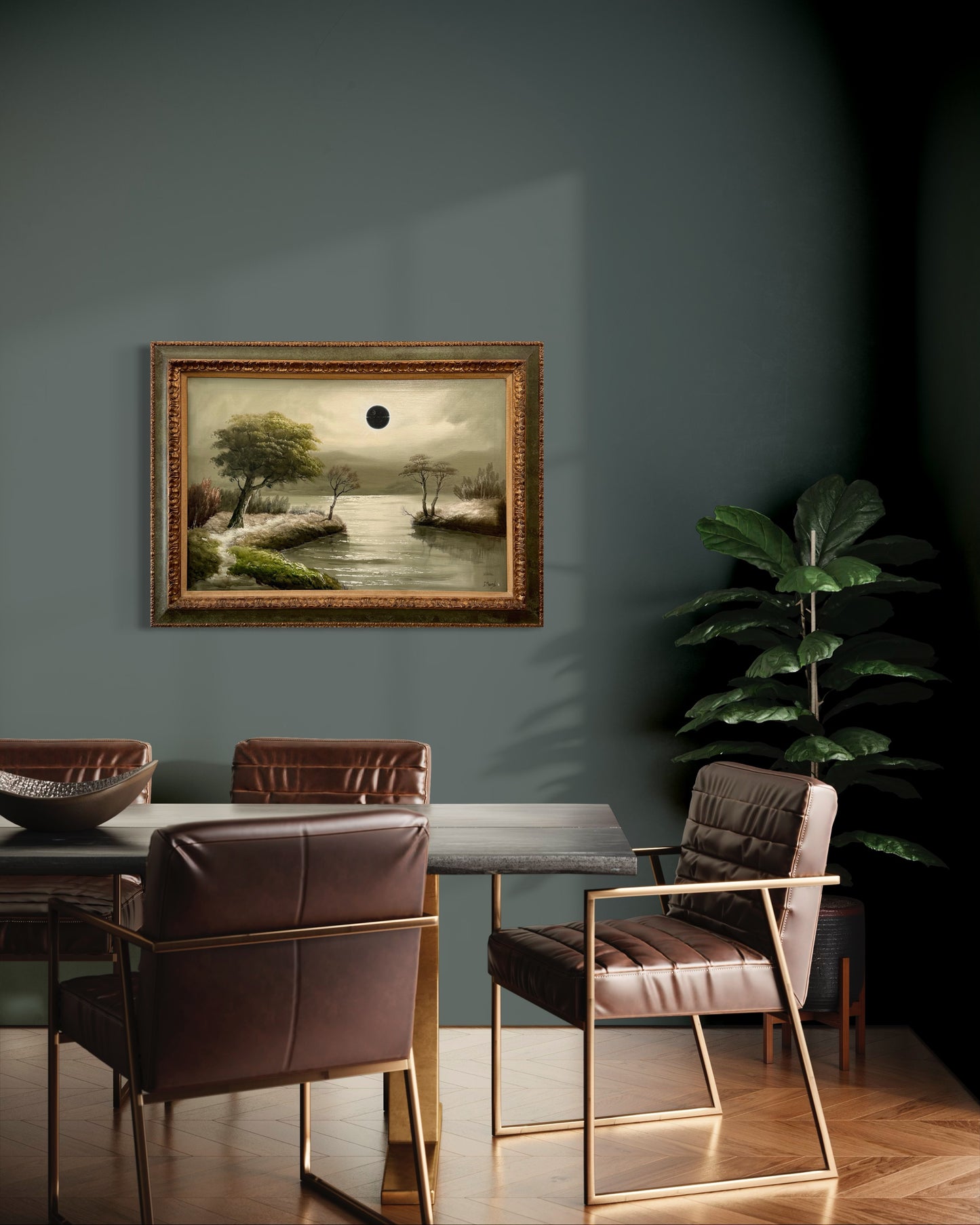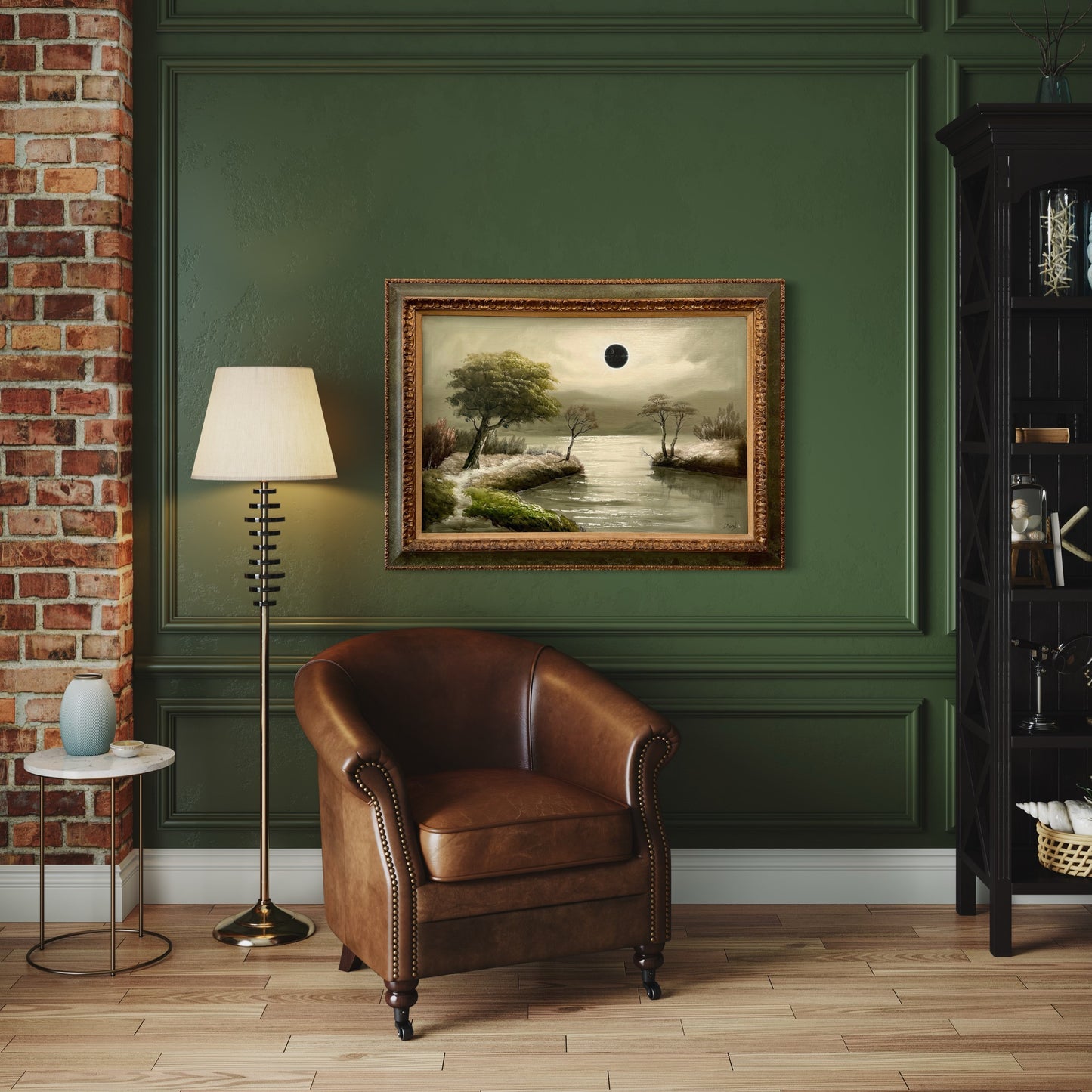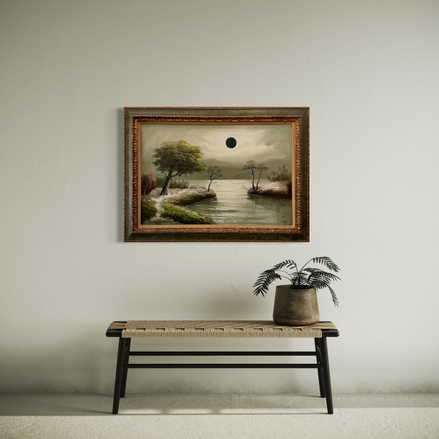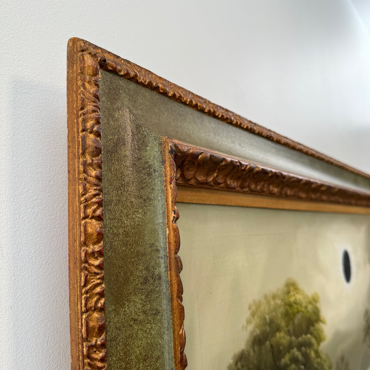 The original painting was collected locally in Ontario and is signed J. Morel. He was born in 1911 in Edinborough, Scotland and was well known for his moon-lit paintings. The painting had a lot of nicotine damage, so I had to give it a good clean before the eclipse could move across the moon. The frame is of good quality so very sturdy, but has some damage which adds to the charm... the trim is nicotine stained so I am keen to repaint that part of the frame but am going to leave that for a little bit and can discuss that with you as the collector as to whether you'd like that or not.