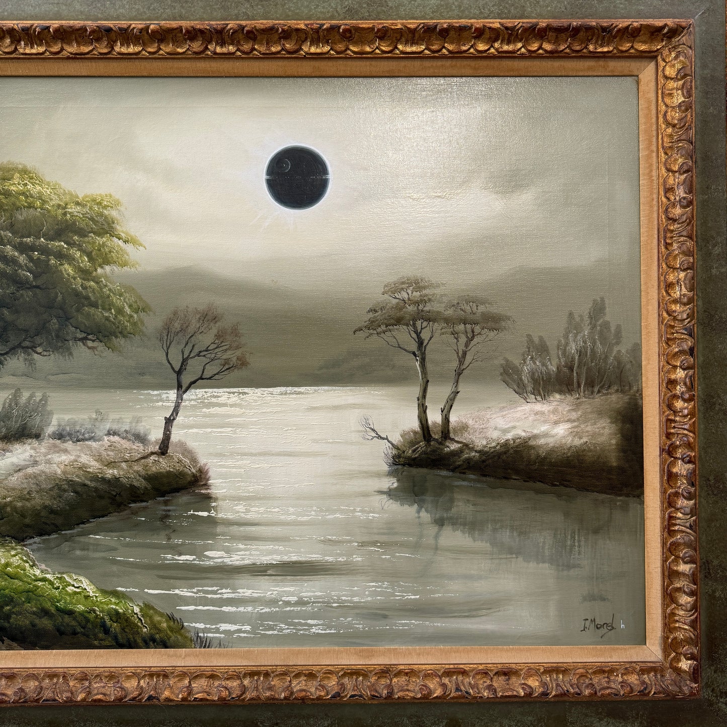 Throughout history artists have documented their culture, events, and history through their paintings. In our slice of time, many elements of our shared culture exist in a fictional and digital world. As an artist, I still want to capture my experiences by creating a tangible piece of art that gives those elements of our popular culture a place in our history. So with May the 4th fast approaching, I chose to paint the most ominous moon in fictional history into my painting, to illustrate both the solar eclipse, and this moment in time when imagining fictional realms has such a big place in our culture.