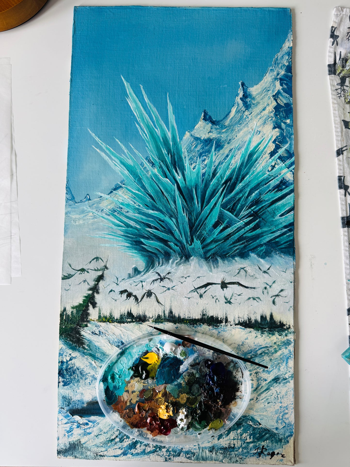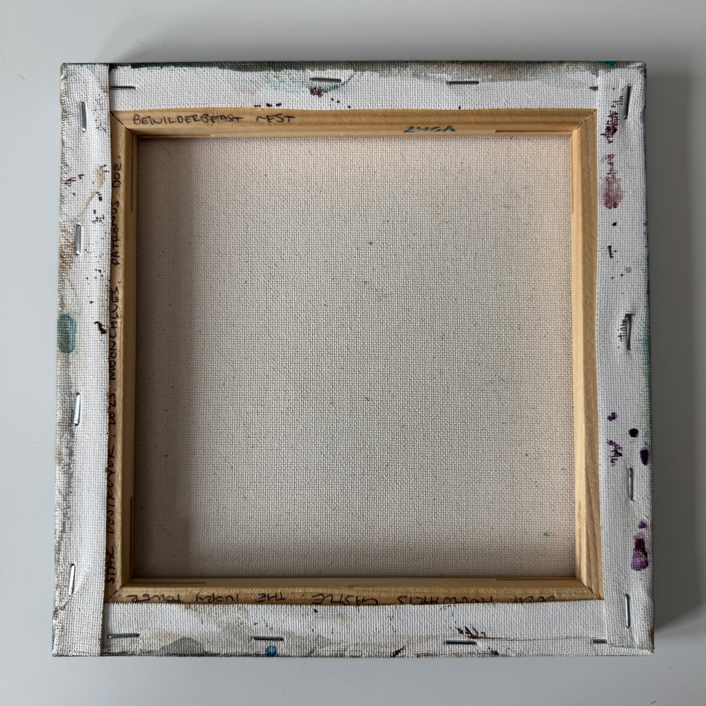 This is the little abstract came into being as I painted several fantasy artworks, including my latest bewilderbeast nest, my 2024 Altered Muggle Art collection, The School & Village, the Ivory Tower, "Lunar Bovinae" mooncalves, and "After All This Time" doe. So it has little bits of each of these artworks in it. I make notes on the back of the canvas of which paintings I was working on at the time. (I've left in the photos of this canvas from six months ago, the yellow/blue shade has been slowly painted over... and as I'm working it may continue to be used for cast off paint!)