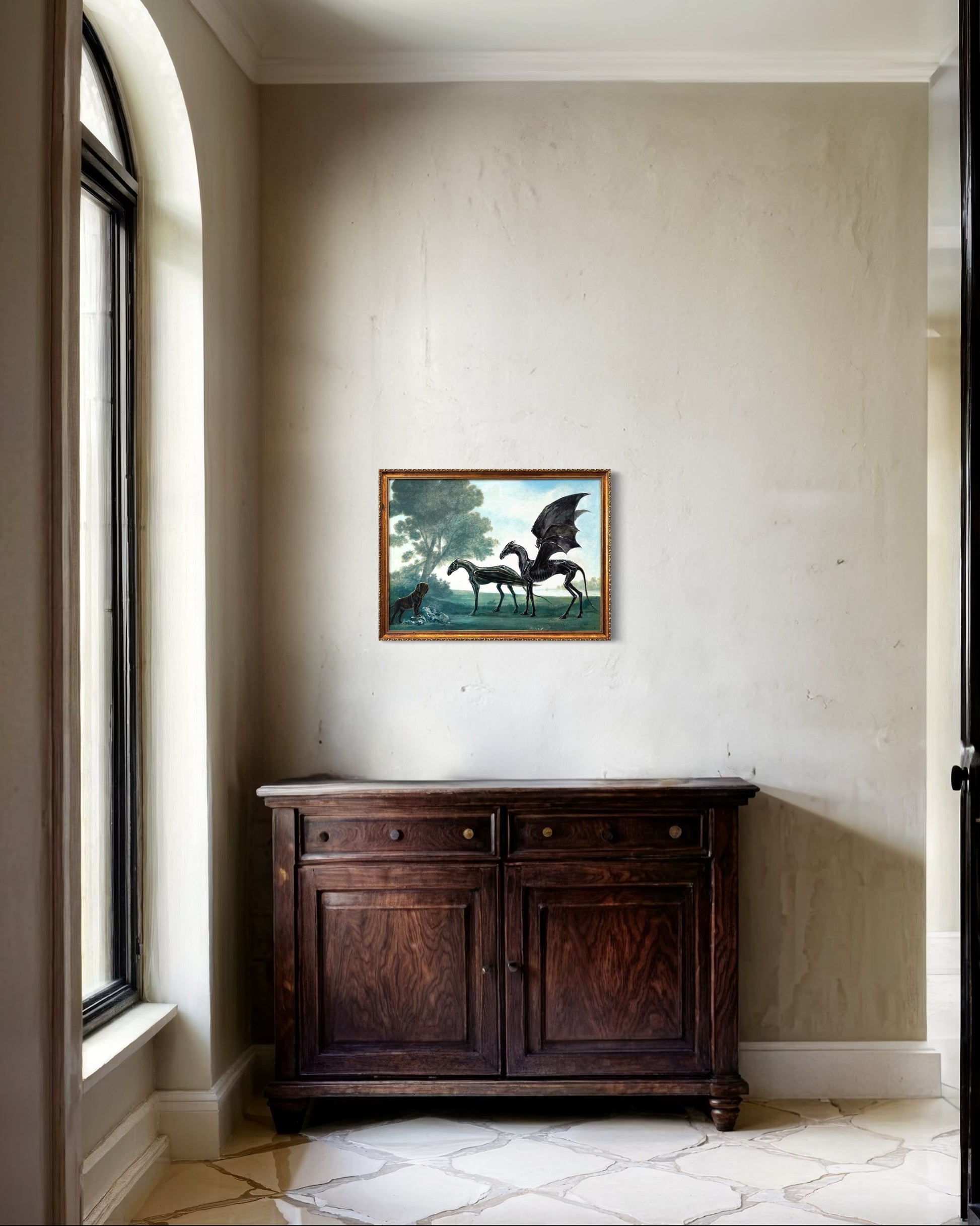 Original vintage art : This print is of the original horses and dog painting by master artist George Stubbs (1724 - 1806), who you'll discover if you do a quick search liked to paint horses... a lot! I collected this vintage print in Australia while on a holiday! It travelled all the way back home to Canada, so has made quite a journey already. The print and frame were produced c1980, and over the years it has slowly lost its vibrant colour due to sun and environmental damage. I decided to keep the original faded colours as it worked well with the ethereal feel of the thestrals. I cleaned and touched up parts where I felt it was necessary, but left left some scuffs and marks on the print as part of the vintage look.