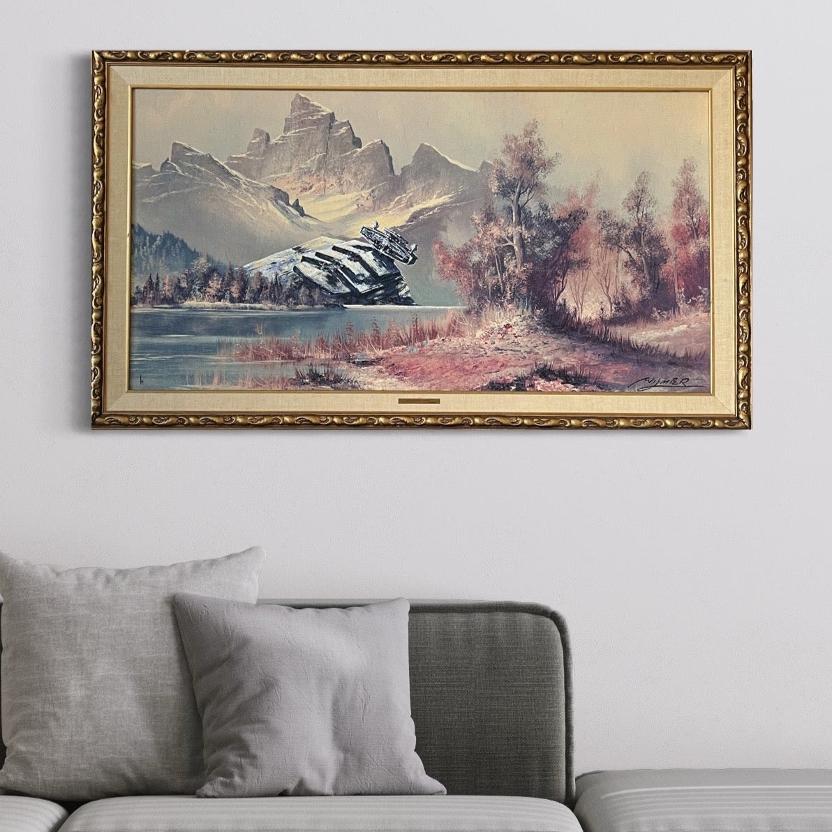 The muted blank space in the middle was just begging for a giant space ship to crash into it. I love how in the recent movies, the aftermath of the ships are just scattered on random planets… part of the landscape. Painting it into a vintage scene like this is my nod to the opening… “A long time ago, in a galaxy far, far away…” I kept the ship textured and worked with the style & palette of the original artist.