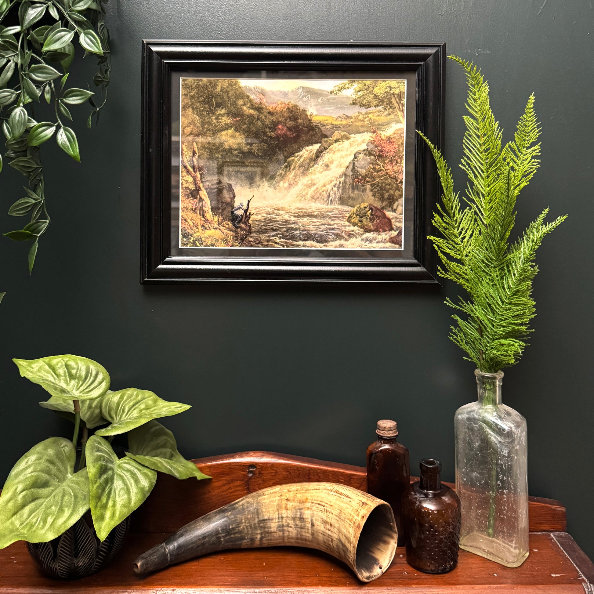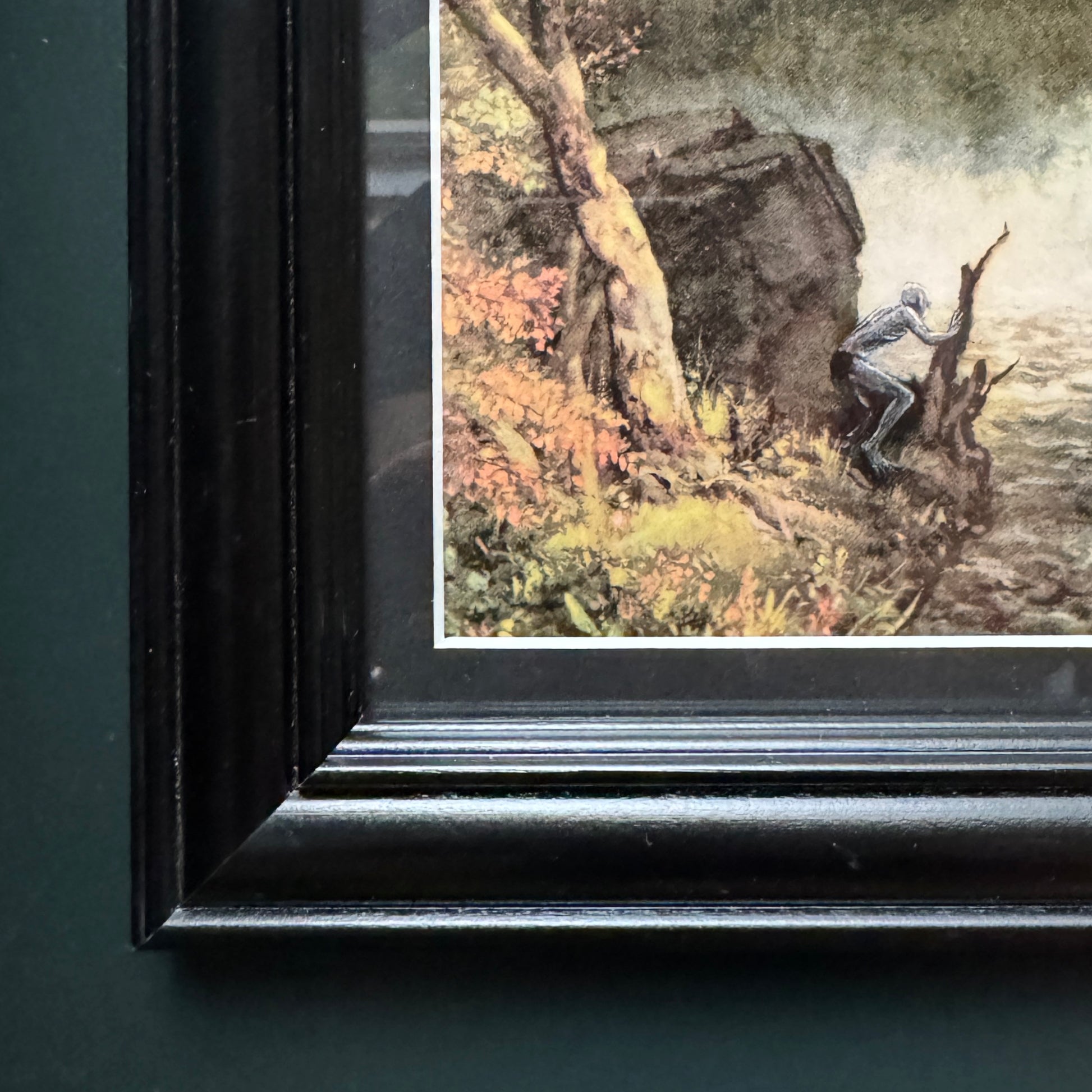 The original antique print (possibly by C.Gill 1864) was collected locally in Ontario. Paper print. The original matte has some watermarks on it, which I've left as I think it continues the idea that Gollum was always in this painting from long ago.