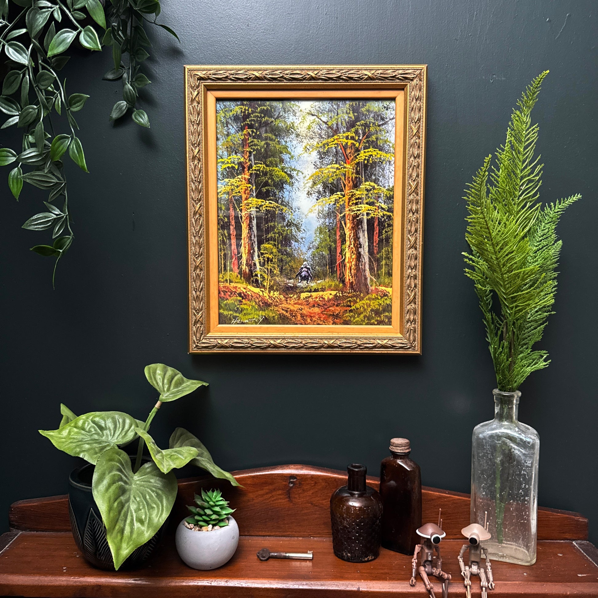 The original vintage painting by Hennessy was collected locally. It's a particularly nice vintage painting in that 70's landscape style, so I wanted what I added to be subtle and not distract from the beautiful, lush forest. It's in very good condition, and the frame has also been well cared for.