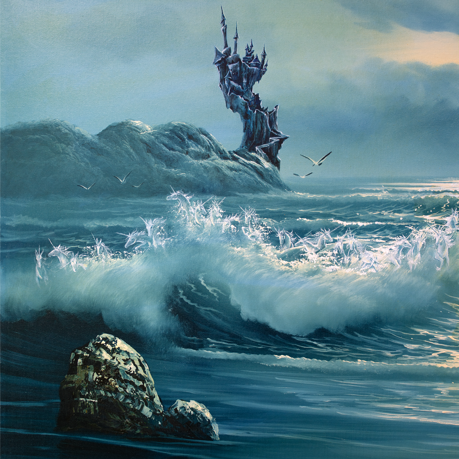 With this alteration, I wanted to capture that feeling King Haggard had when he looked on the unicorns he had the Red Bull capture for him. As I painted, I thought on the message that Peter Beagle was telling us in this fairytale... that humans have an insatiable desire to possess and control beautiful things. I kept the unicorns very subtle, because not everyone could see the unicorns... you have to look for them! There are 45 unicorns in this painting... because I turned 45 years old while painting them, so felt right in a mathy sort of way.