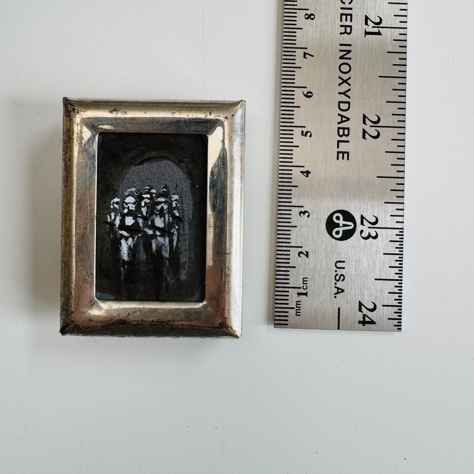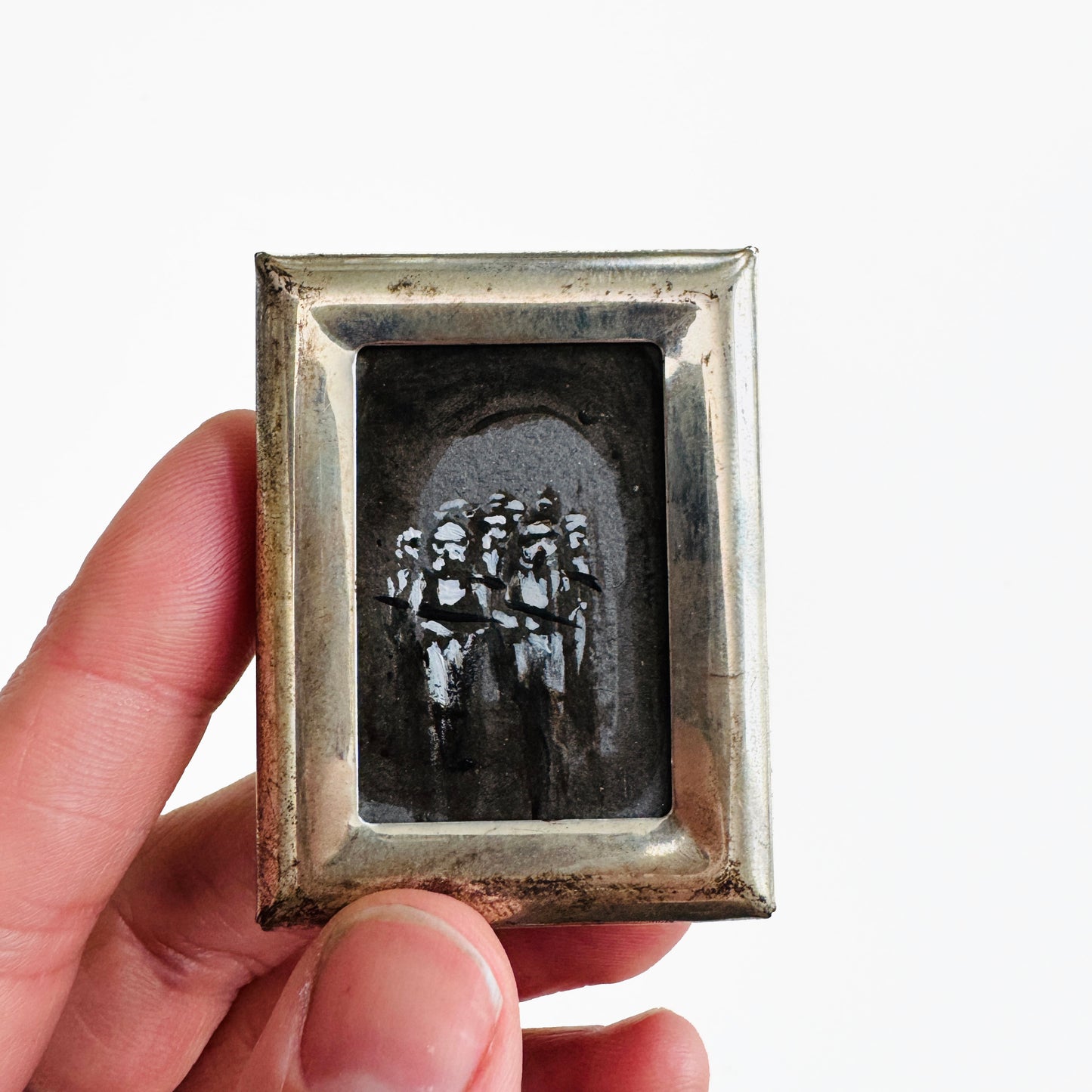 Painted in acrylic on vintage paper from a 60’s photo album. I had a couple tiny silver frames which had tarnished, perfect for a battered look for these tiny paintings.
